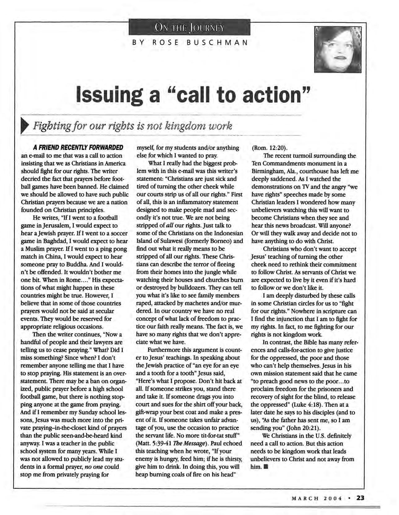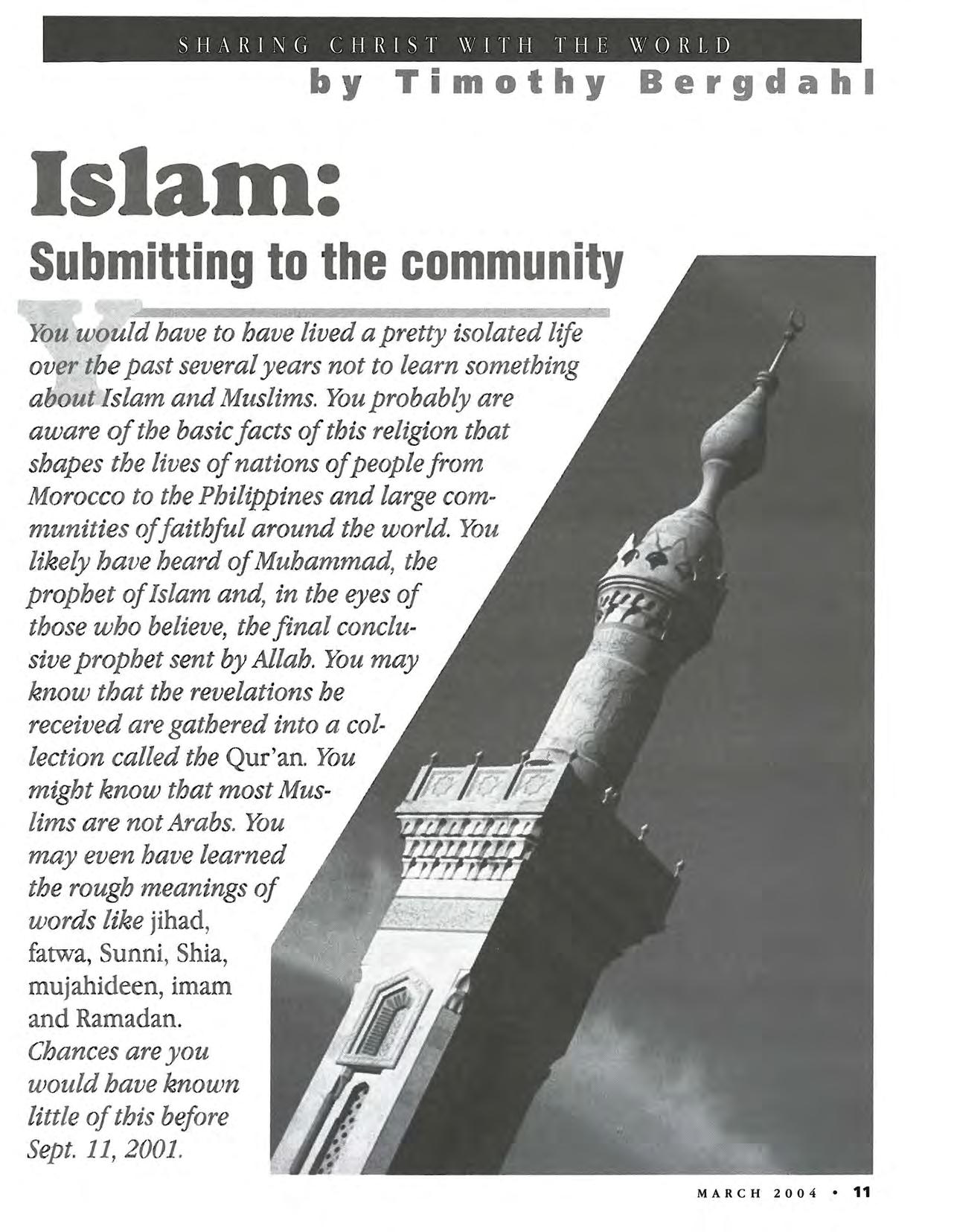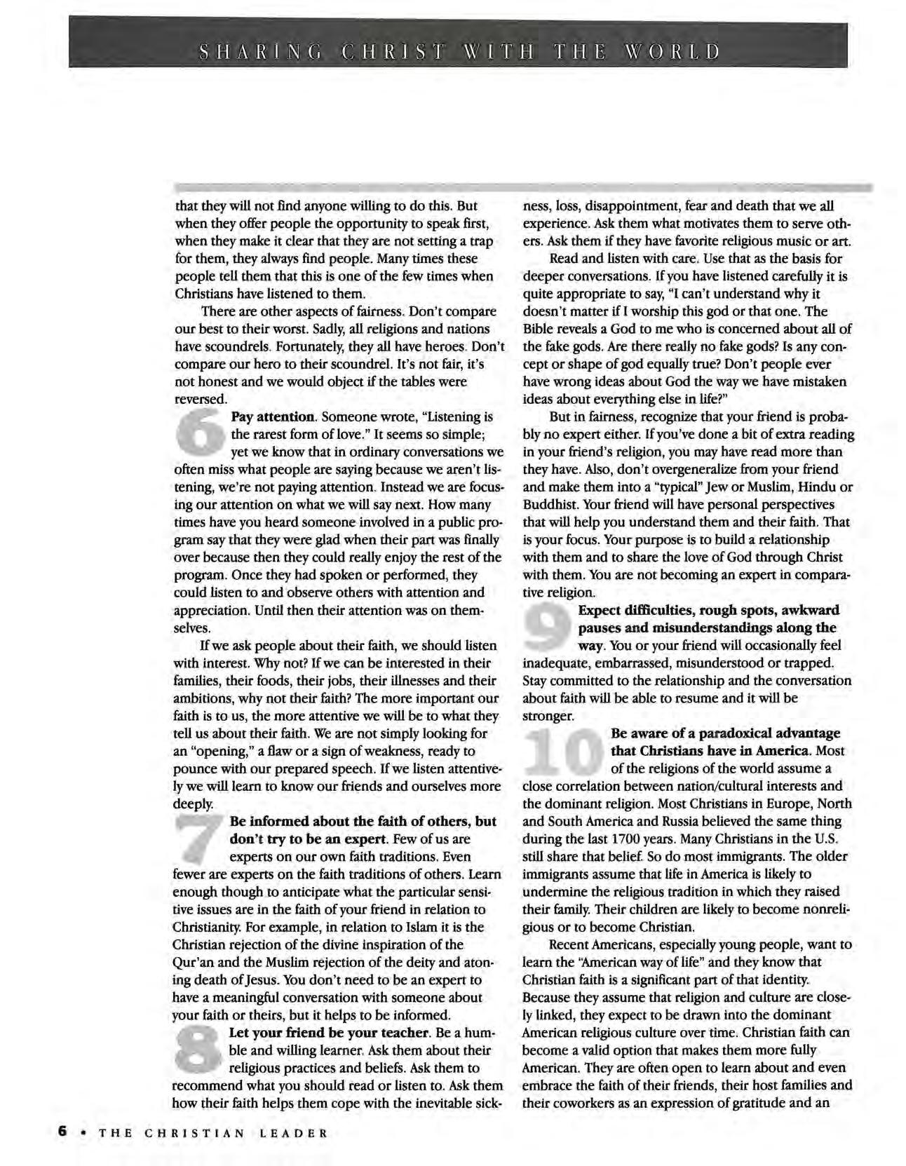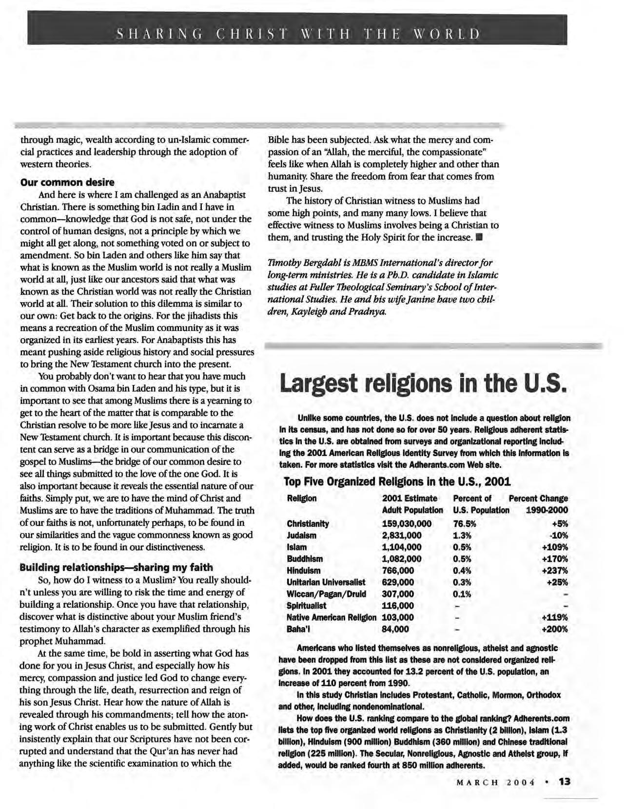 The confession also says that we will "treat people of other faiths and philosophies with respect, but lovingly and urgently proclaim Christ. ... " Our country is home to people who have immigrated from other countries and other internationals who live here temporarily. We have an opportunity to share our faith with these people and to plant a kingdom seed in their lives. The first feature article by James Pankratz offers some practical suggestions for how to follow Jesus' model for witnessing It is followed by stories and reflections from individuals who share their faith on a regular basis with individuals who follow Islam, Buddhism and Hinduism.