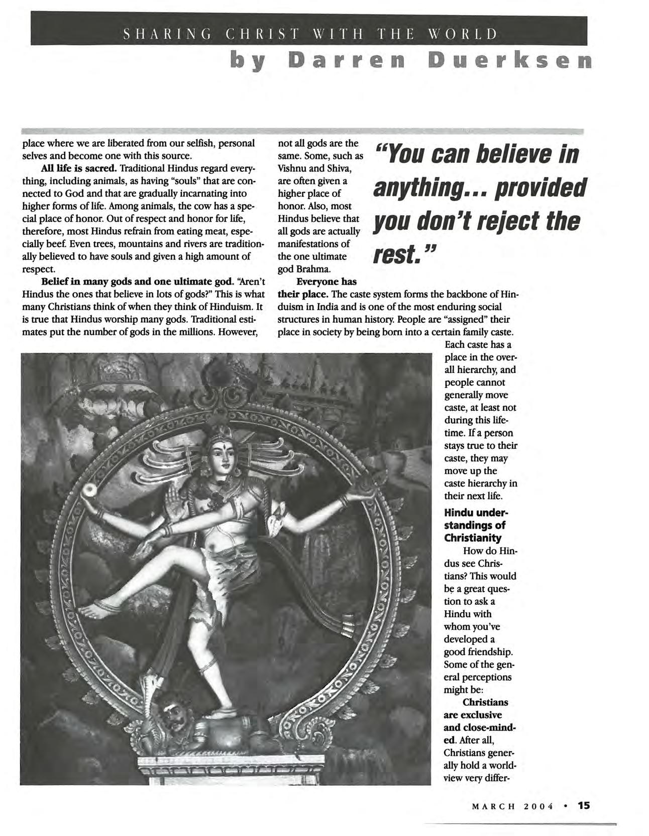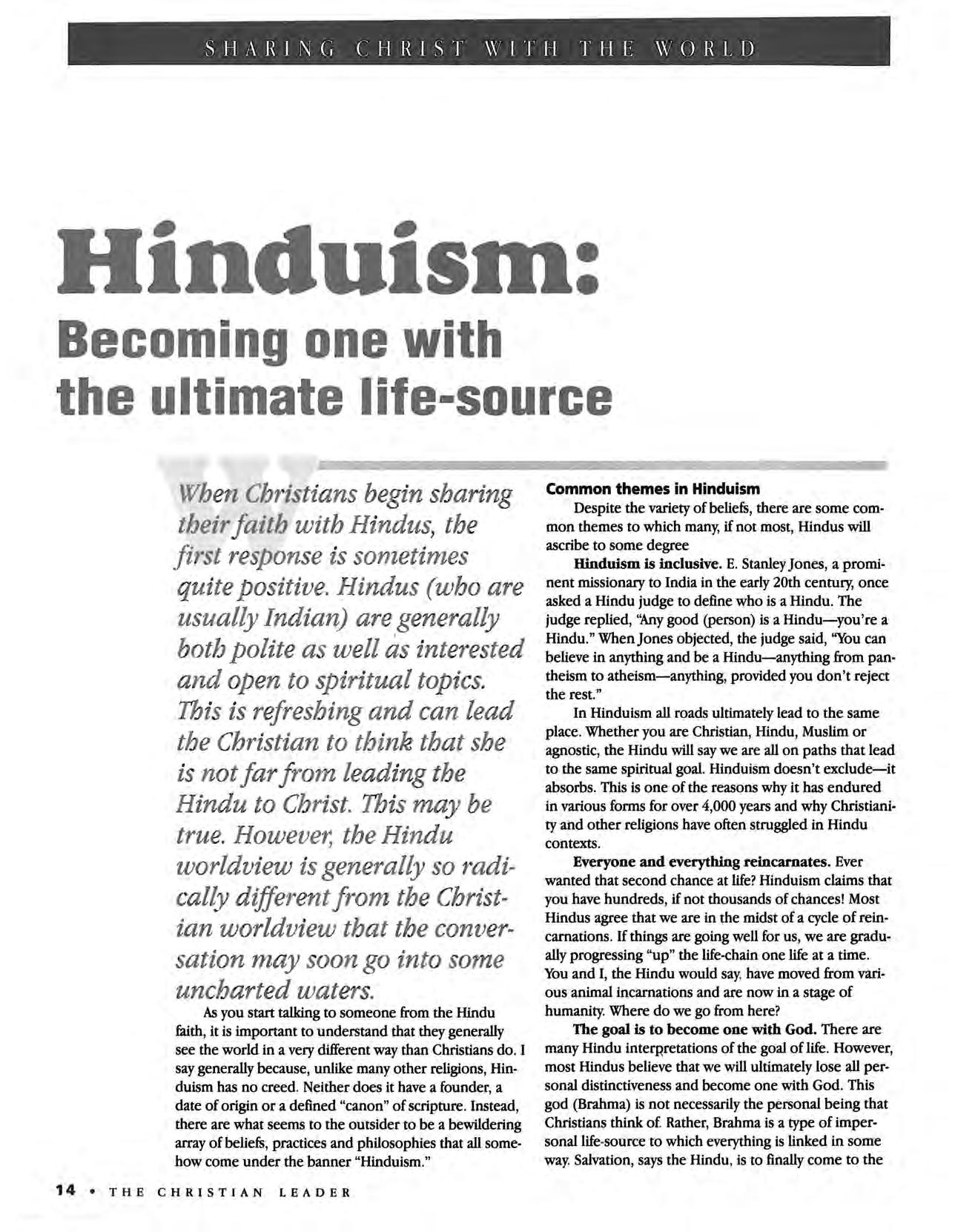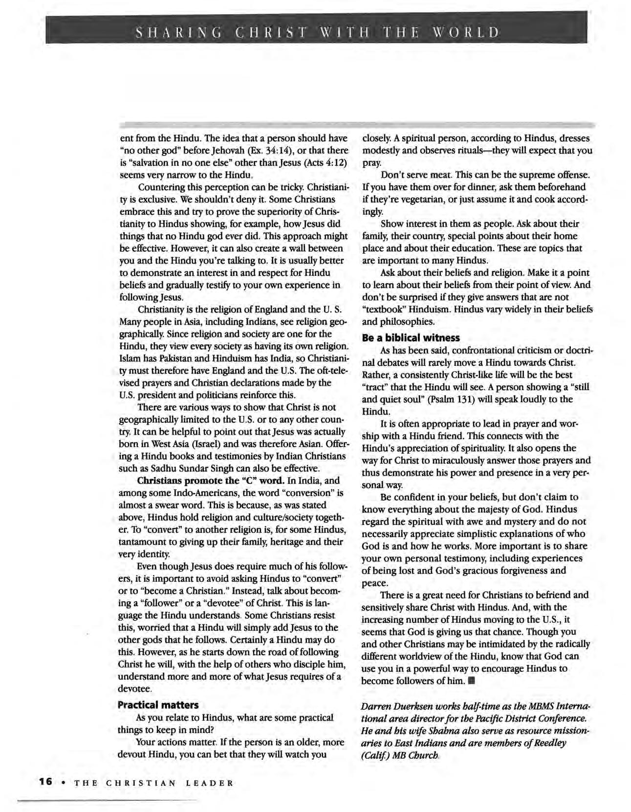 How do I w itness to a Hindu when his worldview is radically different from mine? By confidently sharing my faith and trusting God to use my actions and words to his glory. BY