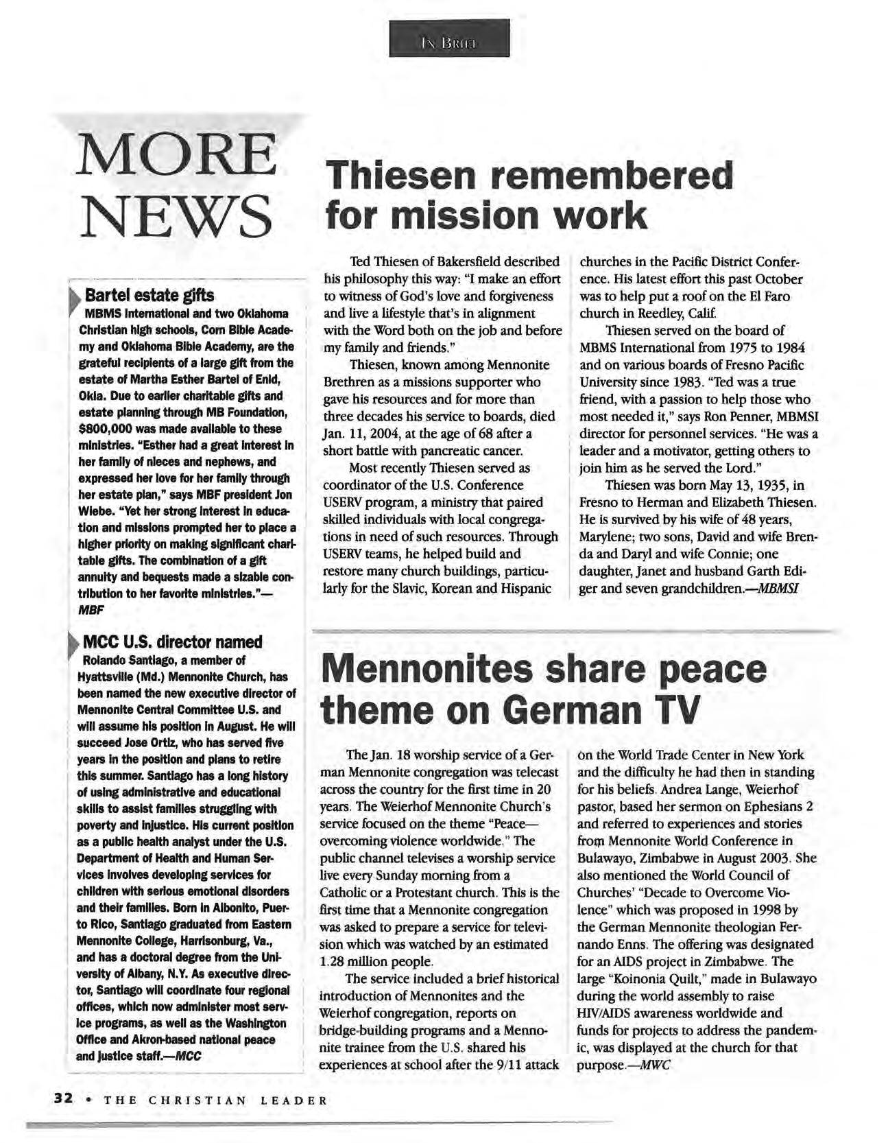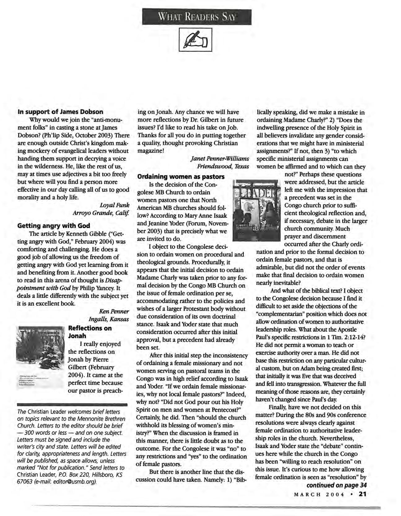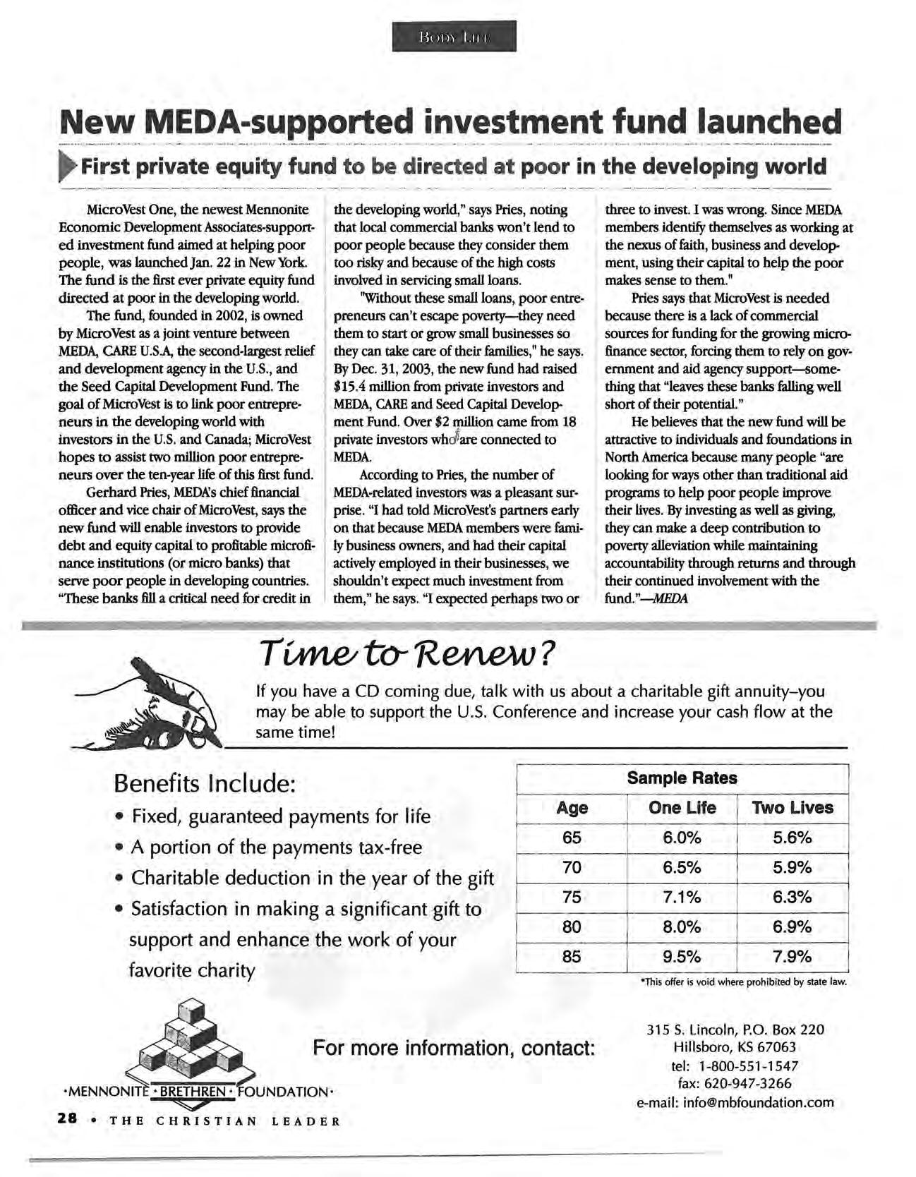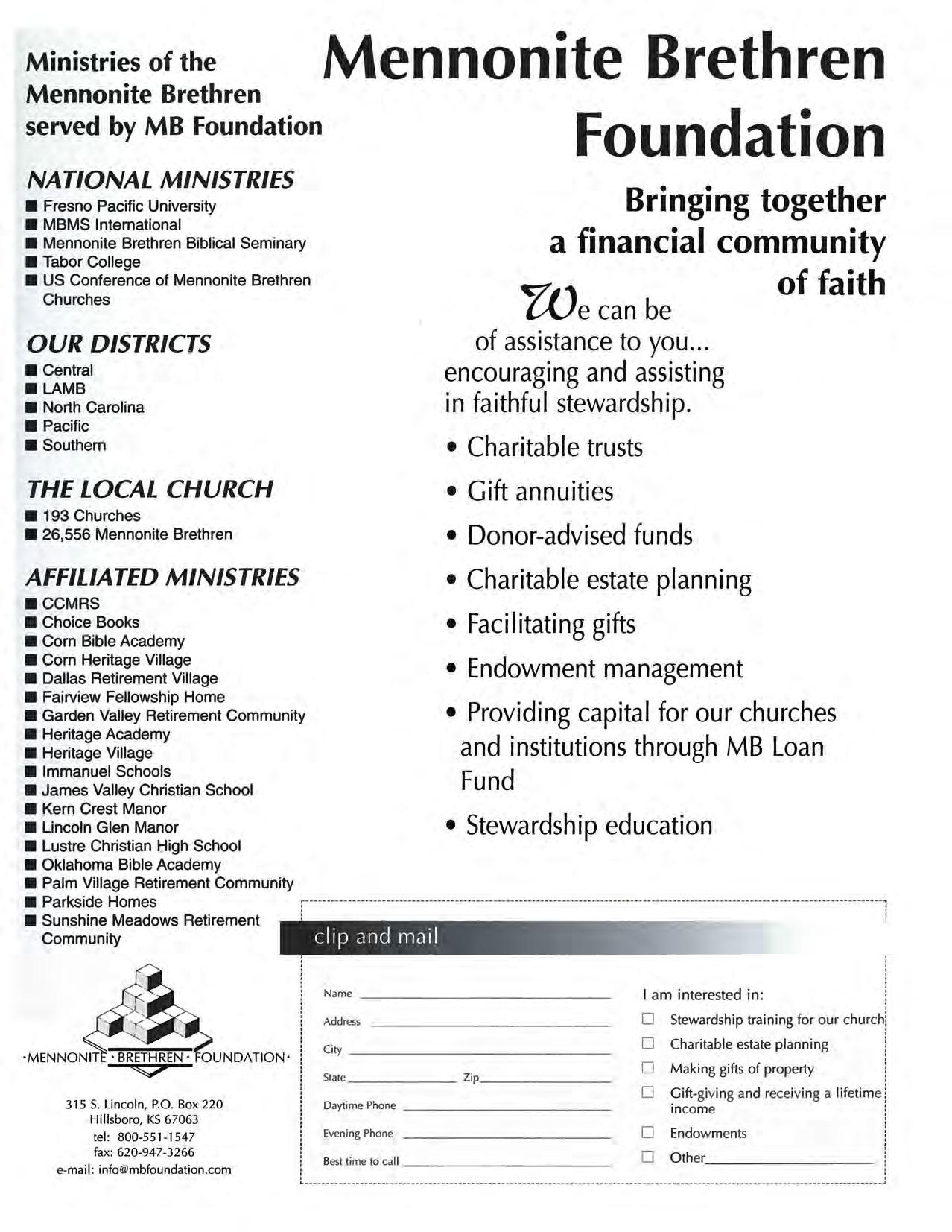 COMMUNICATION: All correspondence, including change of address, should be addressed to the Christian Leader, Box 220, Hillsboro, KS 67063. Phone: (620)947-5543. Fax: (620)947-3266 E-mail: christianleader@usmb.org.