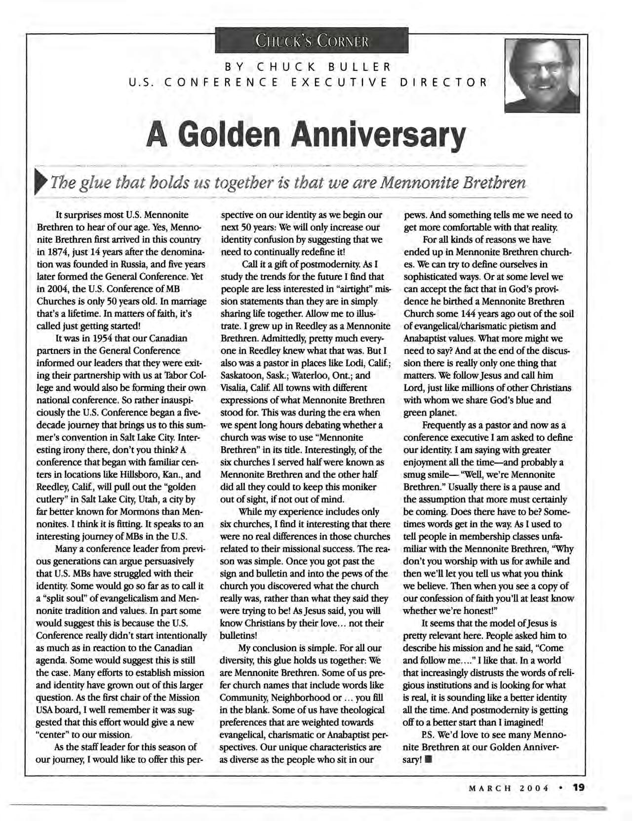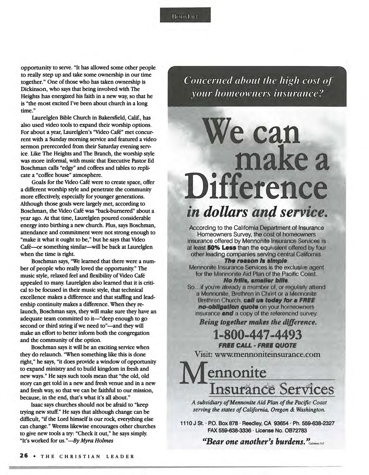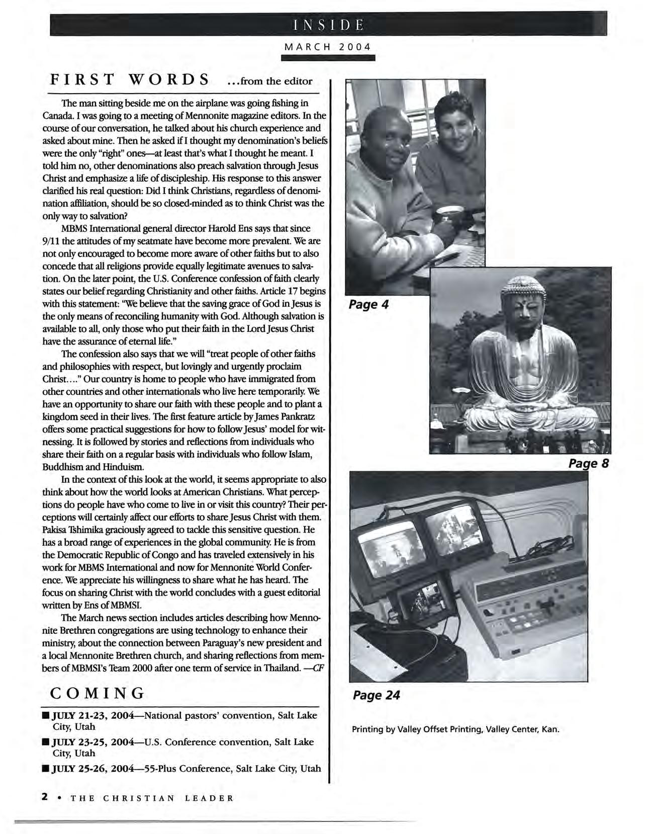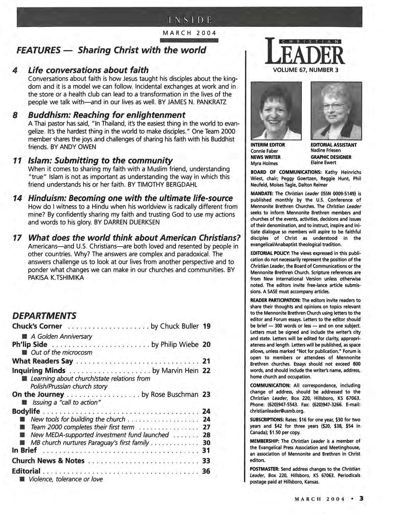 MANDATE: The Christian Leader (lSSN 0009-5149) is published monthly by the U S. Conference of Mennonite Brethren Churches The Christian Leader seeks to inform Mennonite Brethren members and churches of the events, activities, decisions and issues of their denomination, and to instruct, inspire and initiate dialogue so members will aspire to be faithful disciples of Christ as understood in the evangelical/Anabaptist theological tradition