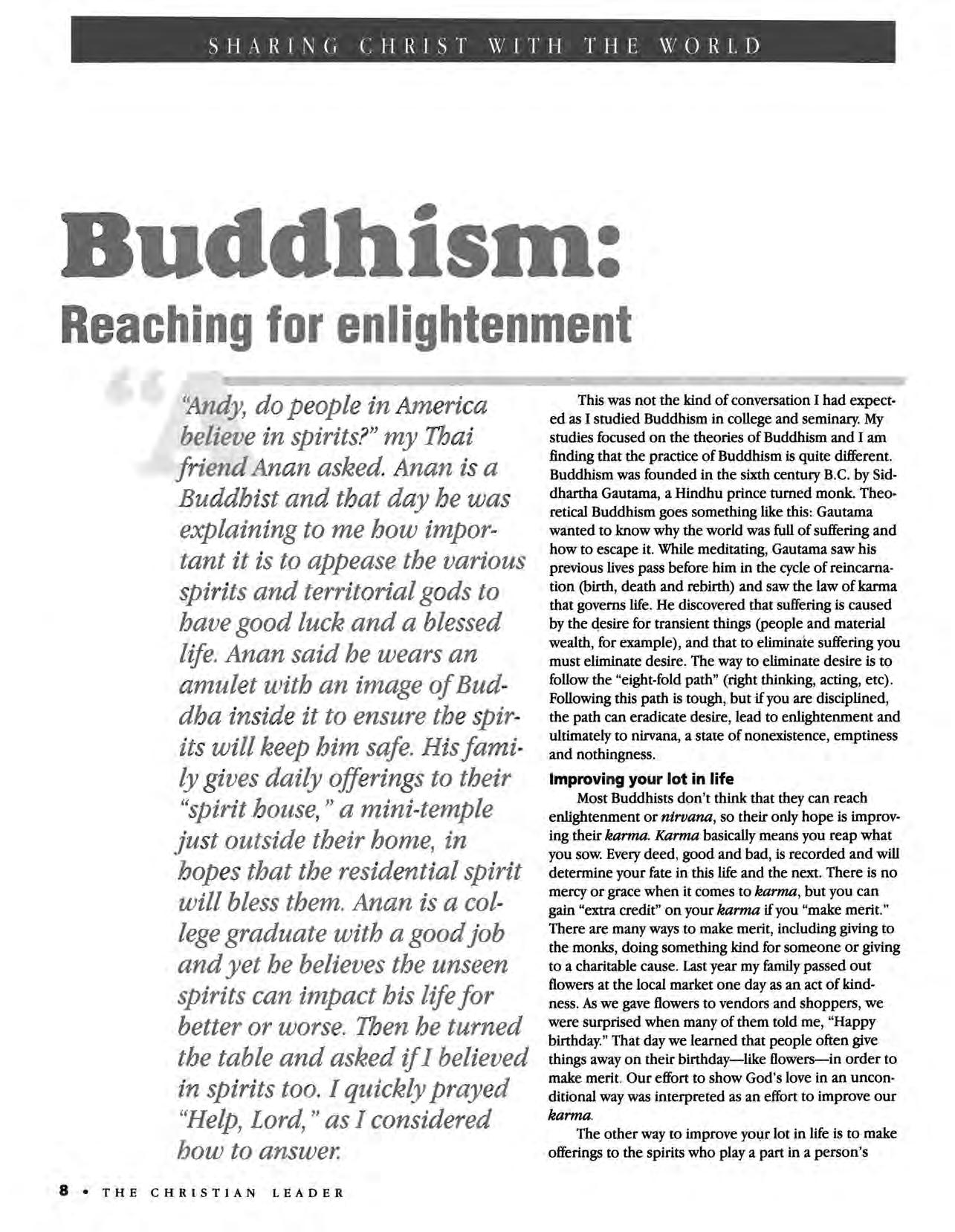 f}indy, do people in America believe in spirits?" my Thai friend Anan asked. Anan is a Buddhist and that day he was explaining to me how important it is to appease the various spirits and territorial gods to have good luck and a blessed life. Anan said he wears an anlulet with an image of Buddha inside it to ensure the spirits will keep him safe. His family gives daily offerings to their "spirit house, " a mini-temple just outside their home, in hopes that the residential spirit uJill bless them. Anan is a college graduate with a good job and yet he believes the unseen spirits can i111pact his life for better or worse. Then he turned the table and asked ifI believed in spirits too . I quickly prayed "Help, Lord," as I considered how to answer.