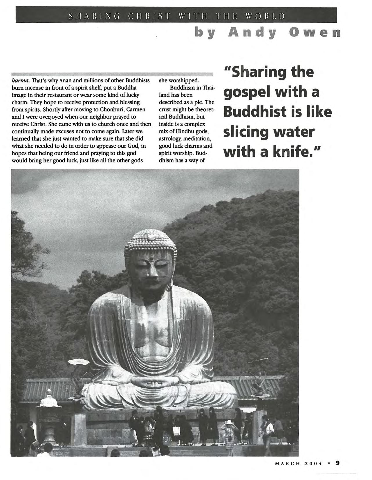 A Thai pastor has said, "In Thailand, it's the easiest thing in the world to evangelize . It's the hardest thing in the world to make disciples." One Team 2000 member shares the joys and challenges of sharing his faith with his Buddhist friends. BY