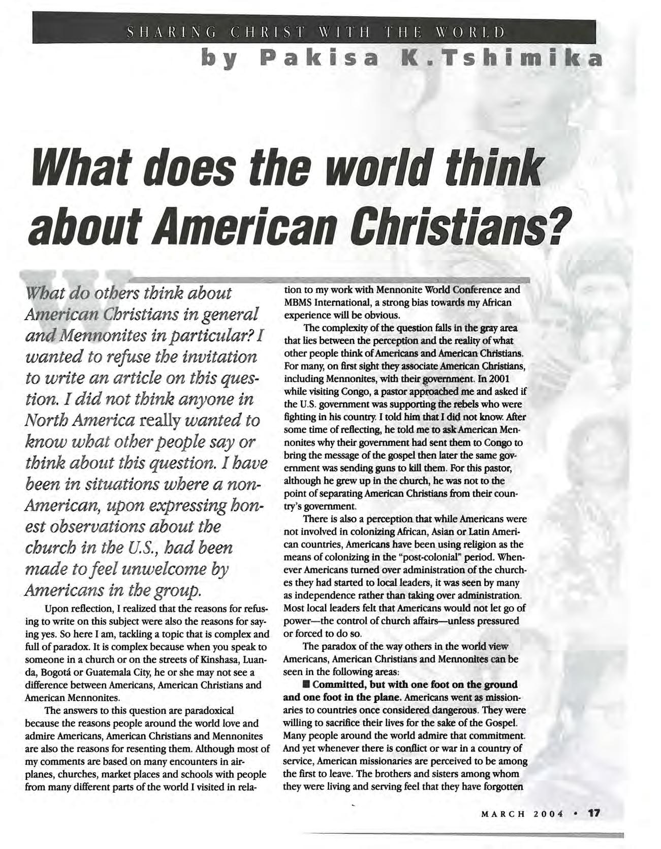 In the context of this look at the world, it seems appropriate to also think about how the world looks at American Christians What perceptions do people have who come to live in or visit this country? Their perceptions will certainly affect our efforts to share Jesus Christ with them. Pakisa 1Shimika graciously agreed to tackle this sensitive question. He has a broad range of experiences in the global community. He is from the Democratic Republic of Congo and has traveled extensively in his work for MBMS International and now for Mennonite World Conference. We appreciate his willingness to share what he has heard. The focus on sharing Christ with the world concludes with a guest editorial written by Ens of MBMSI