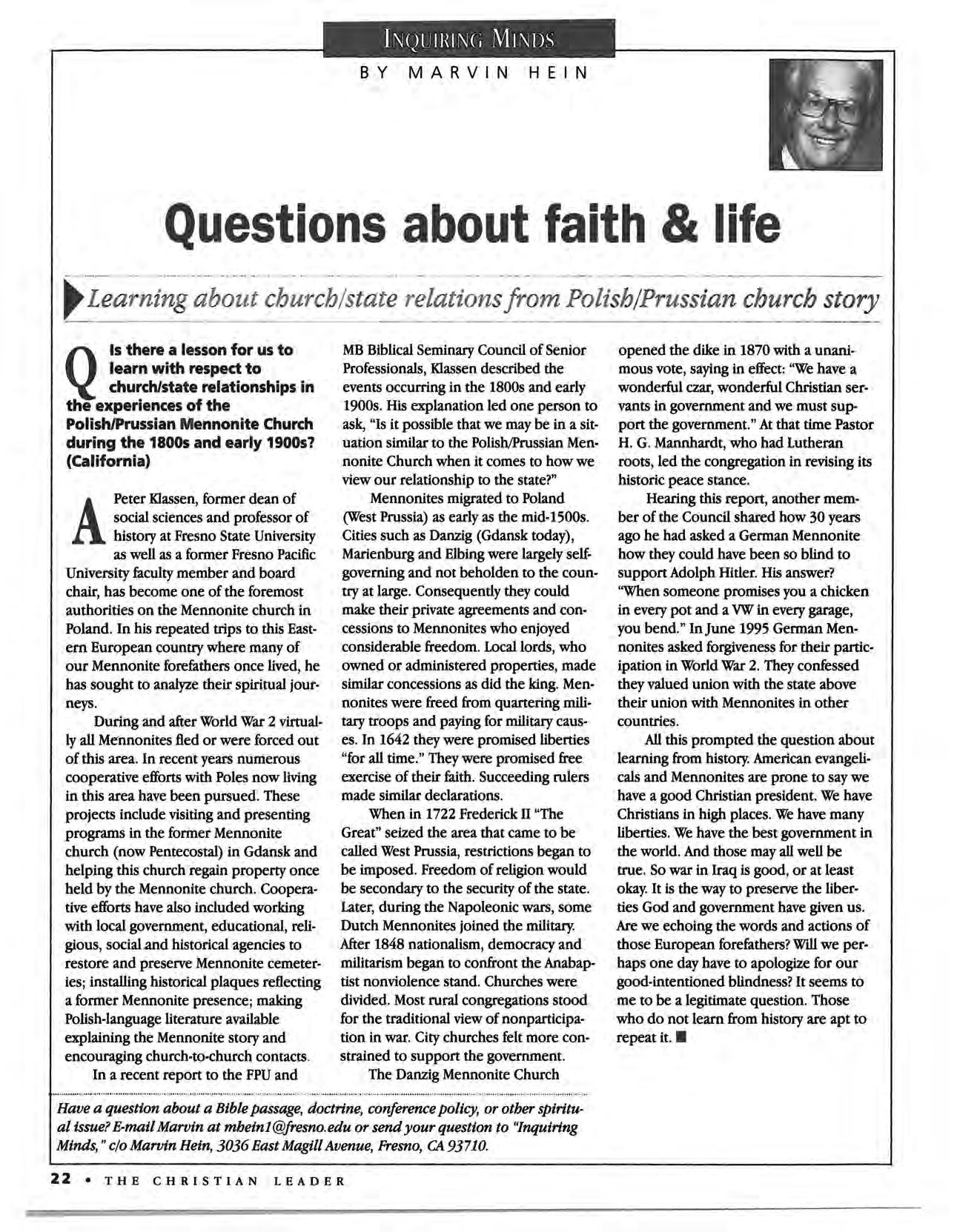 POSTMASTER: Send address changes to the Christian Leader, Box 220, Hillsboro, KS 67063 Periodicals postage paid at Hillsboro, Kansas.