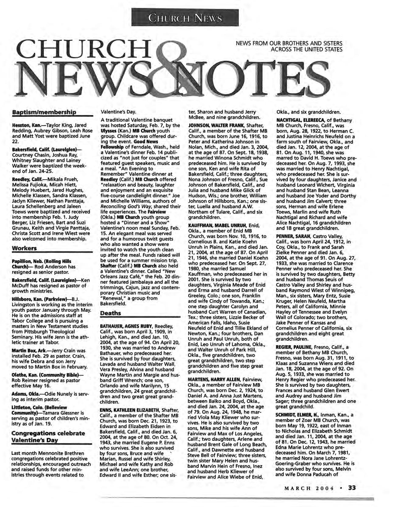 Okla., and six grandchildren. NACHTIGAL ELEREECA. of Bethany MB Church, Fresno, Calif., was born, Aug. 28,1922, to Herman C. and Justina Heinrichs Neufeld on a farm south of Fairview, Okla , and died Jan. 12, 2004, at the age of 81. On Aug 11, 1940, she was marred to David H. Toews who predeceased her On Aug. 7, 1993, she was married to Henry Nachtigal, who predeceased her She is survived by four daughters, Janice and husband leonard Wichert, Virginia and husband Stan Bean, leanna and husband Joe Yoder and Dorthy and husband Jim Calvert; three sons, Herman and wife Erlene Toews, Marlin and wife Ruth Nachtigal and Richard and wife Alice Nachtigal, 16 grandchildren and 18 great grandchildren PENNER, SARAH, Castro Valley, Calif., was born April 24, 1912, in Coy, Okla., to Frank and Sarah Zielke Penner and died Jan. 6, 2004, at the age of 91. On Aug. 27, 1933, she was married to Penner who predeceased her She is survived by two daughters, Betty and husband Thomas Seuis of Castro Valley and Shirley and husband Raymond Wiest of Winnipeg, Man., six sisters, Mary Entz, Susie Kruger, Helen Neufeld, Martha Peters, all of California, Minnie Hayley of Tennessee and Evelyn Wall of Colorado; two brothers, Jake Penner of Kansas and Cornelius Penner of California, six grandchildren and eight great grandchildren