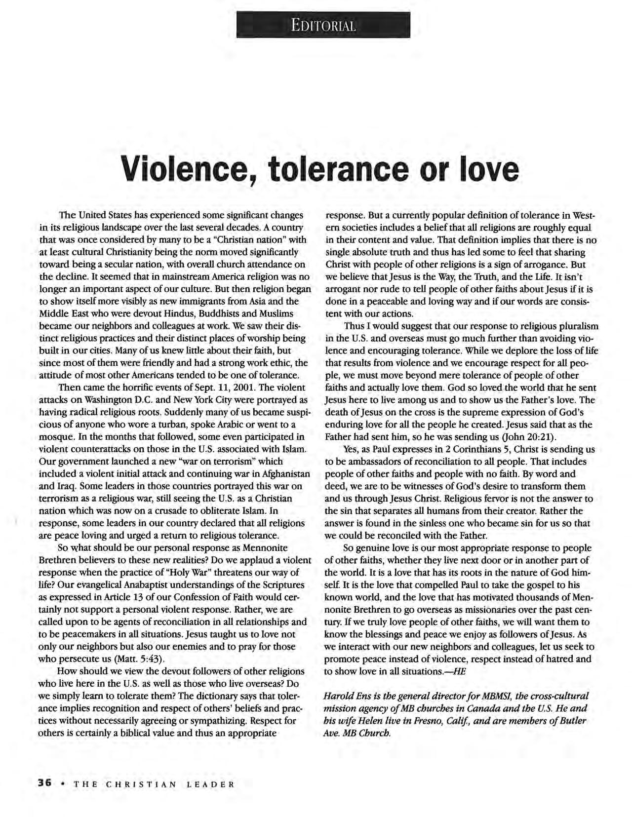So genuine love is our most appropriate response to people of other faiths, whether they live next door or in another part of the world. It is a love that has its roots in the nature of God himself It is the love that compelled Paul to take the gospel to his known world, and the love that has motivated thousands of Mennonite Brethren to go overseas as missionaries over the past century. If we truly love people of other faiths, we will want them to know the blessings and peace we enjoy as followers of Jesus. As we interact with our new neighbors and colleagues, let us seek to promote peace instead of violence, respect instead of hatred and to show love in all situations.-HE