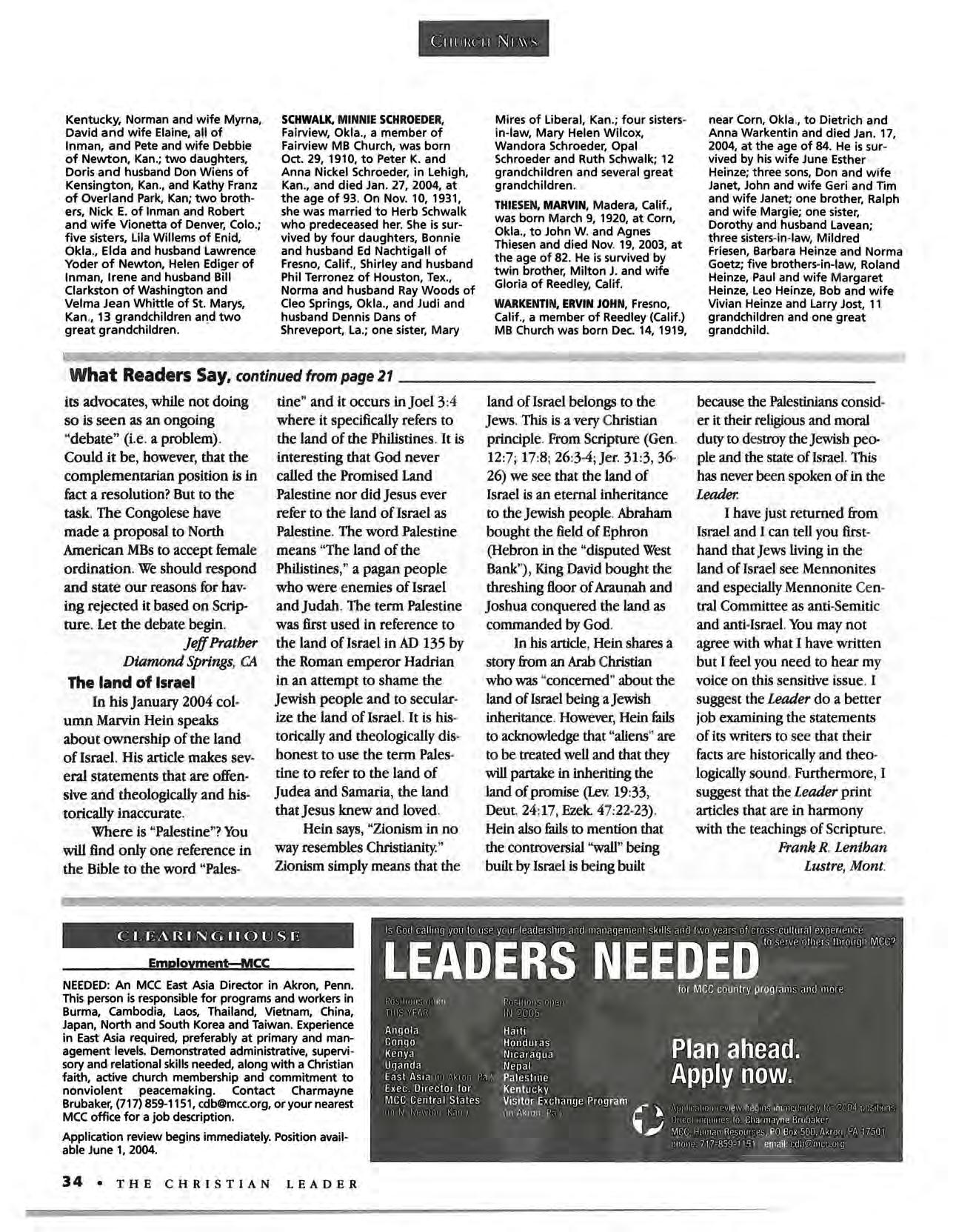 I have just returned from Israel and I can tell you firsthand that Jews living in the land of Israel see Mennonites and espedally Mennonite Ce ntral Committee as anti-Semitic and anti-Israel. You may not agree with what I have written but I feel you need to hear my voice on this sensitive issue I suggest the Leader do a better job examining the statements of its writers to see that their facts are historically and theologically sound Furthernlore, I suggest that the Leader print articles that are in harmony with the teachings of Scripture. Frank R. Lenthan Lustre, Mont