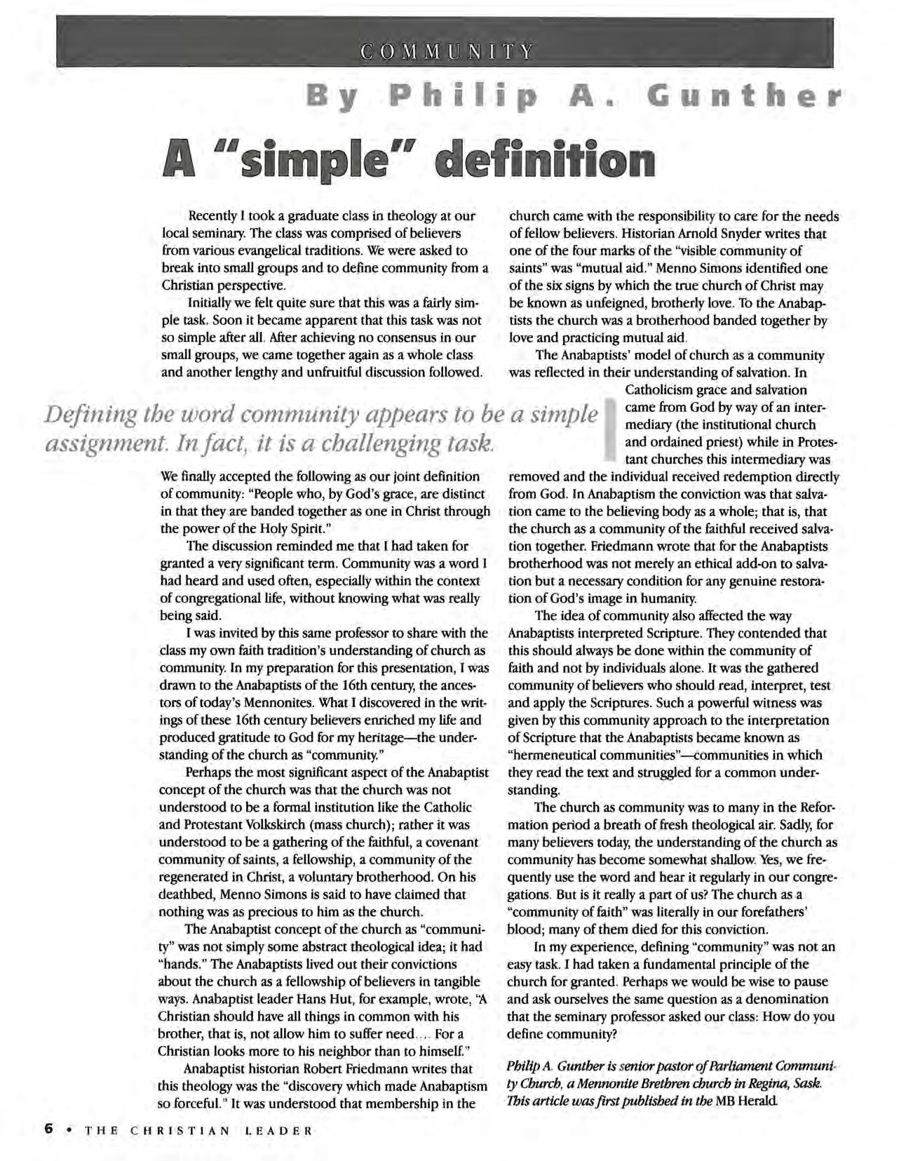 This issue of the Leader invites us to rethink what it means for a congregation to be a community of faith. As part of the Anabaptist tradition, we Mennonite Brethren have an understanding of the church that is unique among evangelicals. Writers Danette Baltzer Roland and Philip A. Gunther reflect on their renewed appreciation for this heritage. As Michelle Ferguson's story illustrates, this emphasis on covenant community is something for which many people today long. The feature section concludes with an article by Michelle Hershberger in which she reminds us that our communities of faith are healthiest when they are places that welcome newcomers As she reflects on why welcoming new faces is at times challenging, Hershberger concludes that we may need to reconsider our definition of community.