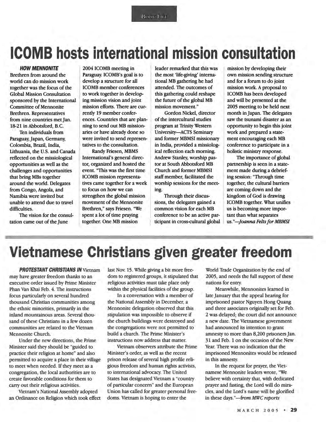 The relief efforts of many agencies were no doubt enhanced by the fact that many of us could literally picture the physical and emotional impact of the disaster. Unfortunately not every crisis gets as much press as this one did. In a February news release regarding the overwhelming response of constituents to the tsunami relief effort, MCC makes this request: "MCC now recommends contributing funds for other worthy projects, such as providing clean water in many parts of the world, supporting disadvantaged children seeking education, working for peace and reconciliation in areas of conflict, helping people with AIDS and fighting the causes of AIDS, and also for much other work supported by MCC's general fund." Let's take this gracious reminder to heart and be the body of Christ to the world.--CF