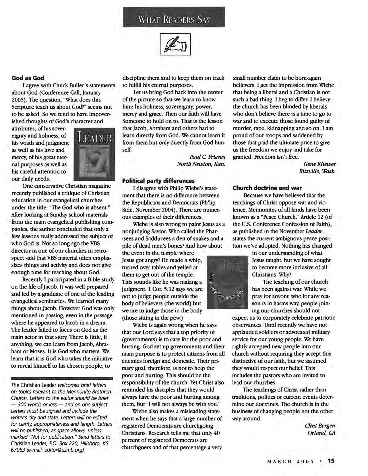 MANDATE: The Christian Leader (lSSN 0009 -5149) is published monthly by the U.S. Conference of Mennon ite Brethren Churches The Christian Leader seeks to inform Mennonite Brethren members and churches of the events, activities, decisions and issues of their denomination, and to instruct, inspire and initiate dialogue so members will aspire to be faithful disciples of Christ as understood in the evangelical/Anabaptist theological tradition.