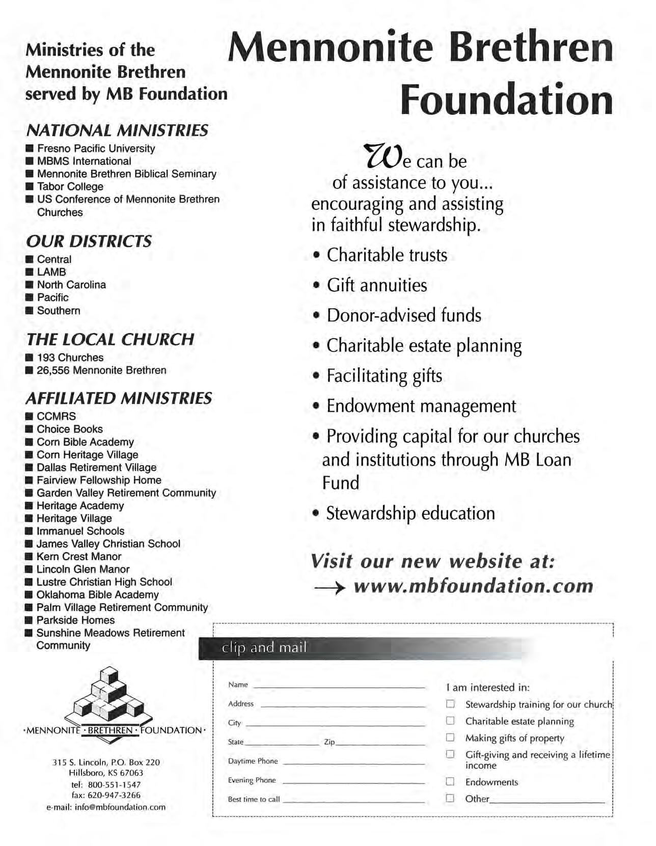 COMMUNICATION: All correspondence, including change of address, should be addressed to the Christian Leader, Box 220, Hillsboro, KS 67063. Phone : (620)947-5543. Fax: (620)947 -3266. E-mail : christianleader@usmb.org