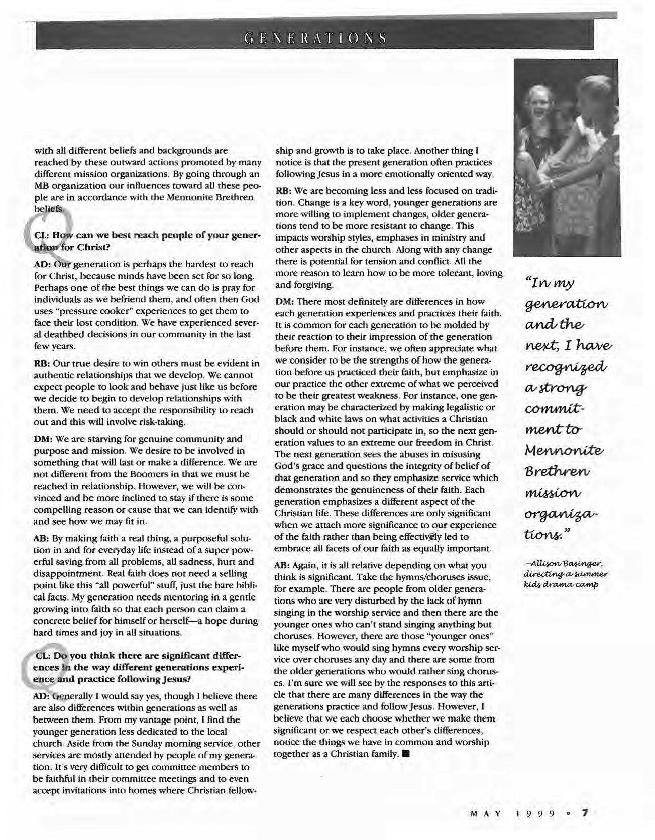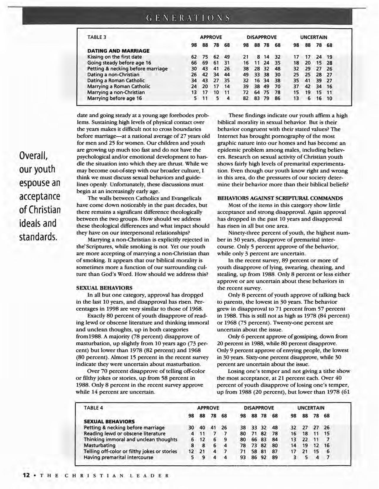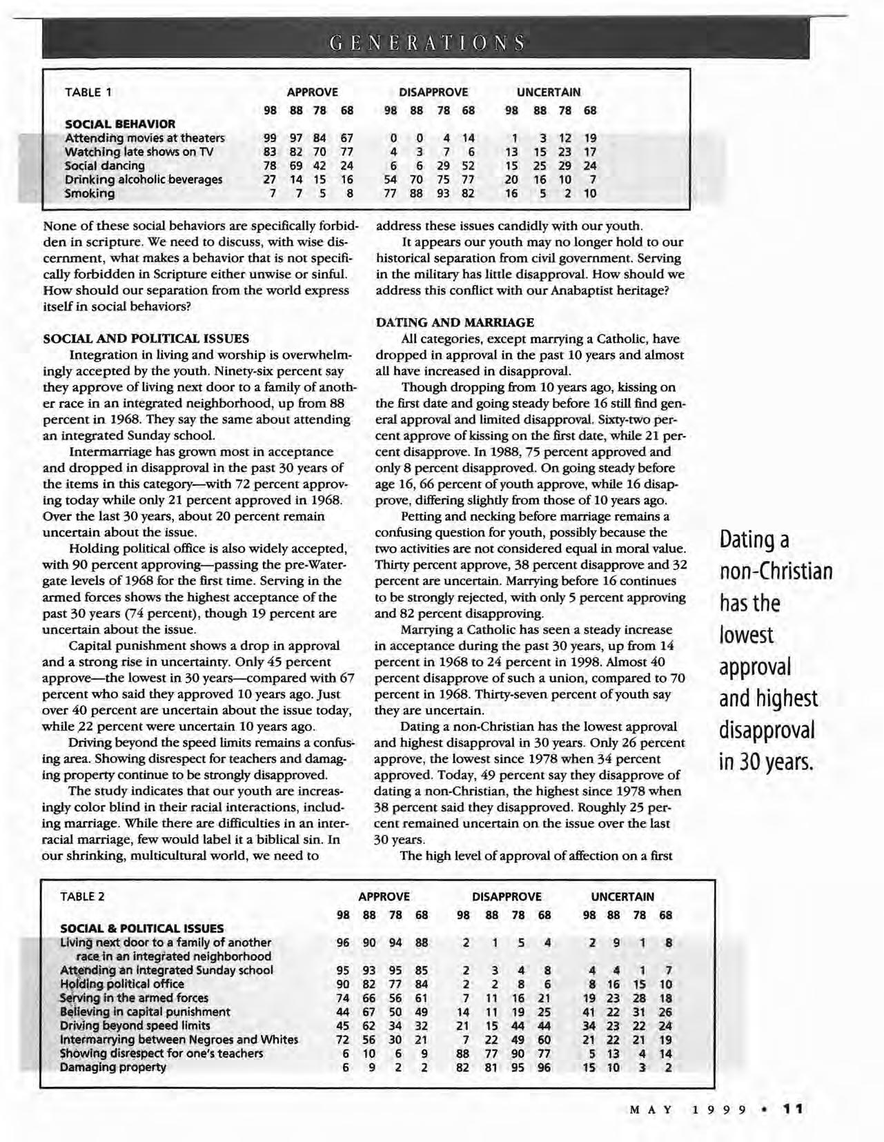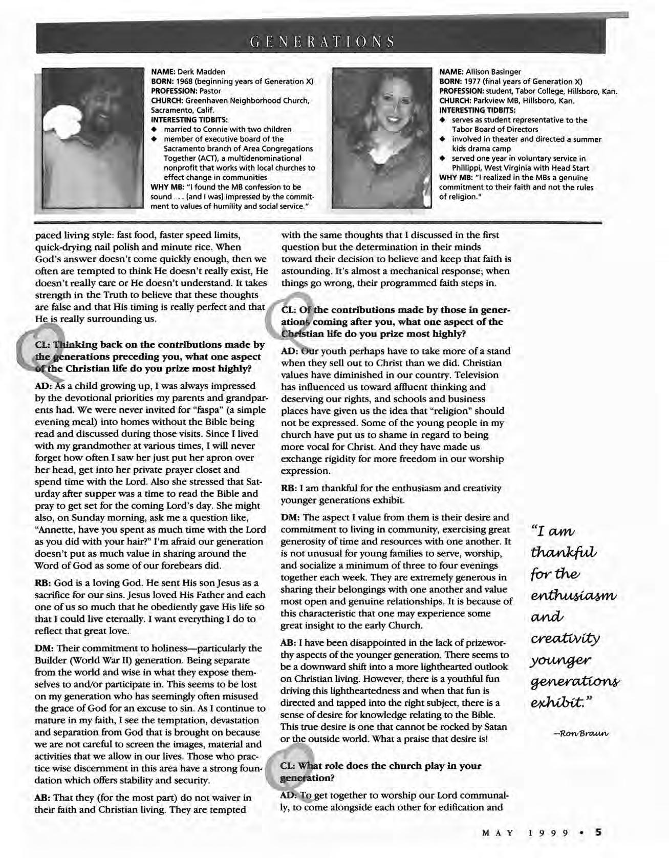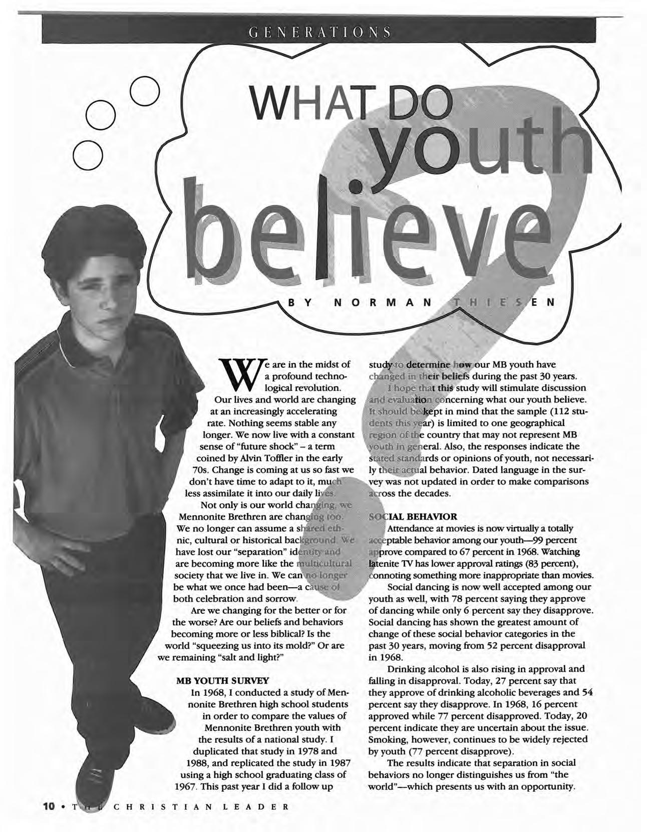 Our third article looks at what the youth of Generation Y believe. Since 1968, Norman Thiesen has been surveying Mennonite Brethren youth every 10 years on issues ranging from doing devotions to sexual behavior. This article reveals the results from the latest survey completed in 1998.