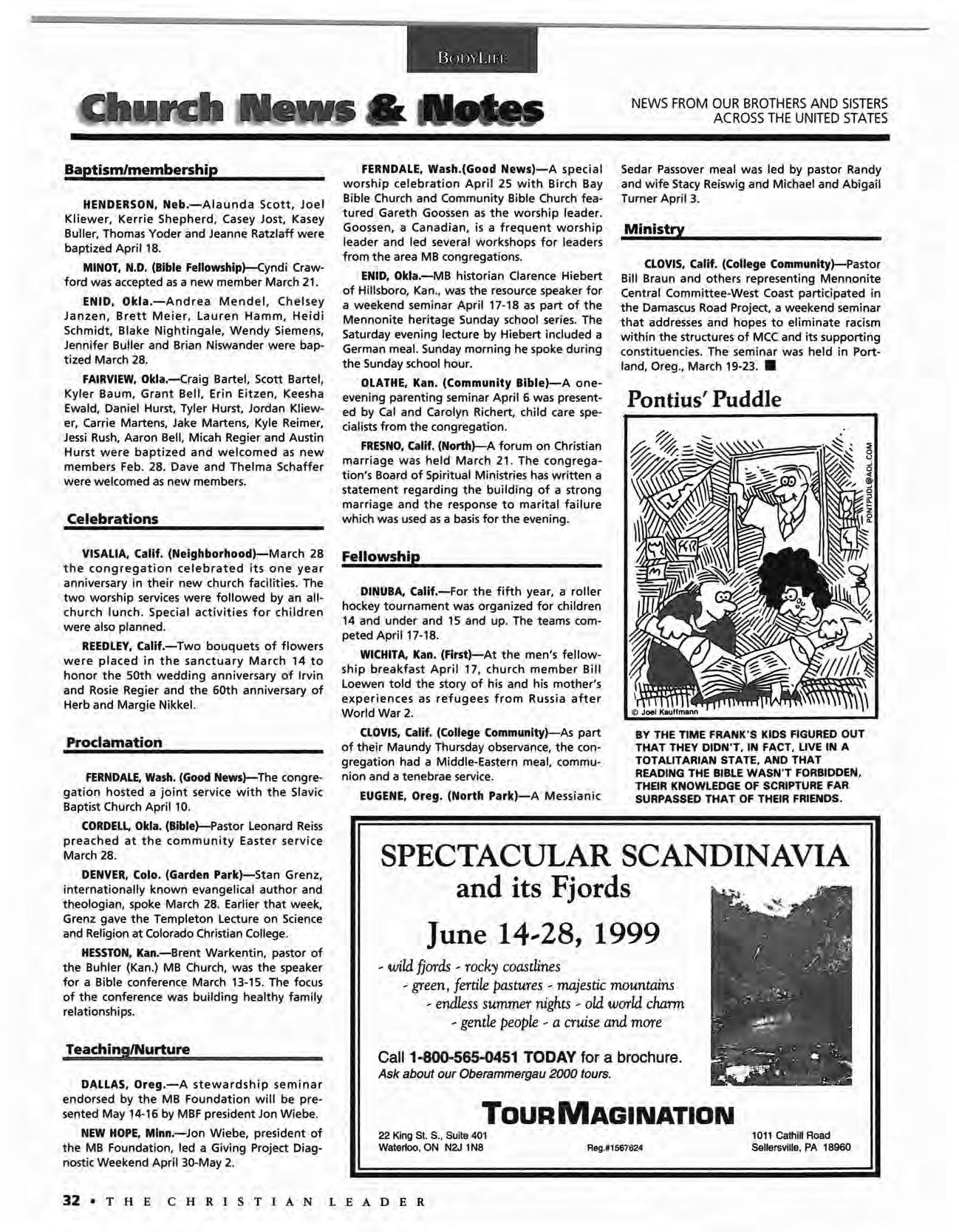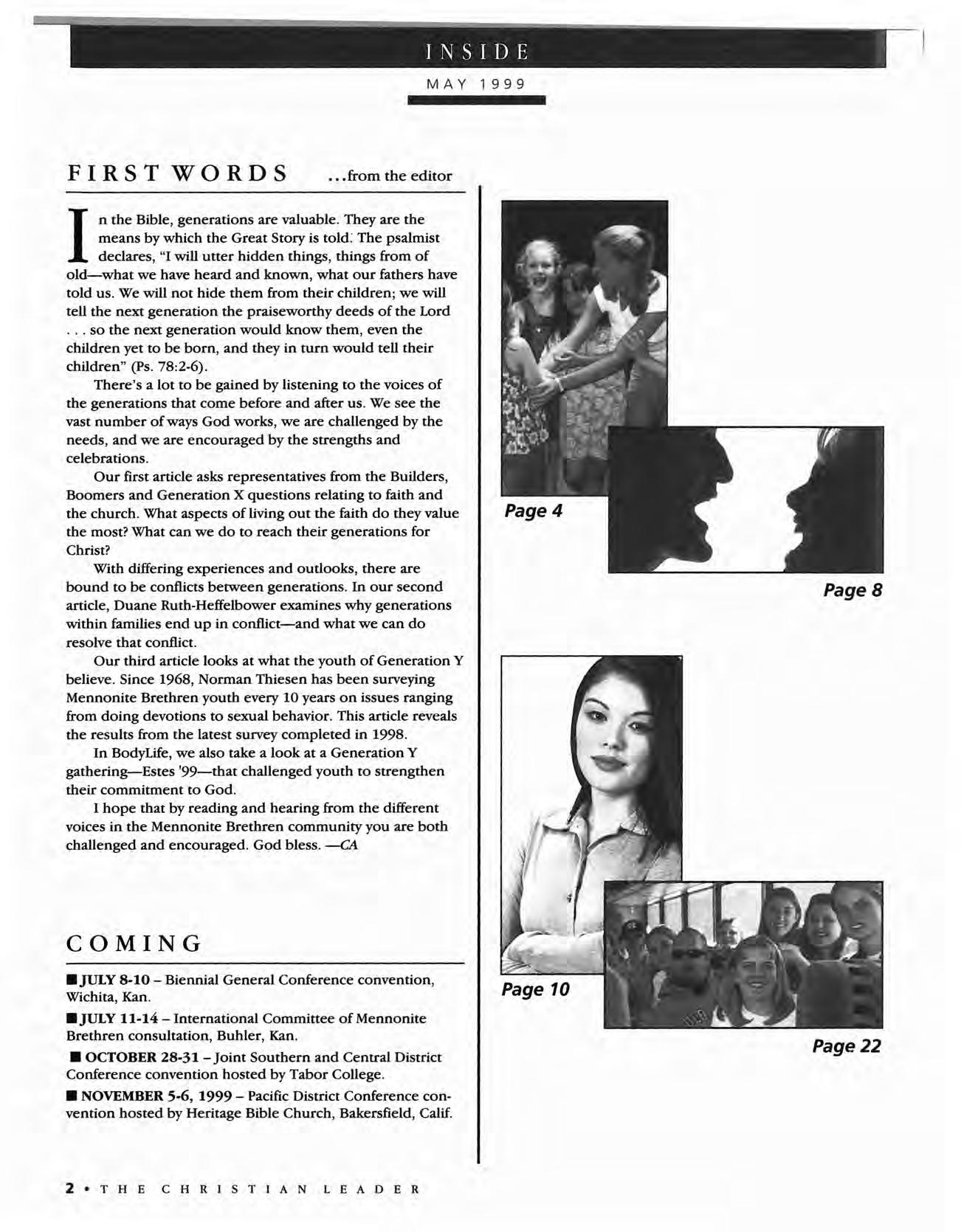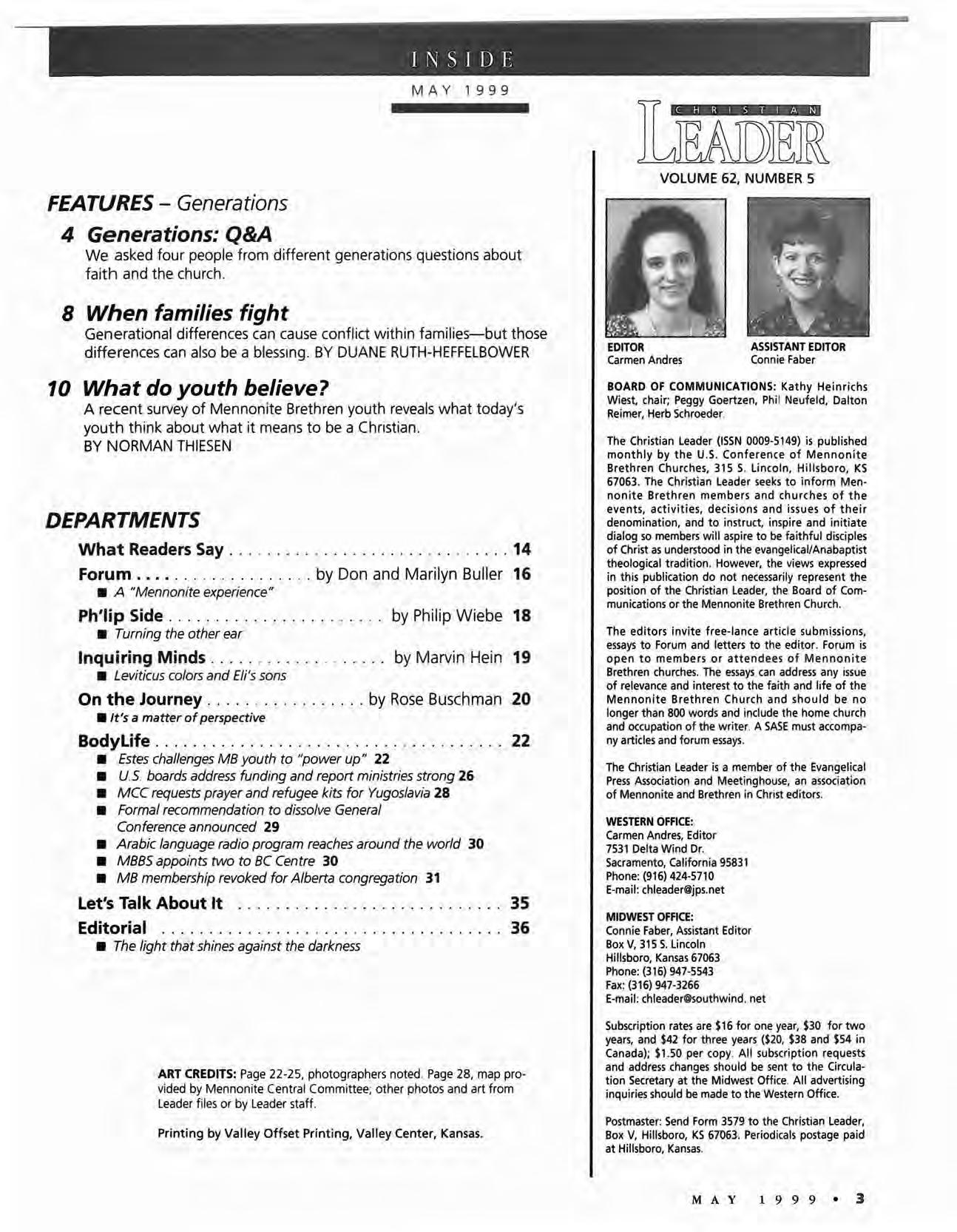 The Christian Leader (ISSN 0009-5149) is published monthly by the U.S. Conference of Mennonite Brethren Churches, 315 S. Lincoln, Hillsboro, KS 67063. The Christian Leader seeks to inform Mennonite Brethren members and churches of the events, activities, decisions and issues of their denomination, and to instruct, inspire and initiate dialog so members will aspire to be faithful disciples of Christ as understood in the evangelical/Anabaptist theological tradition. However, the views expressed in this publication do not necessarily represent the position of the Christian Leader, the Board of Communications or the Mennonite Brethren Church.