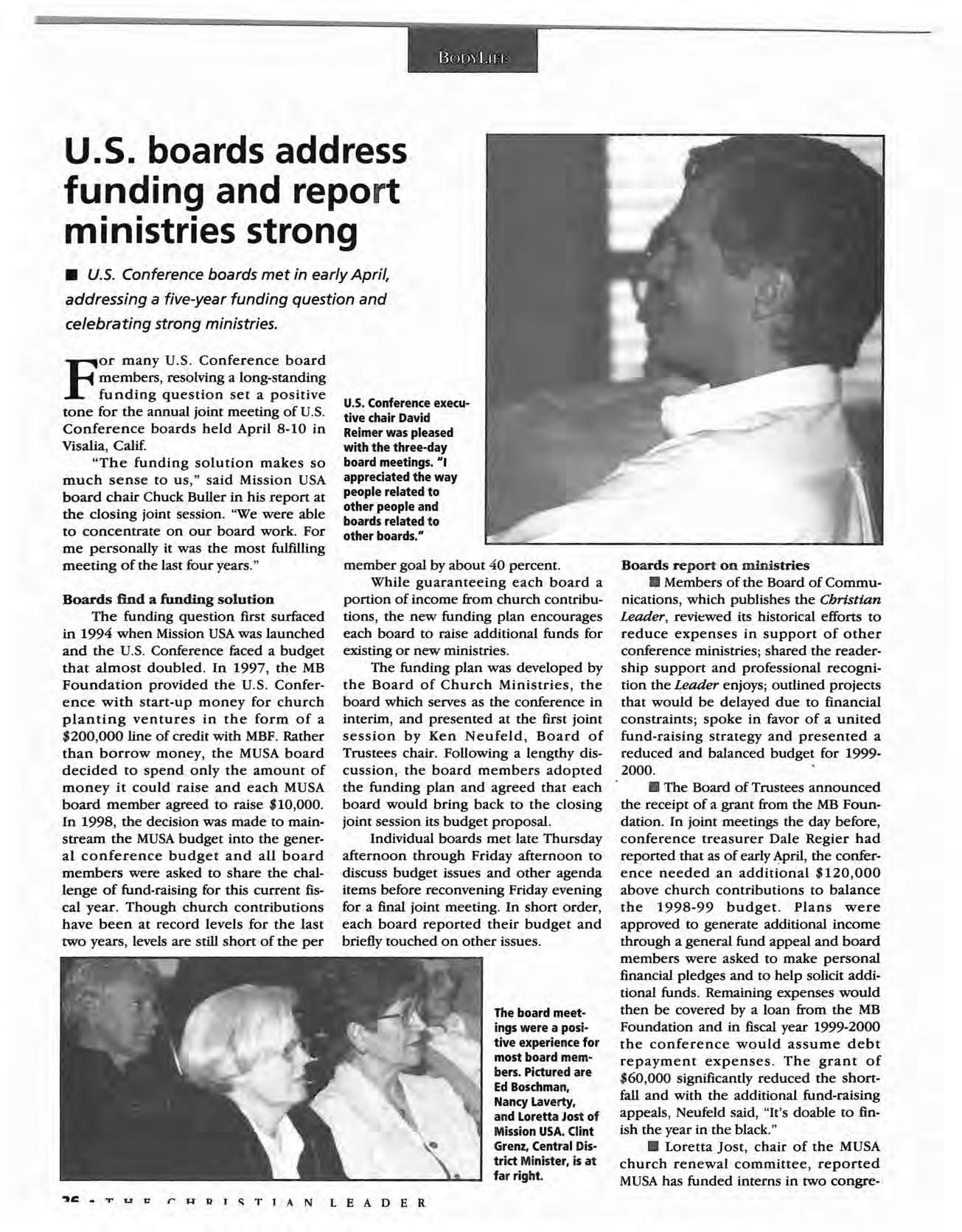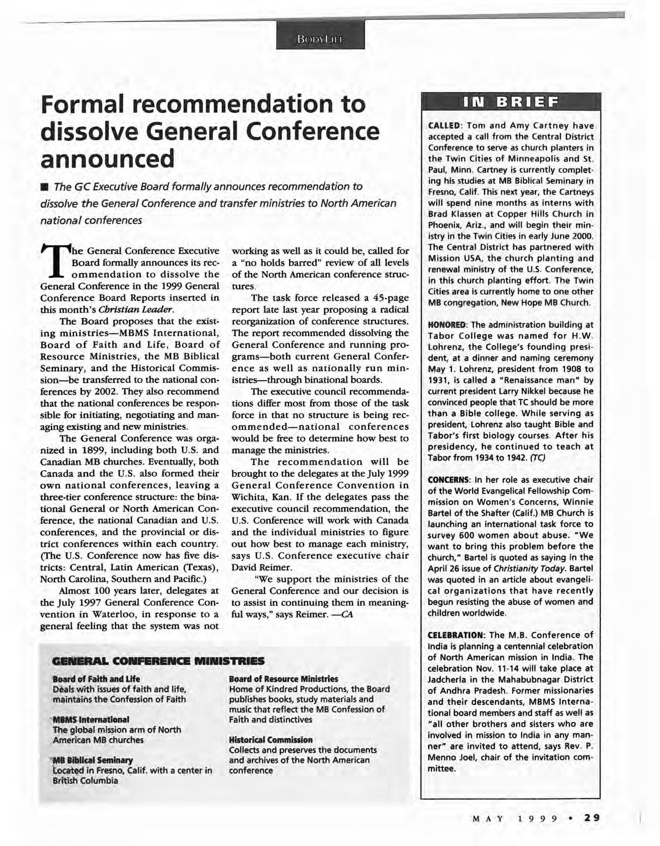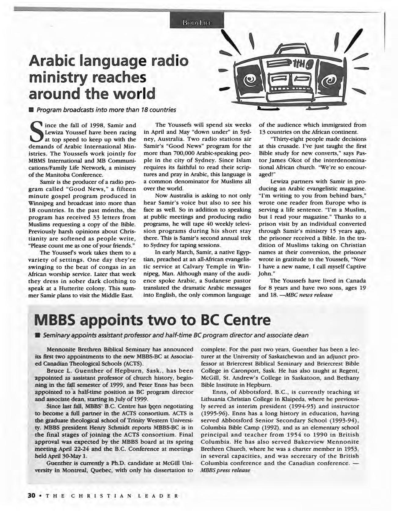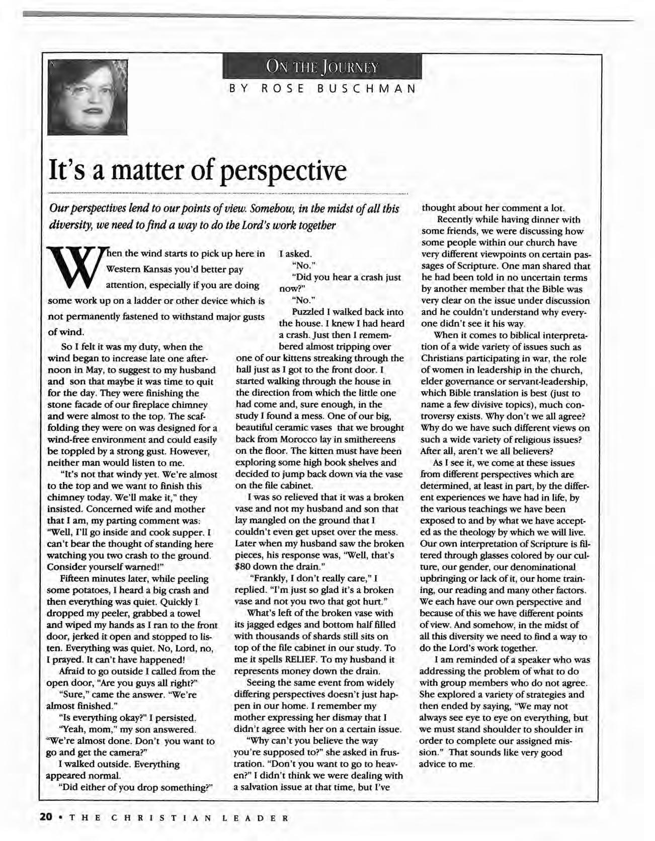 The Christian Leader (ISSN 0009-5149) is published monthly by the U.S. Conference of Mennonite Brethren Churches, 315 S. Lincoln, Hillsboro, KS 67063. The Christian Leader seeks to inform Mennonite Brethren members and churches of the events, activities, decisions and issues of their denomination, and to instruct, inspire and initiate dialog so members will aspire to be faithful disciples of Christ as understood in the evangelical/Anabaptist theological tradition. However, the views expressed in this publication do not necessarily represent the position of the Christian Leader, the Board of Communications or the Mennonite Brethren Church.