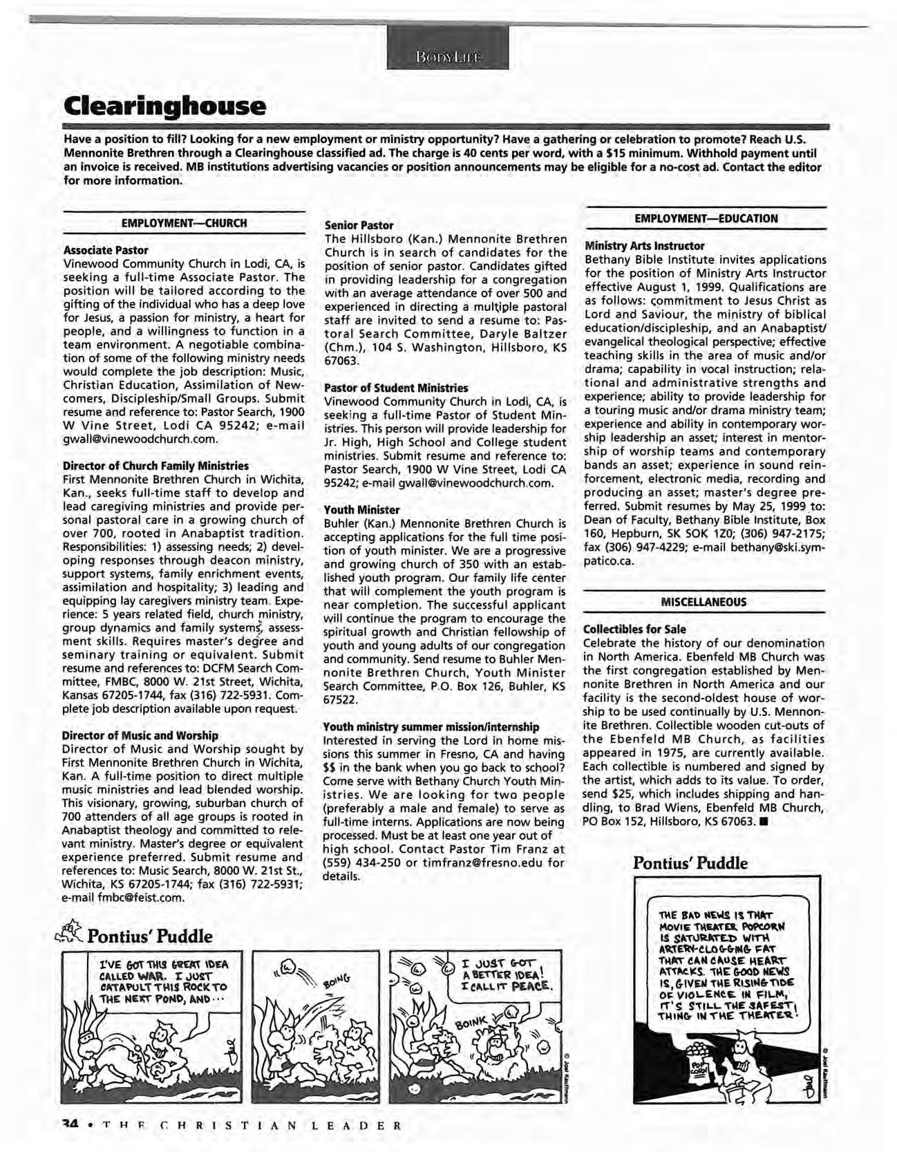 The Hillsboro (Kan.) Mennonite Brethren Church is in search of candidates for the position of senior pastor. Candidates gifted in providing leadership for a congregation with an average attendance of over 500 and experienced in directing a multiple pastoral staff are invited to send a resume to: Pastoral Search Committee, Daryle Baltzer (Chm.), 104 S. Washington, Hillsboro, KS 67063.