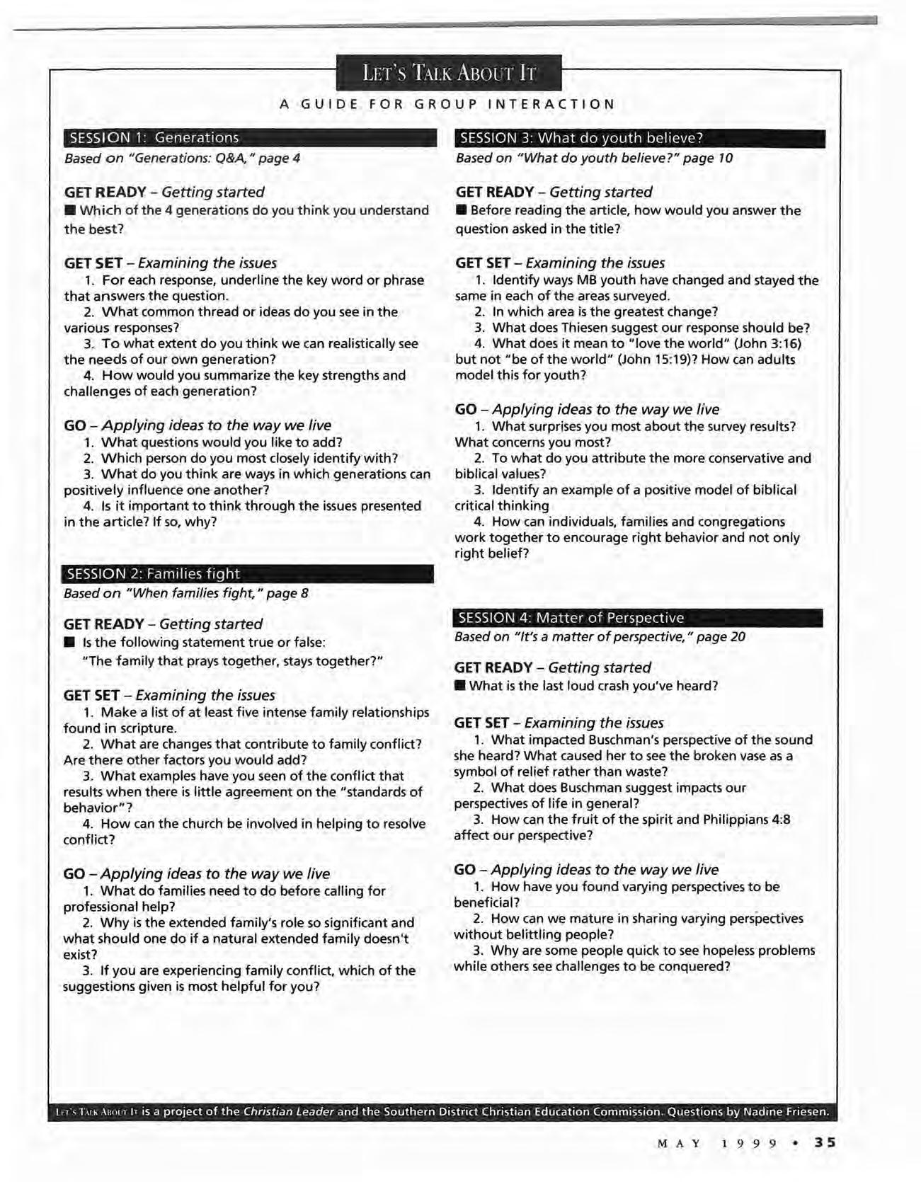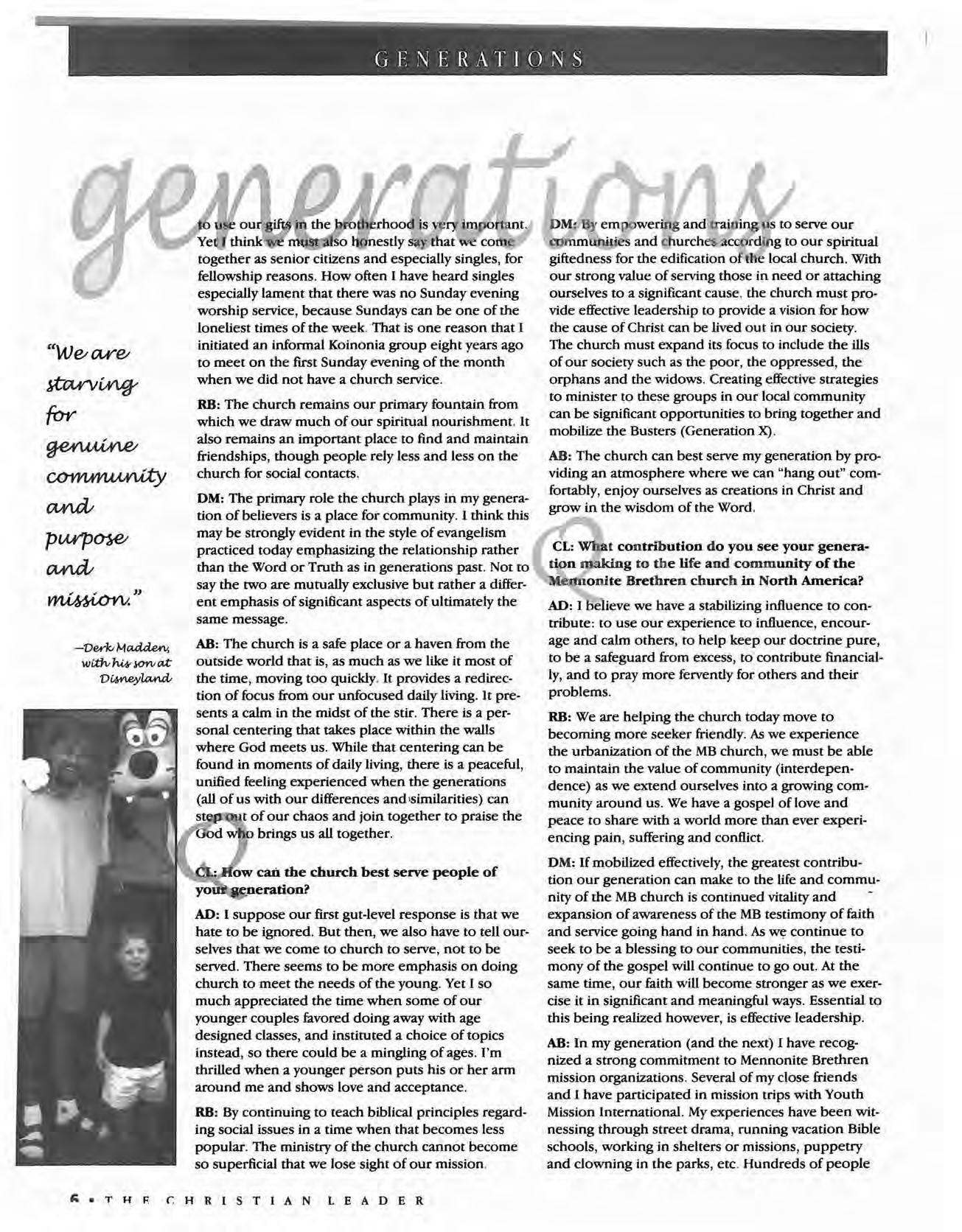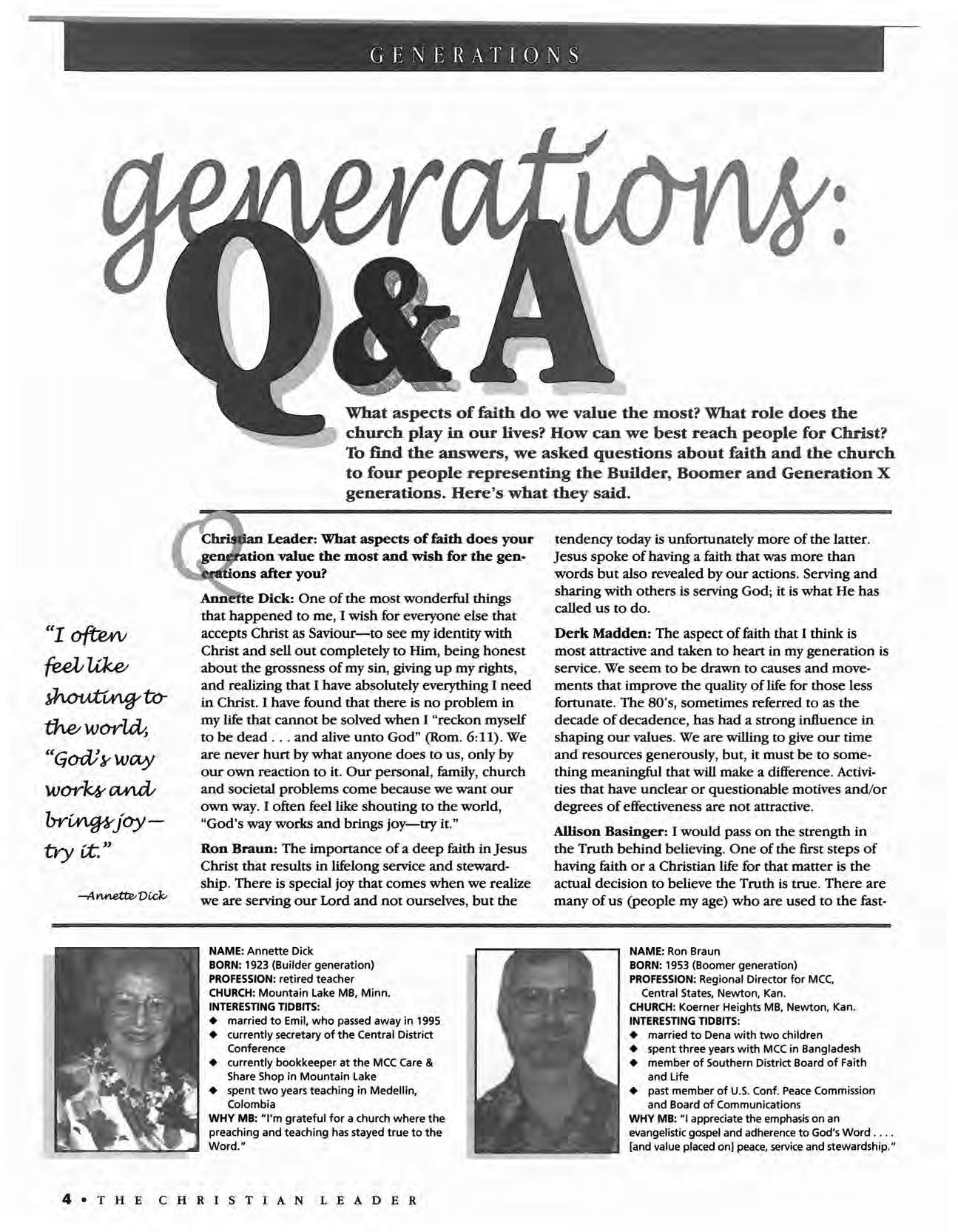 Our first article asks representatives from the Builders, Boomers and Generation X questions relating to faith and the church. What aspects of living out the faith do they value the most? What can we do to reach their generations for Christ?