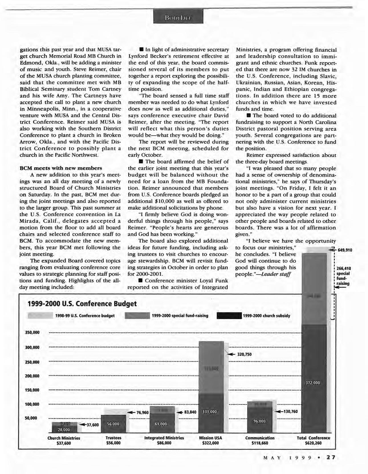 RB: We are helping the church today move to becoming more seeker friendly. As we experience the urbanization of the MB church, we must be able to maintain the value of community (interdependence) as we extend ourselves into a growing community around us. We have a gospel of love and peace to share with a world more than ever experiencing pain, suffering and conflict.