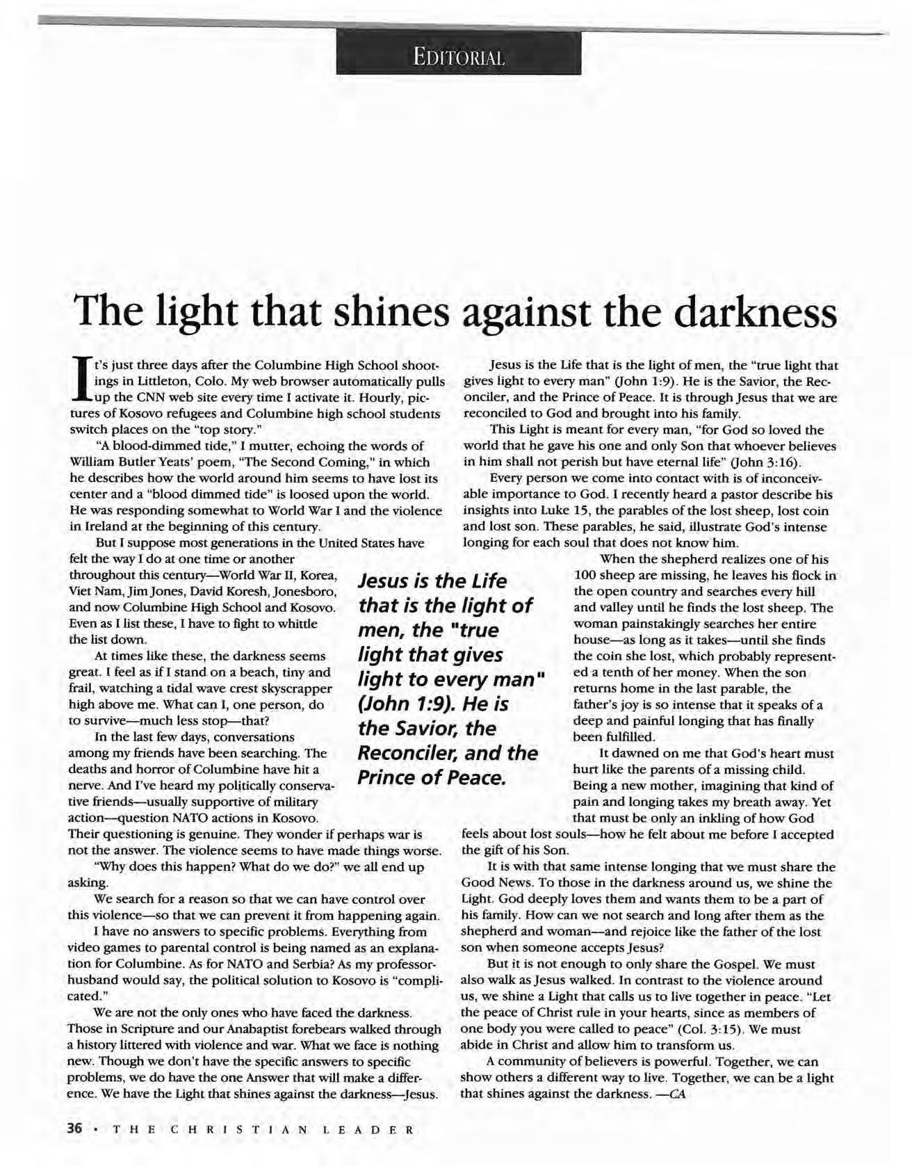 We are not the only ones who have faced the darkness. Those in Scripture and our Anabaptist forebears walked through a history littered with violence and war.What we face is nothing new. Though we don't have the specific answers to specific problems, we do have the one Answer that will make a difference. We have the Light that shines against the darkness-jesus.