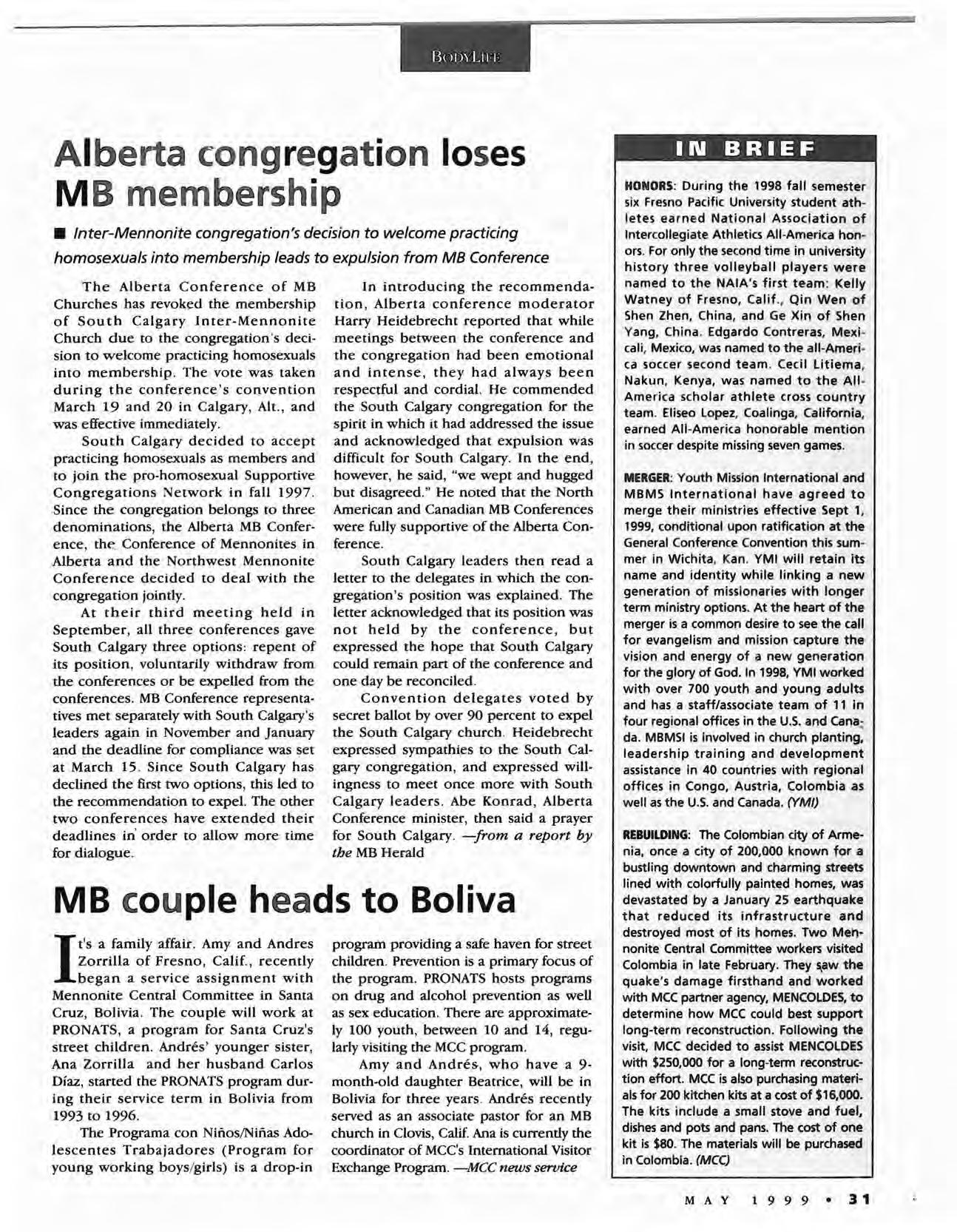 Bethany Bible Institute invites applications for the position of Ministry Arts Instructor effective August 1, 1999. Qualifications are as follows: l;ommitment to Jesus Christ as Lord and Saviour, the ministry of biblical education/discipleship, and an Anabaptist! evangelical theological perspective; effective teaching skills in the area of music and/or drama; capability in vocal instruction; relational and administrative strengths and experience; ability to provide leadership for a touring music and/or drama ministry team; experience and ability in contemporary worship leadership an asset; interest in mentorship of worship teams and contemporary bands an asset; experience in sound reinforcement, electronic media, recording and producing an asset; master's degree preferred. Submit resumes by May 25, 1999 to: Dean of Faculty, Bethany Bible Institute, Box 160, Hepburn, SK SOK 1Z0; (306) 947-2175; fax (306) 947-4229; e-mail bethany@skLsympatico.ca.