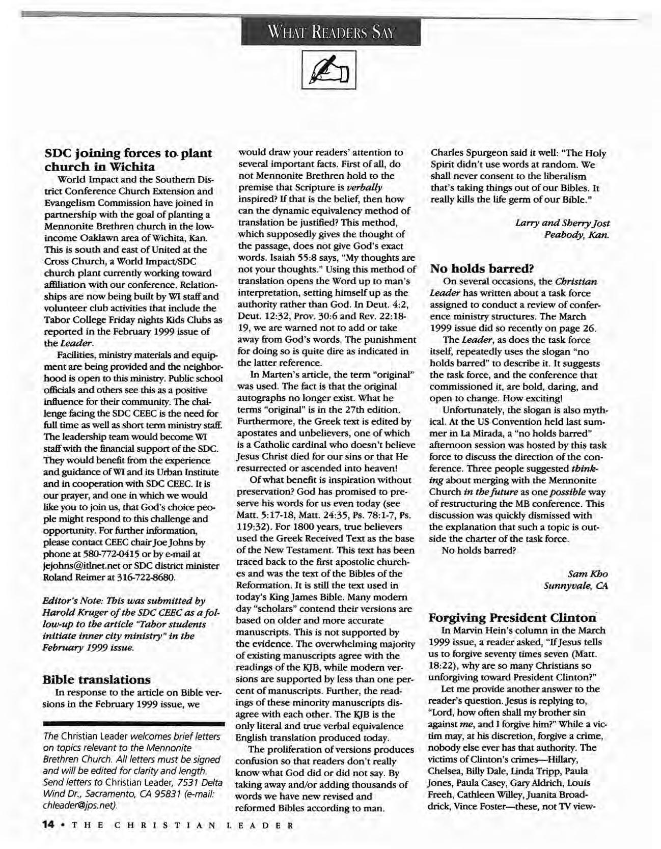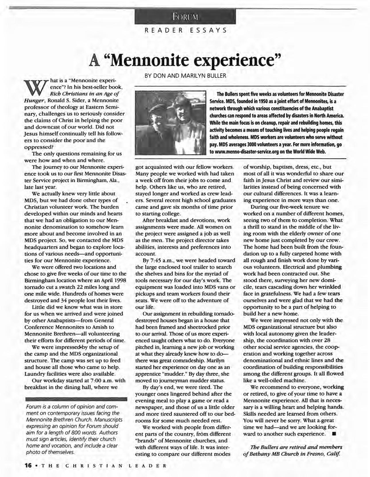 The editors invite free-lance article submissions, essays to Forumand letters to the editor. Forum is open to members or attendees of Mennonite Brethren churches. The essays can address any issue of relevance and interest to the faith and life of the Mennonite Brethren Church and should be no longer than 800 words and include the home church and occupation of the writer. A SASE must accompany articles and forum essays.