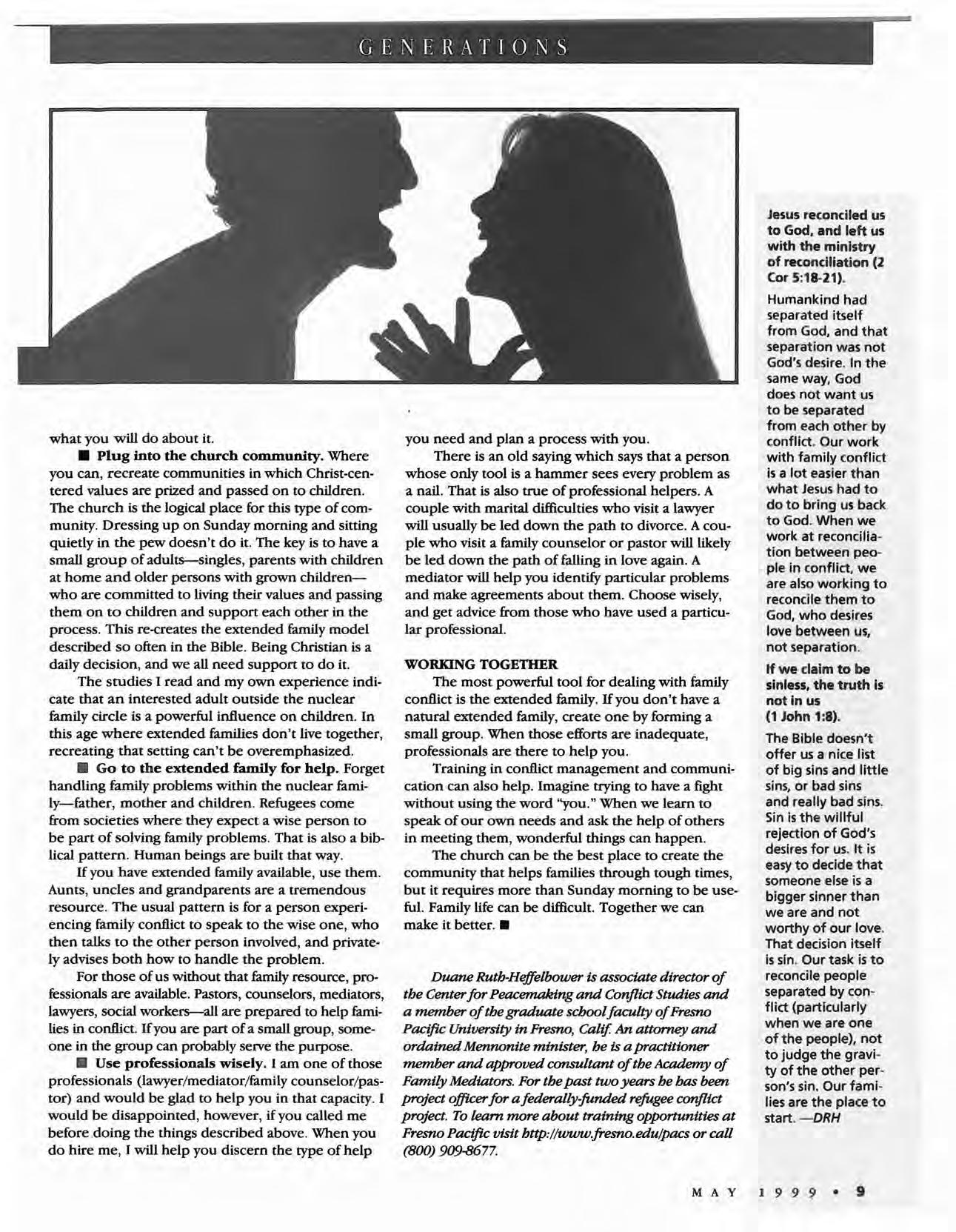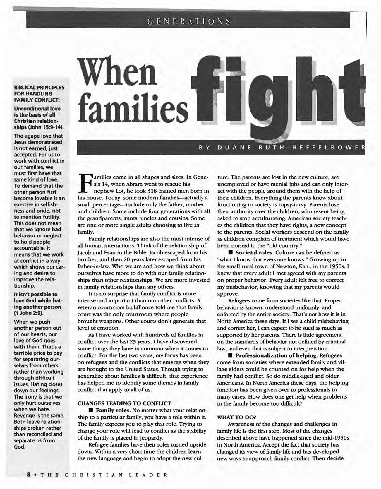 With differing experiences and outlooks, there are bound to be conflicts between generations. In our second article, Duane Ruth-Heffelbower examines why generations within families end up in conflict-and what we can do resolve that conflict.