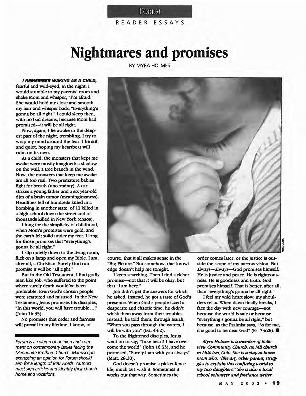 The editors invite free-lance article submissions, essays to Forum and letters to the editor. Forum is open to members or attendees of Mennonite Brethren churches. The essays can address any issue of relevance and interest to the faith and life of the Mennonite Brethren Church and should be no longer than 800 words and include the home church and occupation of the writer. A SASE must accompany articles and forum essays.