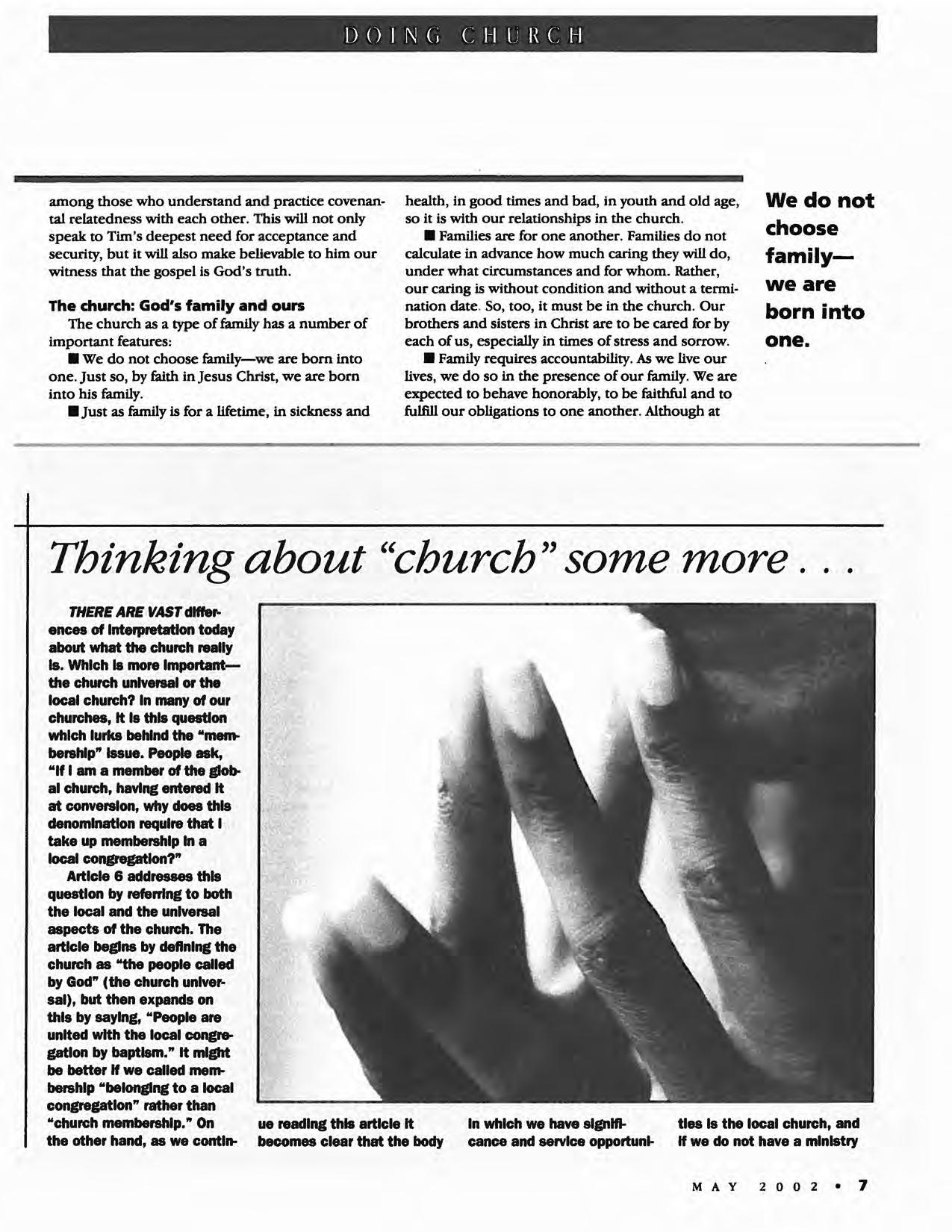 Article 6 addresses this question by referring to both the local and the universal aspects of the church. The article begins by defining the church as "the people called by God" (the church universal), but then expands on this by saying, "People are united with the local c0ngregation by baptism." It might be better If we called membership "belonging to a local congregation" rather than "church membership." On the other hand, as we contln-