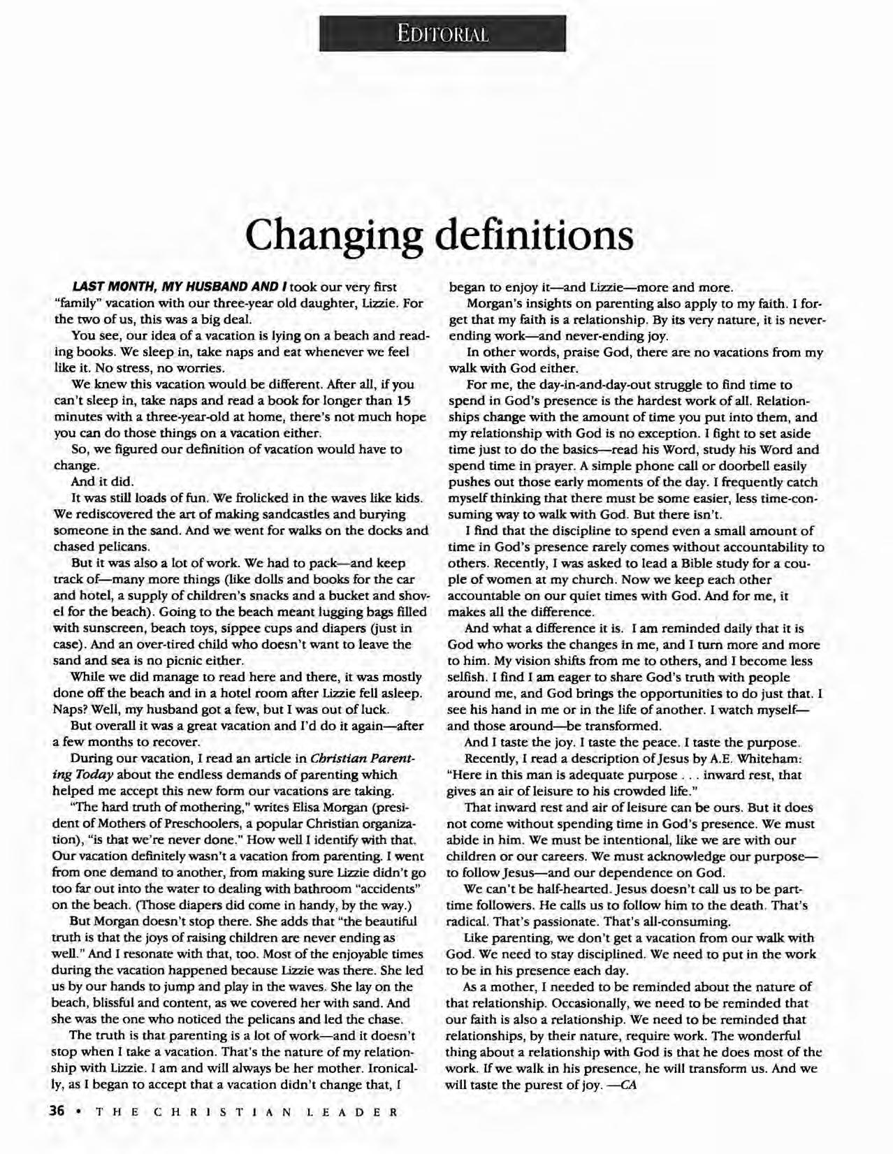 "The hard truth of mothering," writes Elisa Morgan (president of Mothers of Preschoolers, a popular Christian organization), "is that we're never done." How well I identify with that. Our vacation definitely wasn't a vacation from parenting. I went from one demand to another, from making sure Lizzie didn't go too far out into the water to dealing with bathroom "accidents" on the beach. (Those diapers did come in handy, by the way.)