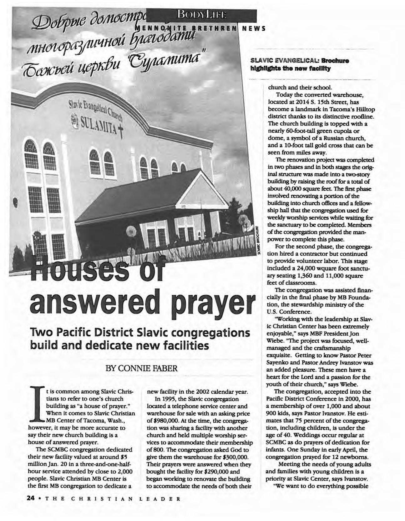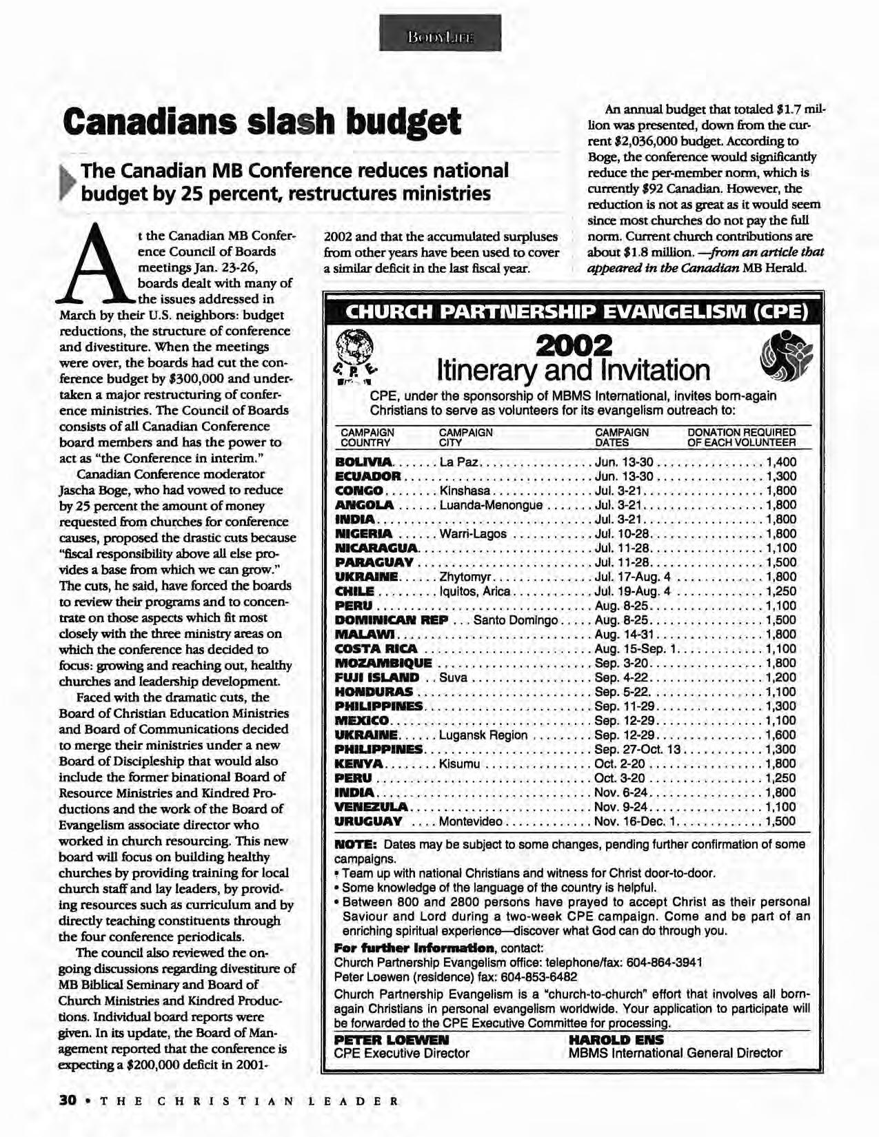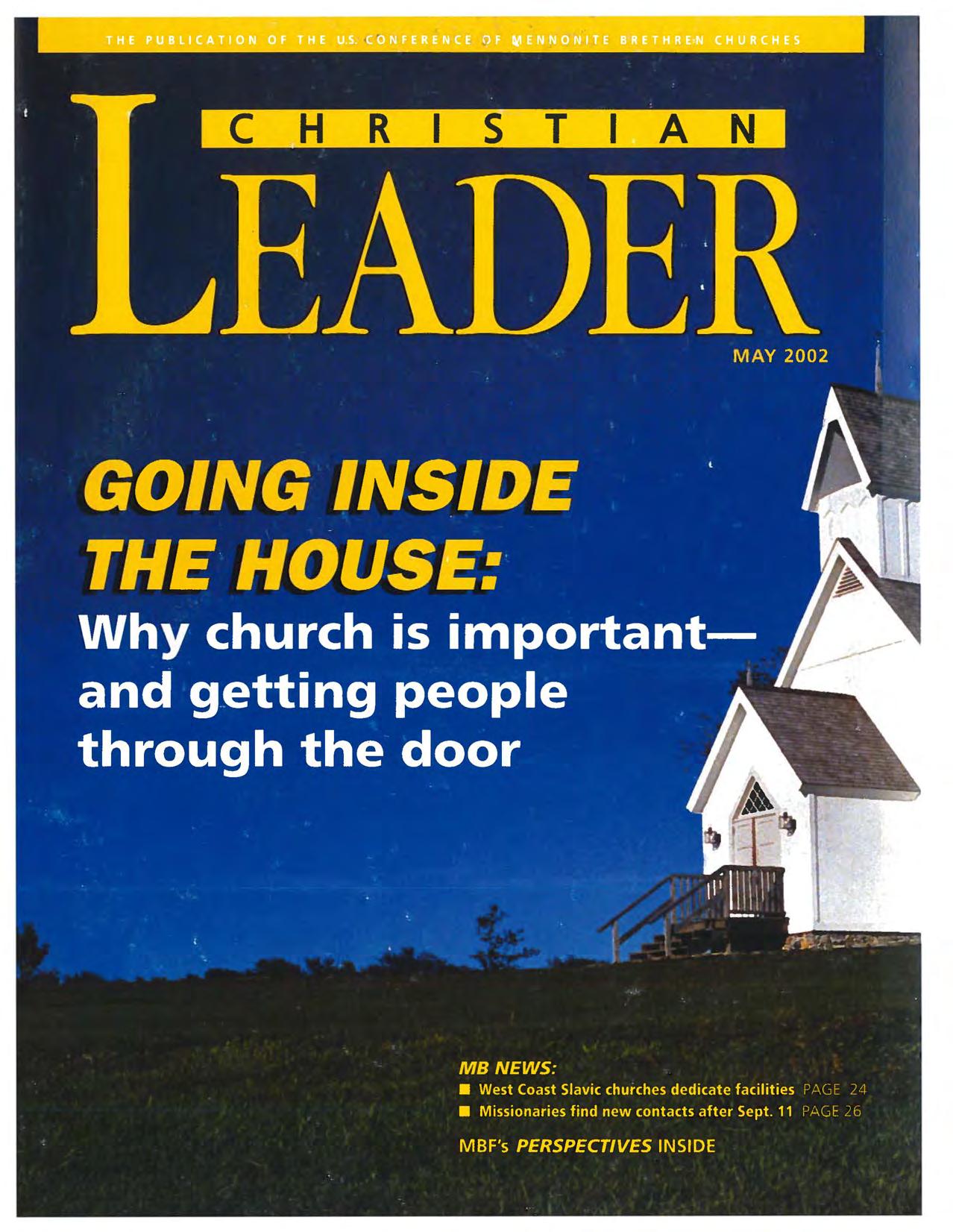 The Christian Leader (ISSN 0009-5149) is published monthly by the U.S. Conference of Mennonite Brethren Churches, 315 S. Lincoln, Hillsboro, KS 67063. The Christian Leader seeks to inform Mennonite Brethren members and churches of the events, activities, decisions and issues of theirdenomination, and to instruct, inspire and initiate dialogue so members will aspire to be faithful disciples of Christ as understood in the evangelicaVAnabaptist theological tradition. However, the views expressed in this publication do not necessarily represent the position of the Christian Leader, the Board of Communications or the Mennonite Brethren Church.