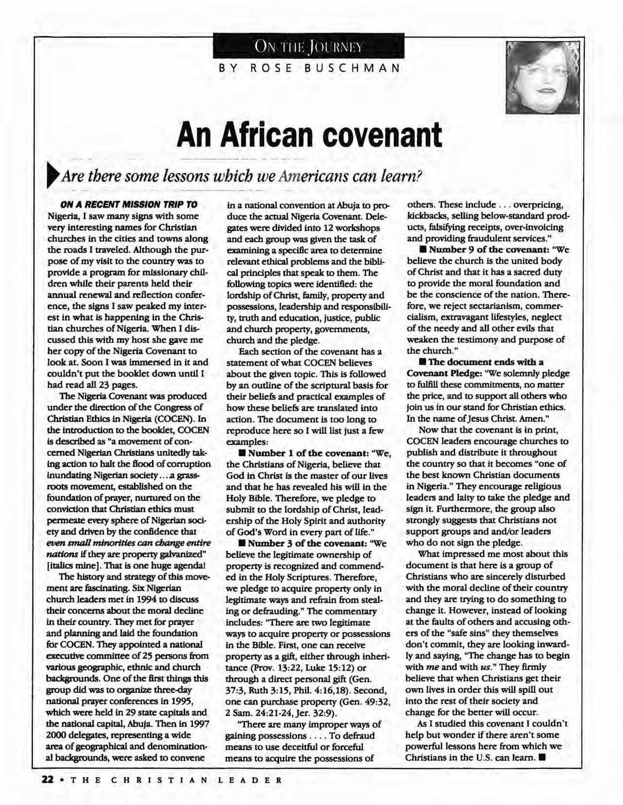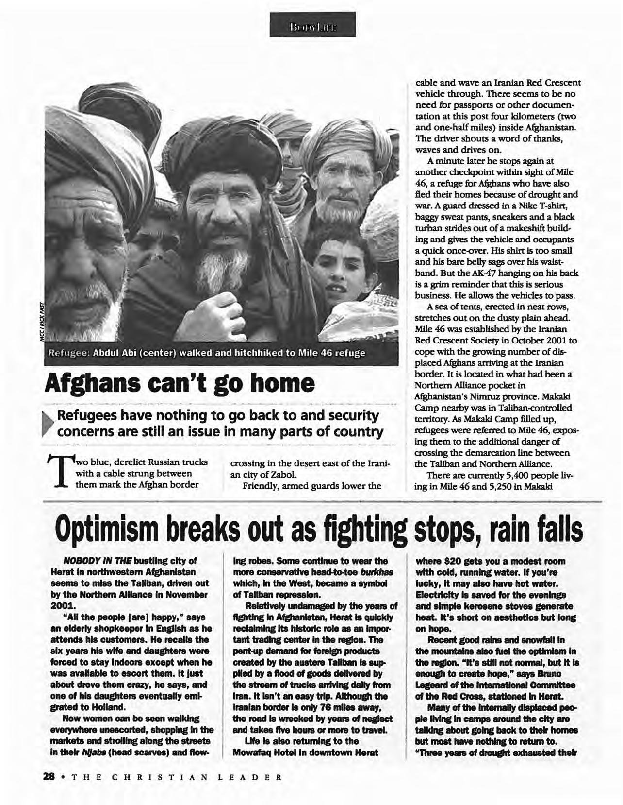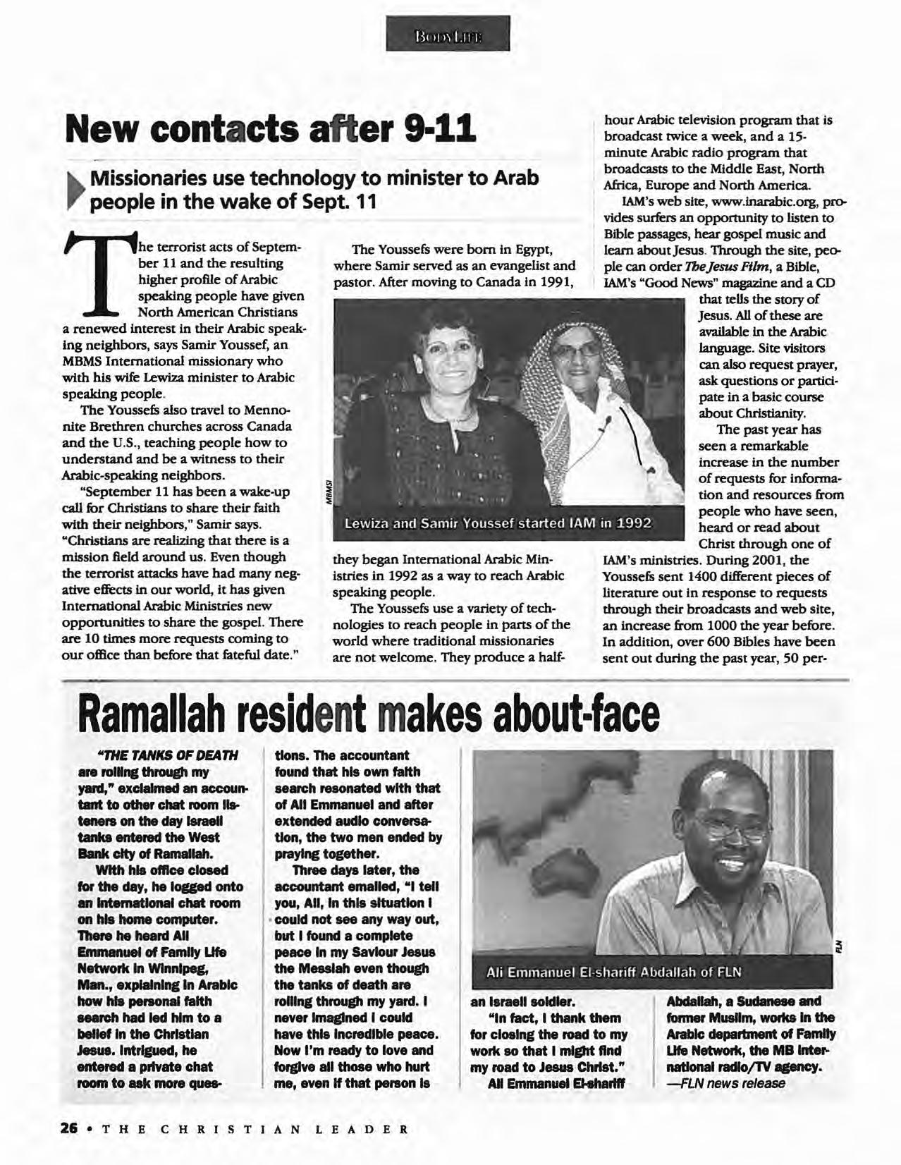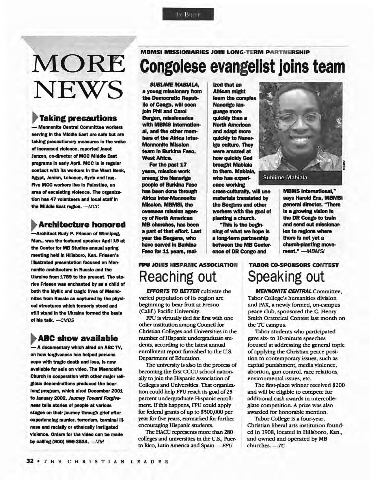 The Christian Leader (ISSN 0009-5149) is published monthly by the U.S. Conference of Mennonite Brethren Churches, 315 S. Lincoln, Hillsboro, KS 67063. The Christian Leader seeks to inform Mennonite Brethren members and churches of the events, activities, decisions and issues of theirdenomination, and to instruct, inspire and initiate dialogue so members will aspire to be faithful disciples of Christ as understood in the evangelicaVAnabaptist theological tradition. However, the views expressed in this publication do not necessarily represent the position of the Christian Leader, the Board of Communications or the Mennonite Brethren Church.