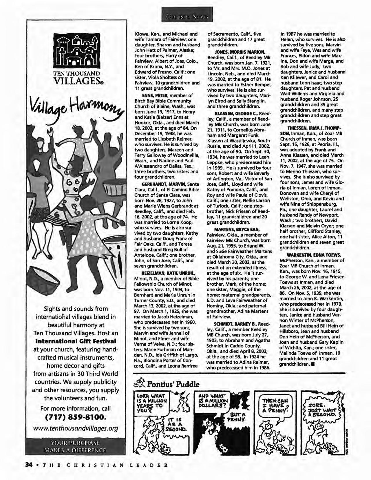 THIESSEN. IRMA J. THOMP· SON, Inman. Kan .• of loar MB Church of Inman, was born Sept. 16, 1926, at Peoria. III •• was adopted by Frank and Anna Klassen, and died March 11,2002, at the age of 75. On Nov. 7, 1947, she was married to Menno Thiessen, who survives. She is also survived by four sons. James and wife Gloria of Inman, Loren of Inman. Donovan and wife Cheryl of Wellston. Ohio. and Kevin and wife Nina of Shippensburg, Pa.; one daughter. Laurel and husband Randy of Newport, Wash.; two brothers. David Klassen and Melvin Oryer; one half brother. Clifford Stanley; one half sister. Alice Alton. 11 grandchildren and seven great grandchildren.
