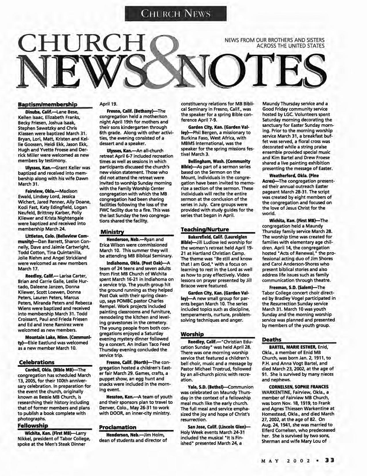 Wichita, Kan. (First MB}-The congregation held a Maundy Thursday family service March 28. The worship time was created for families with elementary age children. April 14, the congregation hosted "Acts of Renewal, " the professional acting duo of Jim Shores and Carol Anderson-Shores who present biblical stories and also address life issues such as family communication through theatre.