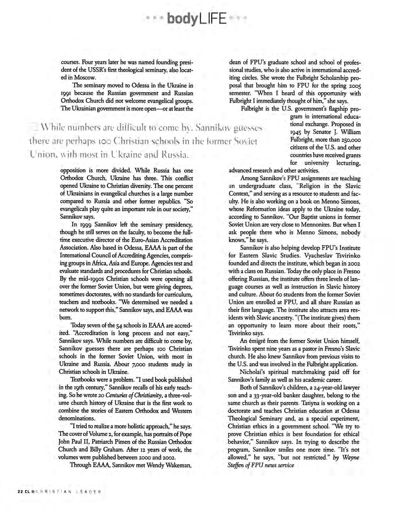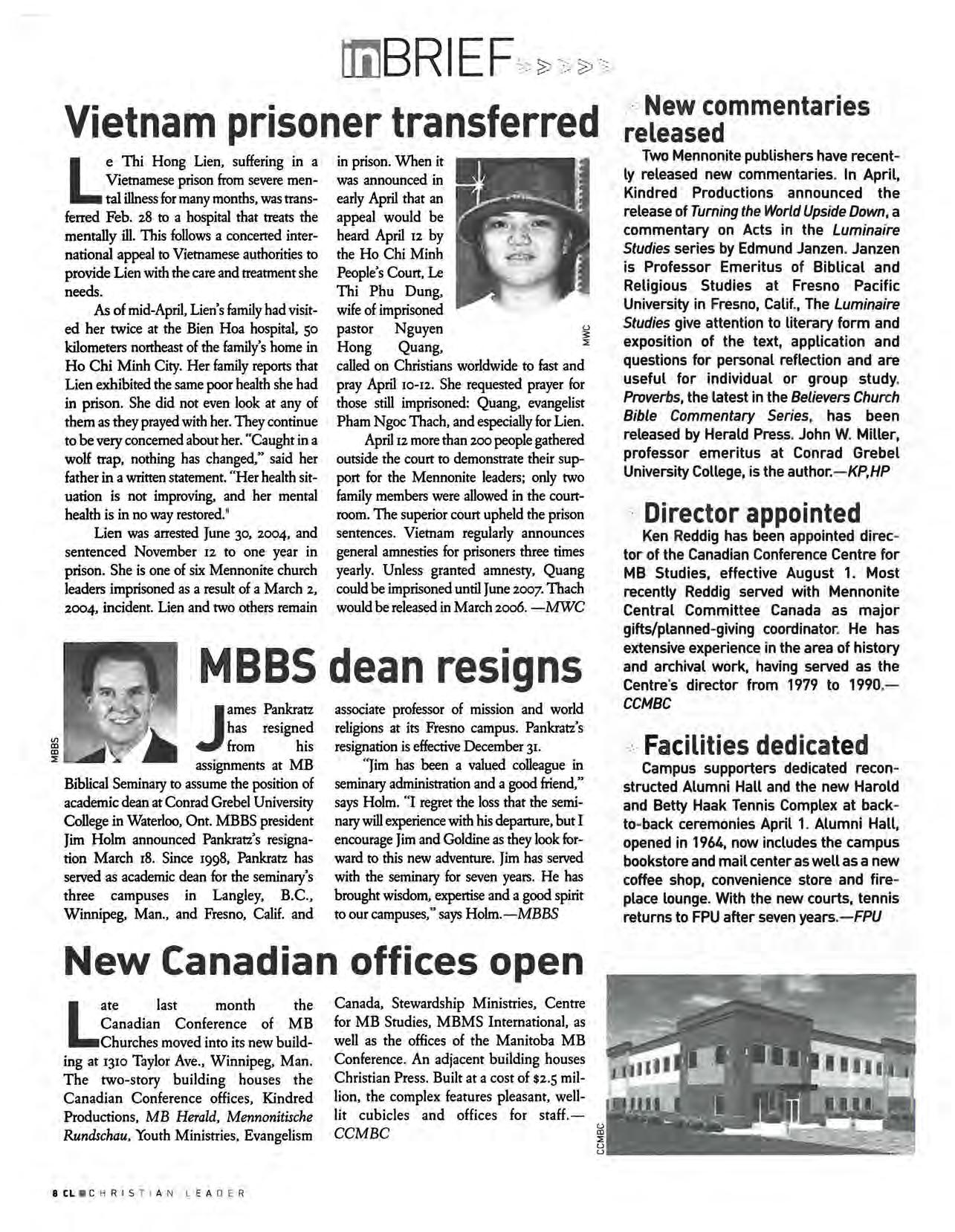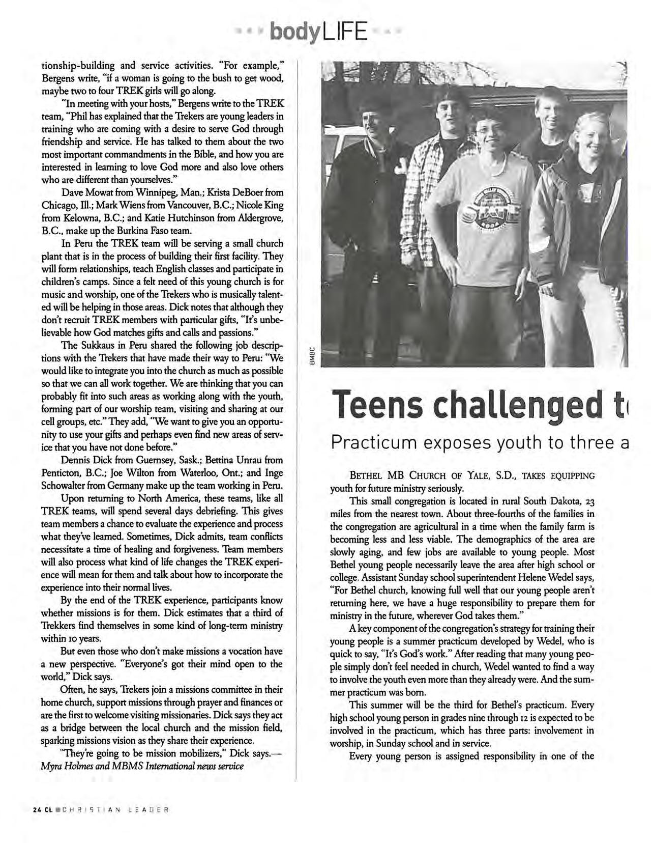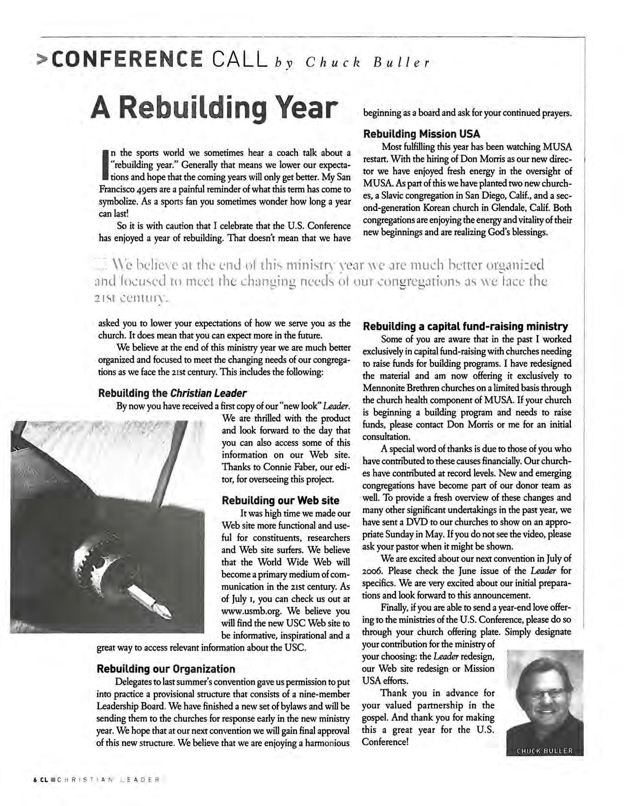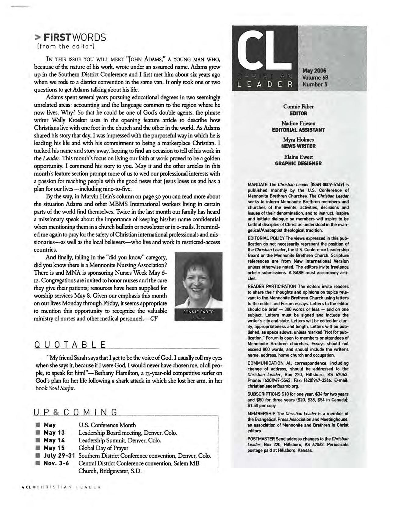 EDITOR IAL POLICY The views expressed in this publication do not necessarily represent the position of the Christian Leader. the U S Conference leadership Board or the Mennonite Brethren Church Scripture references are from New International Version unless otherwise noted The editors invite freeleru:e article submissions A SASE must accompany articles.