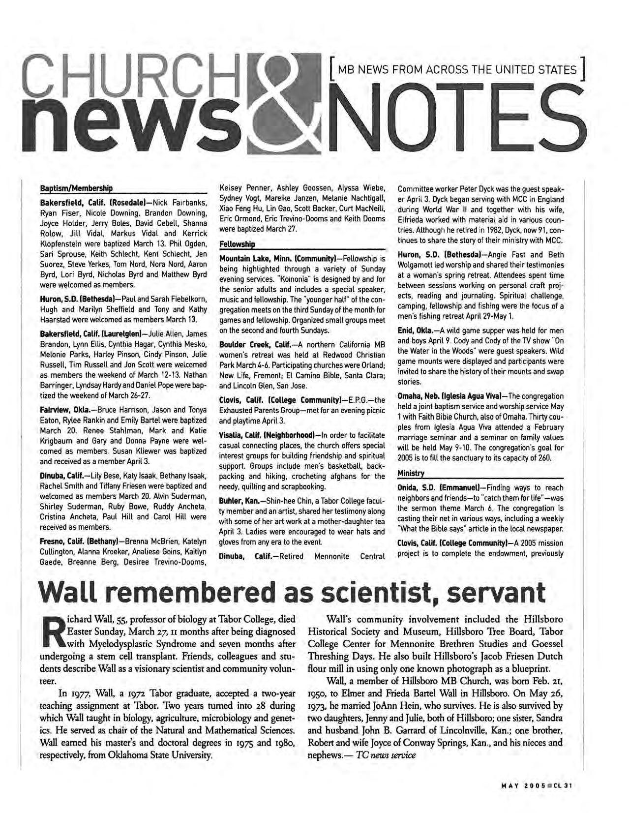Wall's community involvement included the Hillsboro Historical Society and Museum, Hillsboro Tree Board, Tabor College Center for Mennonite Brethren Studies and Goessel Threshing Days He also built Hillsboro's Jacob Friesen Dutch flour mill in using only one known photograph as a blueprint. Wall, a member of Hillsboro MB Church, was born Feb. 21, 1950, to Elmer and Frieda Bartel Wall in Hillsboro. On May 26, 1973. he married JoAnn Hein, who survives. He is also survived by two daughters, Jenny and Julie, both of Hillsboro; one sister, Sandra and husband John B. Garrard of Li ncolnville, Kan.; one brother, Robert and wife Joyce of Conway Springs, Kan ., and his nieces and nephews - TC news service