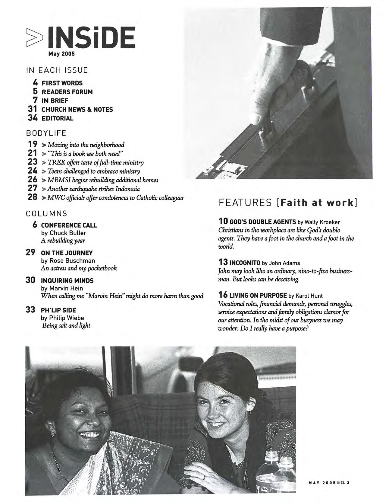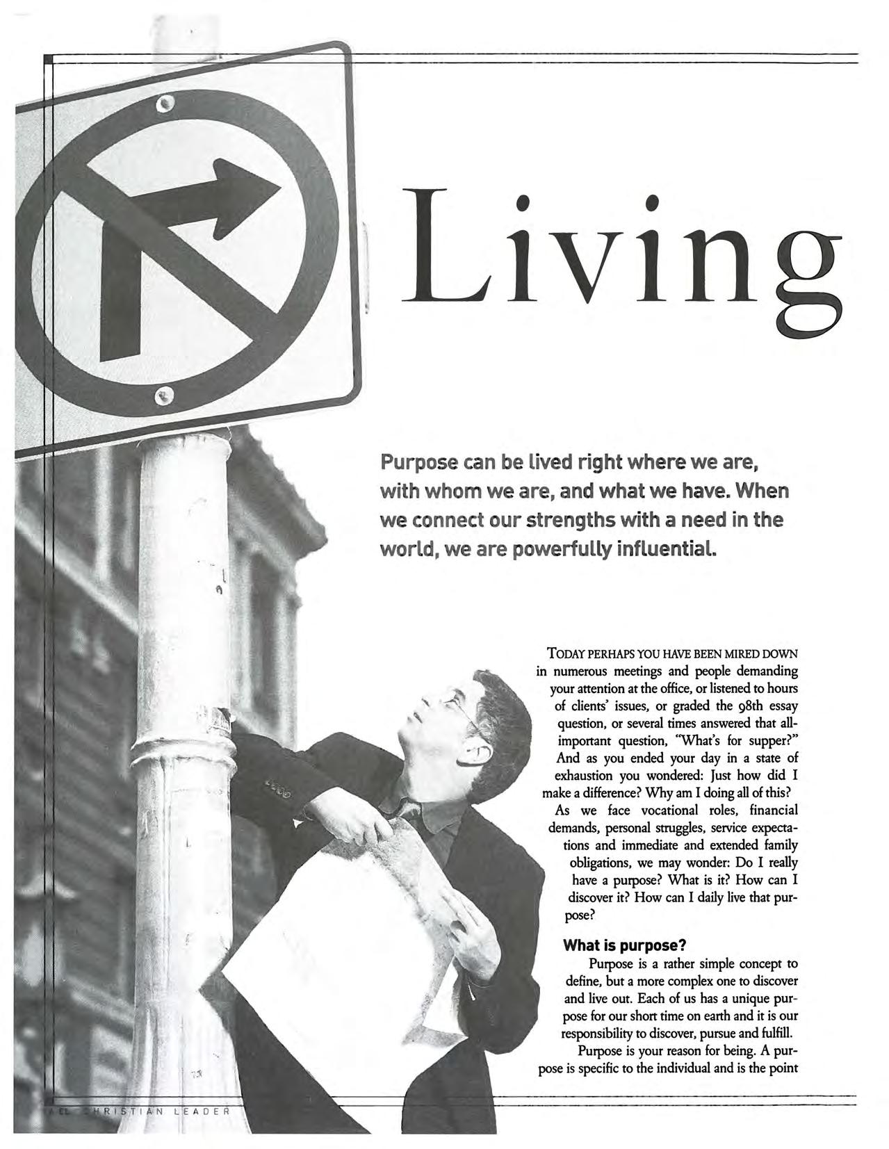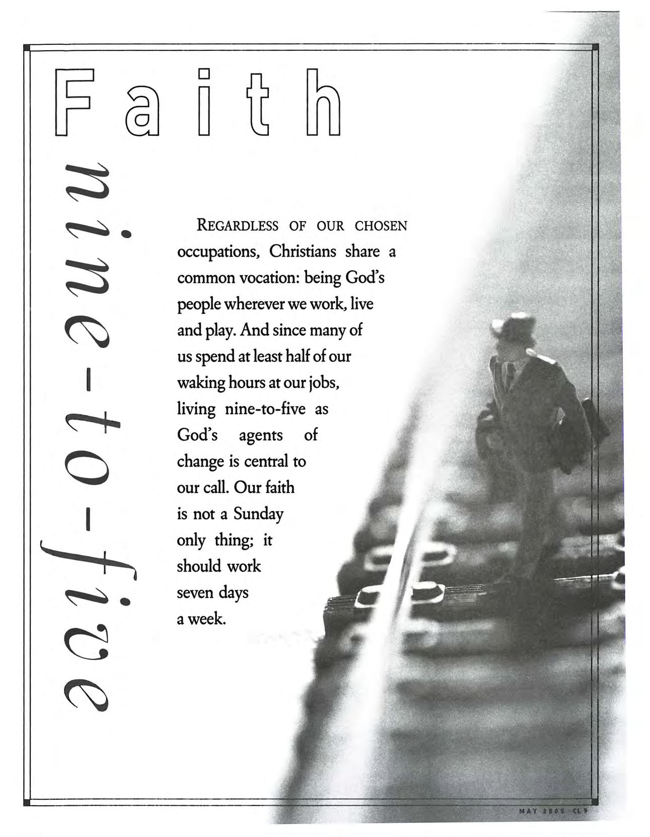 Adams spent several years pursuing educational degrees in two seemingly unrelated areas : accounting and the language common to the region where he now lives. Why? So that he could be one of God's double agents, the phrase writer Wally Kroeker uses in the opening feature article to describe how Christians live with one foot in the church and the other in the world. As Adams shared his story that day, I was impressed with the purposeful way in which he is leading his life and with his commitment to being a marketplace Christian. I tucked his name and story away, hoping to find an occasion to tell of his work in the Leader This month's focus on living our faith at work proved to be a golden opportunity. I commend his story to you. May it and the other articles in this month's feature section prompt more of us to wed our professional interests with a passion for reaching people with the good news that Jesus loves us and has a plan for our lives-including nine-to-five.