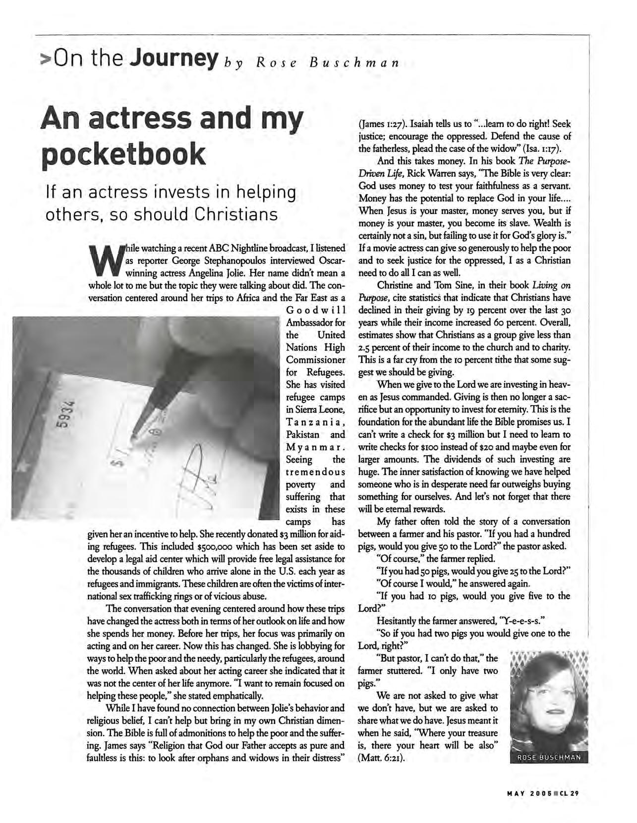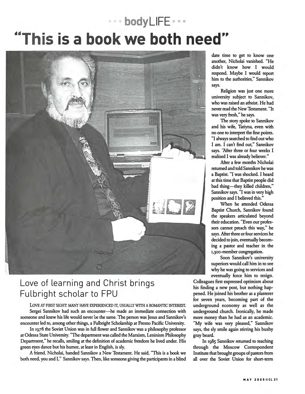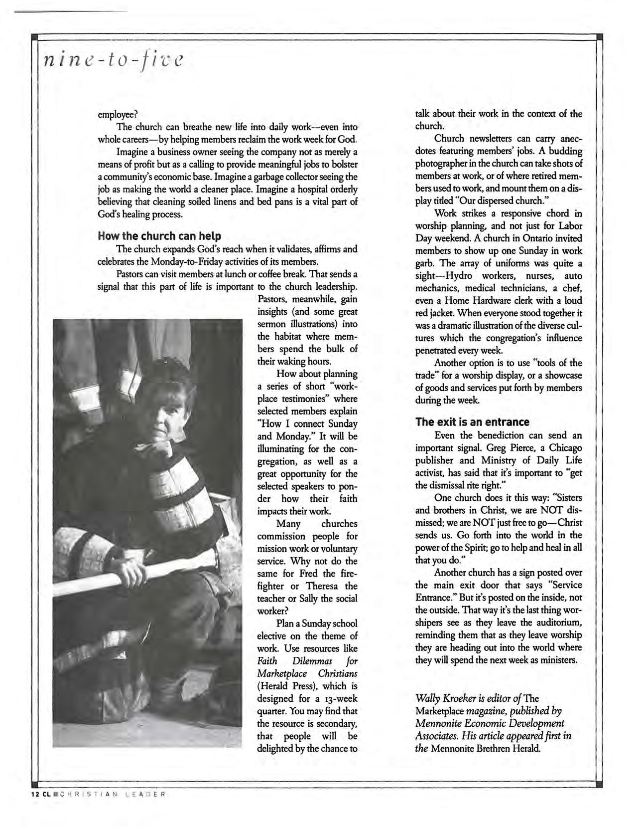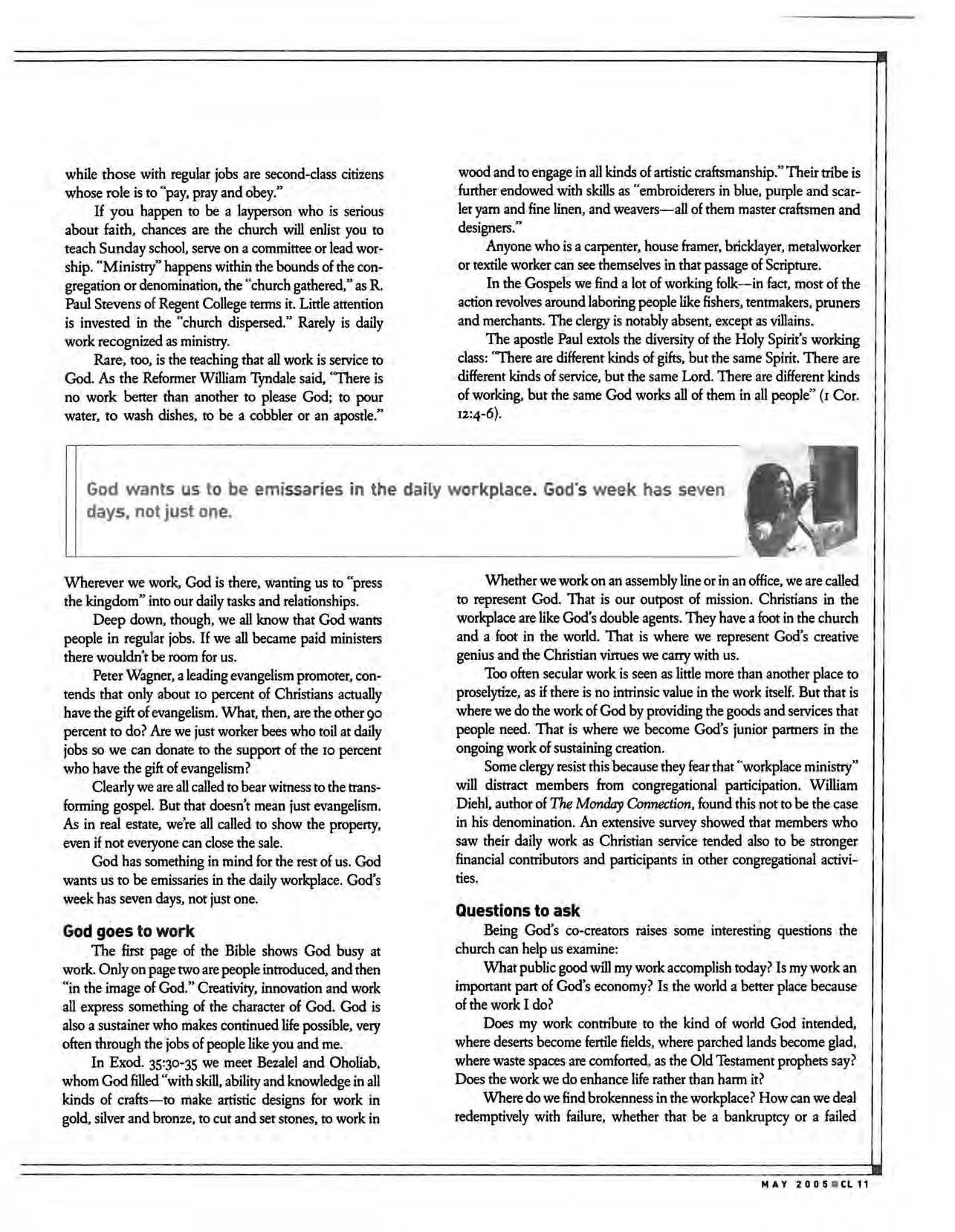 Adams spent several years pursuing educational degrees in two seemingly unrelated areas : accounting and the language common to the region where he now lives. Why? So that he could be one of God's double agents, the phrase writer Wally Kroeker uses in the opening feature article to describe how Christians live with one foot in the church and the other in the world. As Adams shared his story that day, I was impressed with the purposeful way in which he is leading his life and with his commitment to being a marketplace Christian. I tucked his name and story away, hoping to find an occasion to tell of his work in the Leader This month's focus on living our faith at work proved to be a golden opportunity. I commend his story to you. May it and the other articles in this month's feature section prompt more of us to wed our professional interests with a passion for reaching people with the good news that Jesus loves us and has a plan for our lives-including nine-to-five.