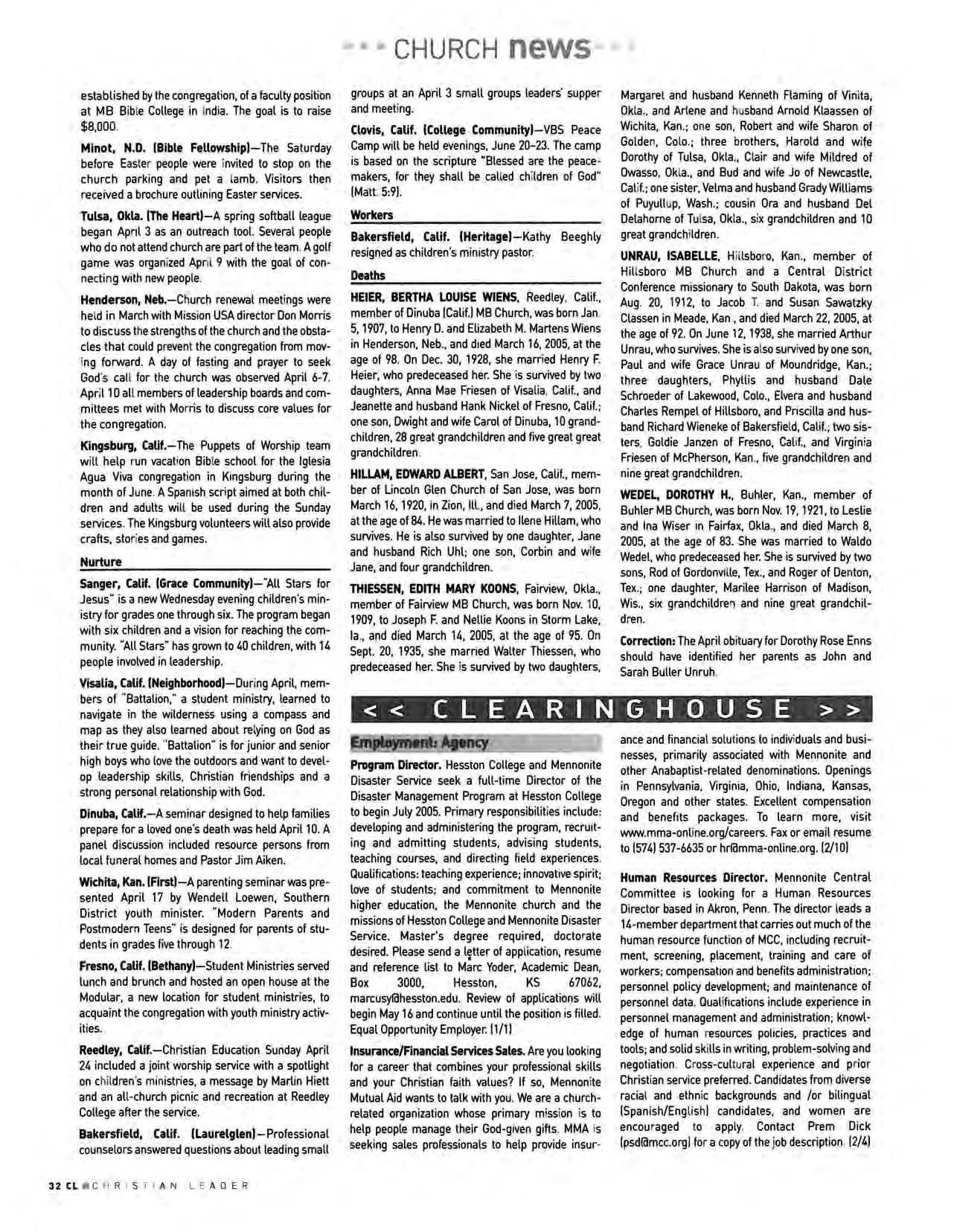 Program Director. Hesston College and Mennonite Disaster Service seek a full-time Director of the Disaster Management Program at Hesston College to begin July 2005. Primary responsibilit ies include: developing and administering the program, recruiting and admitt ing students, advising students , teaching courses, and directing field experiences Qualifications : teaching experience; innovative spirit; love of students; and commitment to Mennonite higher education, the Mennonite church and the missions of Hesston College and Mennonite Disaster Service. Master's degree required, docto r ate desired. Please send a letter of application, resume and reference list to Yoder, Academic Dean, Box 3000, Hesston, KS 67062, marcusyfahesston.edu Review of applications will begin May 16 and continue until the position is filled Equal Opportunity Employer. (1/1) Insurance/Financial Services Sales Are you looking for a career that combines your professional skills and your Christian faith values? If so, Mennon ite Mutual Aid wants to talk with you. We are a churchrelated organization whose primary miss ion is to help people manage their God-given gifts MMA is seeking sales professionals to help provide insur-