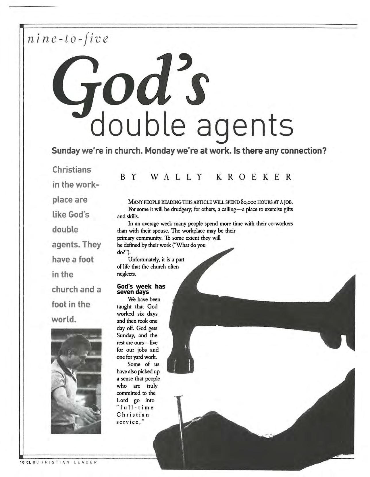 10 GOD'S DOUBLE AGENTS by Wally Kroeker Christians in the workplace are like God's double agents. They have a foot in the church and a foot in the world.