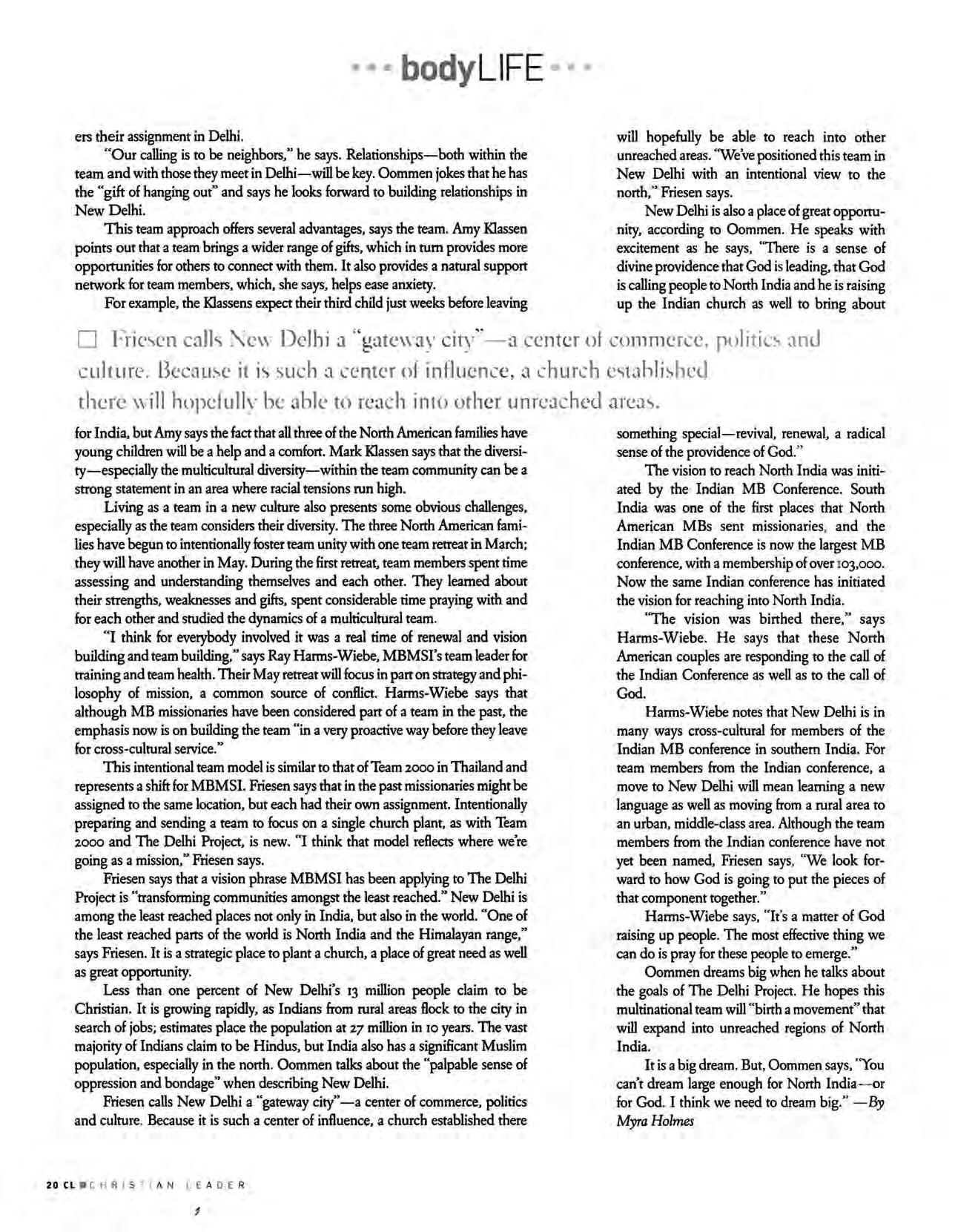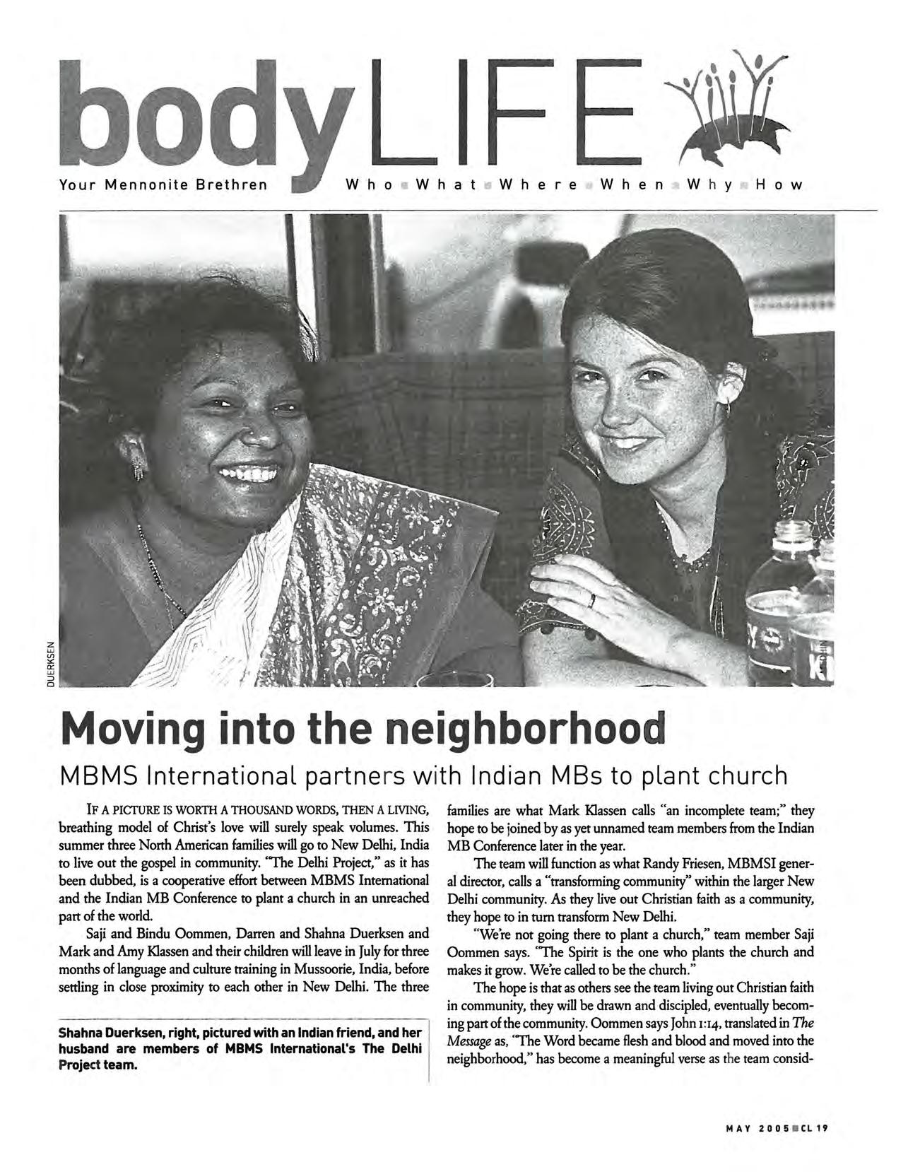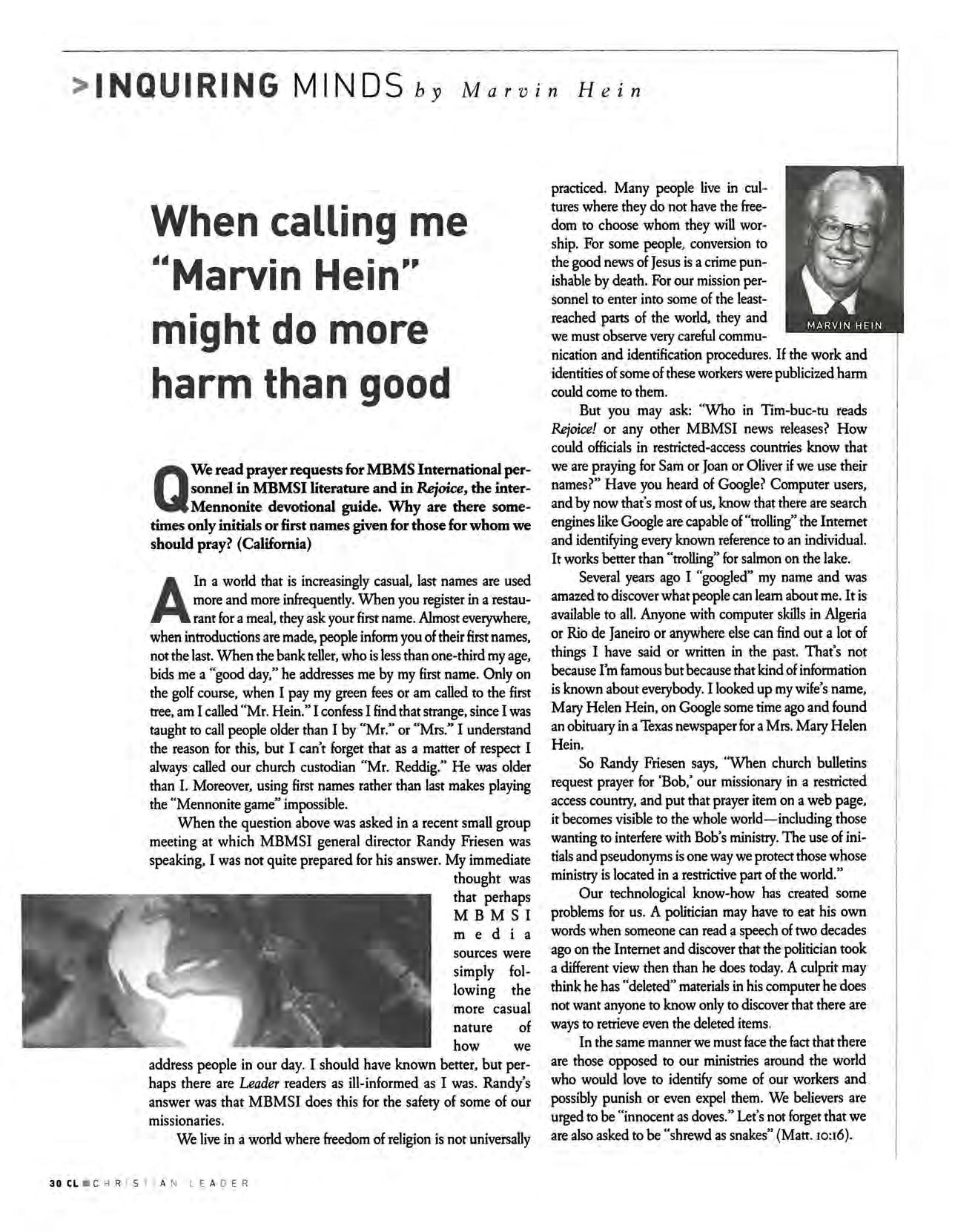 By the way. in Marvin Hein's column on page 30 you can read more about the situation Adams and other MBMS International workers living in certain parts of the world find themselves. Twice in the last month our family has heard a missionary speak about the importance of keeping hislher name confidential when mentioning them in a church bulletin or newsletter or in e-mails. It reminded me again to pray for the safety of Christian international professionals and missionaries - as well as the local believers-who live and work in restricted-access countries.