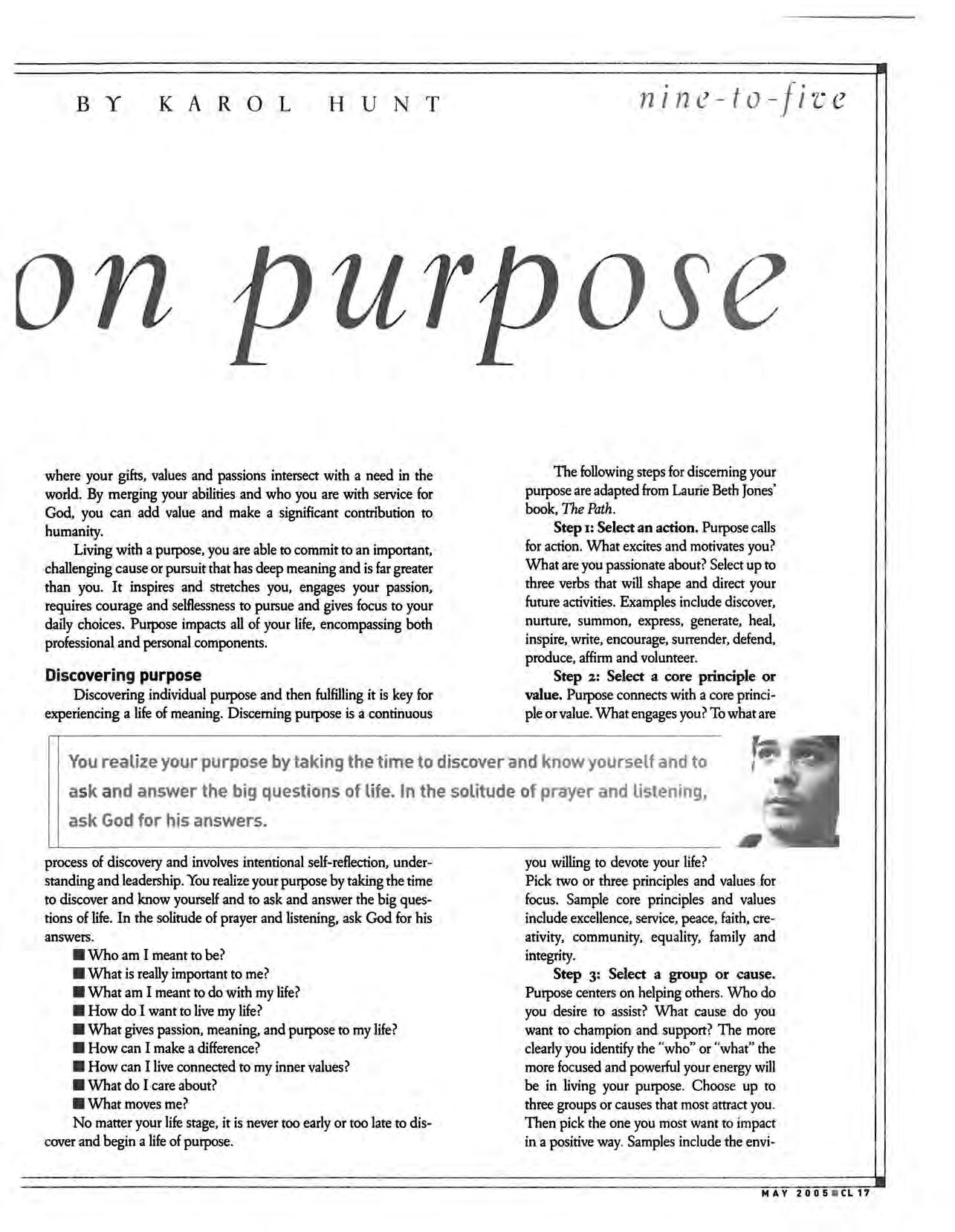 Vocational roles, financial demands, personal struggles, service expectations and family obligations clamor for our attention. In the midst of our busyness we may wonder: Do I really have a purpose?