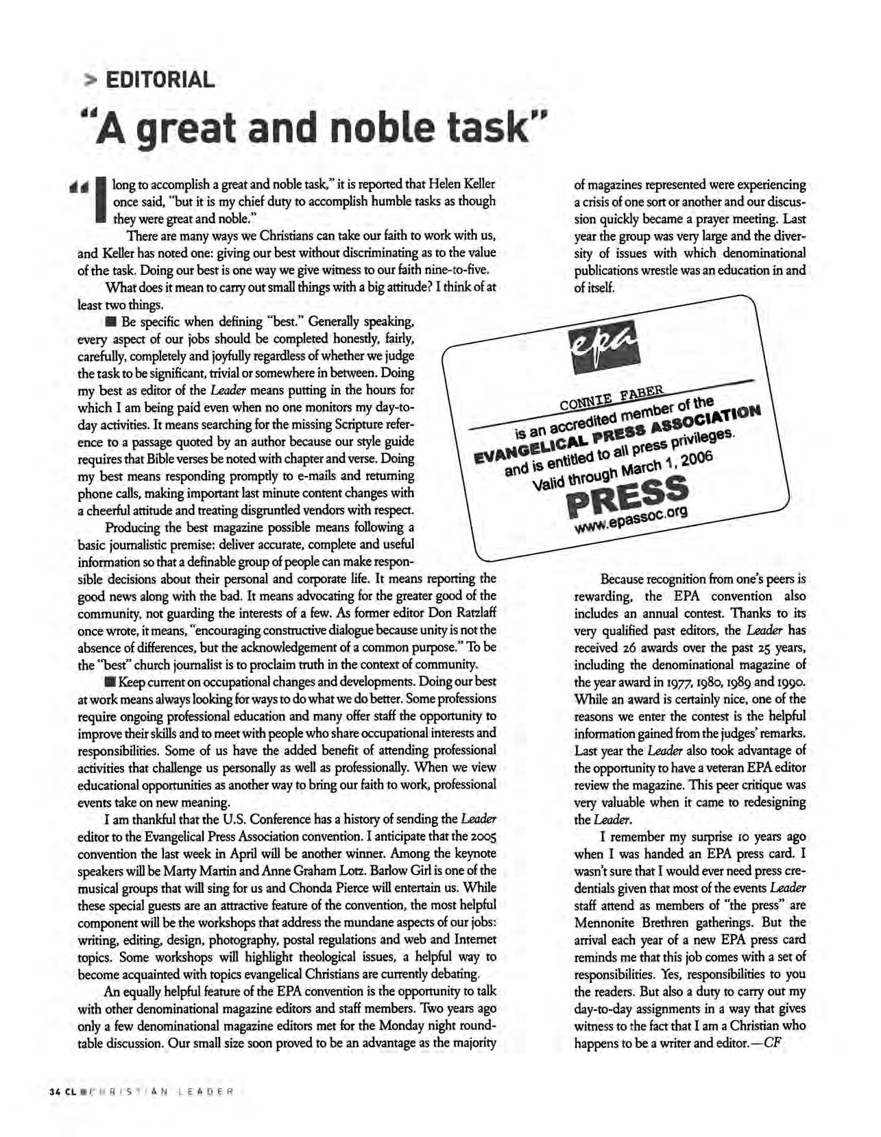 • Be specific when defining "best." Generally speaking. every aspect of our jobs should be completed honestly, fairly, carefully, completely and joyfully regardless of whether we judge the task to be significant, trivial or somewhere in between. Doing my best as editor of the Leader means putting in the hours fo r which I am being paid even when no one monitors my day-today activities. It means searching for the missing Scripture reference to a passage quoted by an author because our style guide requires that Bible verses be noted with chapter and verse. Doing my best means responding promptly to e-mails and returning phone calls, making important last minute content changes with a cheerful attitude and treating disgruntled vendQrs with respect. Producing the best magazine possible means following a basic journalistic premise: deliver accurate, complete and useful information so that a definable group of people can make responsible decisions about their personal and corporate life. It means reporting the good news along with the bad It means advocating for the greater good of the community, not guarding the interests of a few. As fortner editor Don Ratzlaff once wrote, it means, "encouraging constructive dialogue because unity is not the absence of differences, but the acknowledgement of a common purpose." To be the 'best" church journalist is to proclaim truth in the context of community.