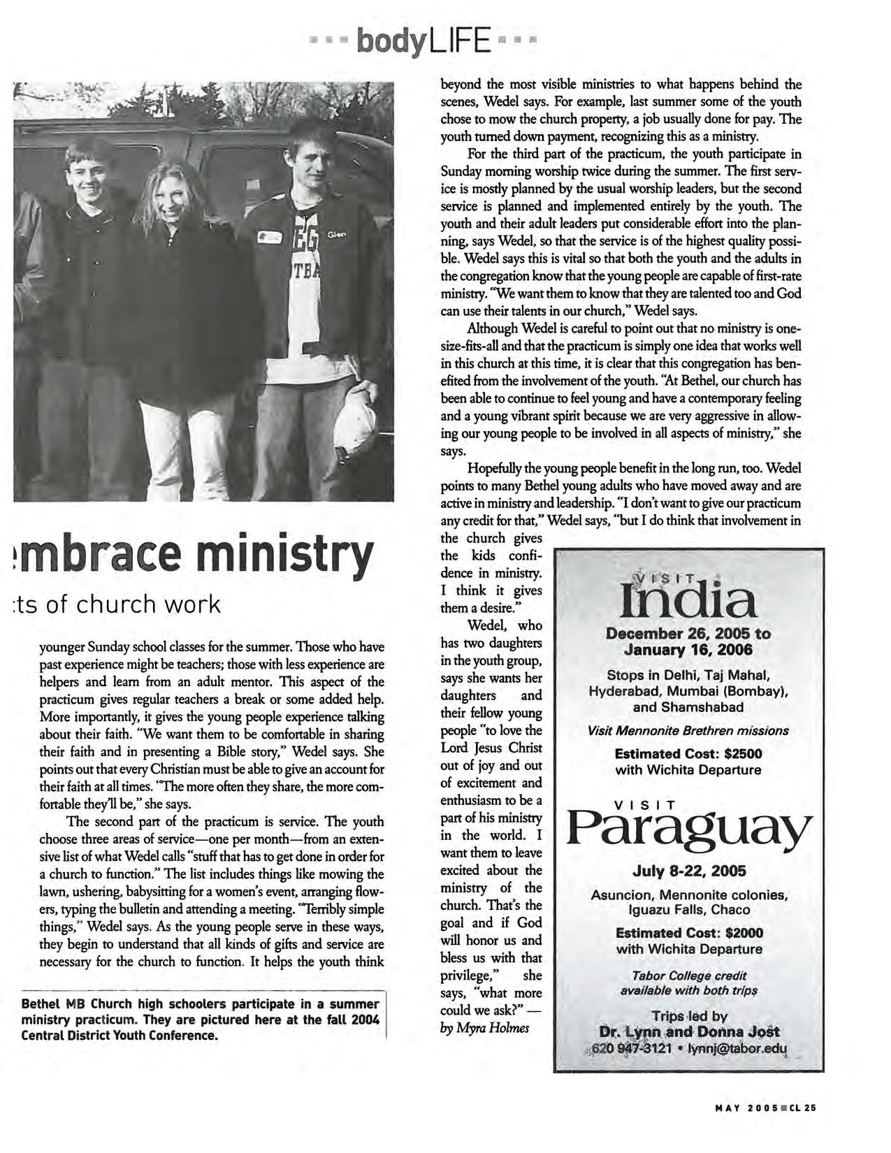 And finally, falling in the "did you know" category, did you know there is a Mennonite Nursing Association? There is and MNA is sponsoring Nurses Week May 612. Congregations are invited to honor nurses and the care they give their patie nts; resources have been supplied for worship services May 8. Given our emphasis this month on our lives Monday through Friday, it seems appropriate to mention this opportunity to recognize the valuable ministry of nurses and other medical personnel.-CF