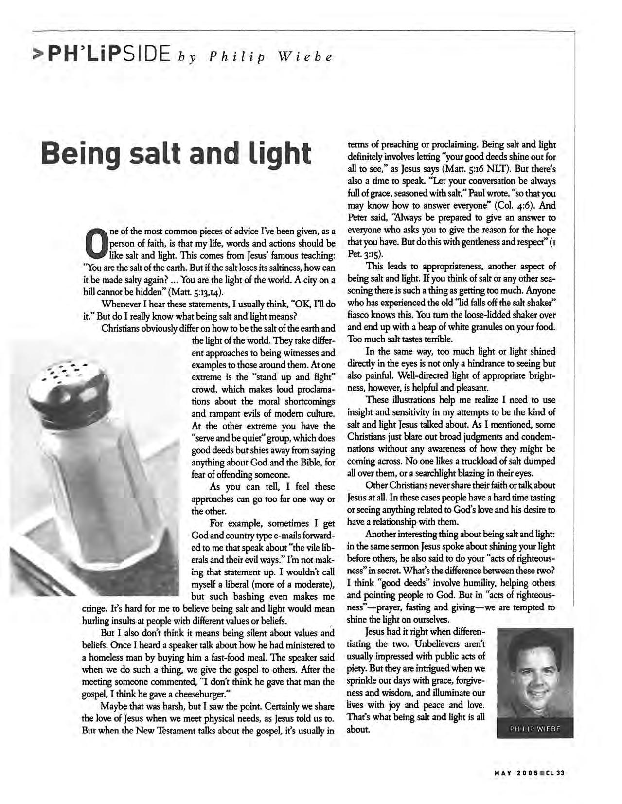This leads to appropriateness, another aspect of being salt and light. If you think of salt or any other seasoning there is such a thing as getting too much. Anyone who has experienced the old '1id falls off the salt shaker" fiasco knows this. You tum the loose-lidded shaker over and end up with a heap of white granules on your food. Too much salt tastes terrible.