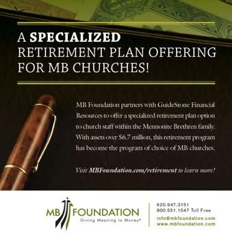 Planned Giving Advisor: MB Foundation is seeking a servant professional to assist our constituency in the Pacific District Conference with planned giving solutions such as will planning and lifetime gift plans. Send resumes to Jon C. Wiebe, MB Foundation, PO Box 220, Hillsboro, KS 67063 or jwiebe@mbfoundation.com. A full job description is available at www.mbfoundation.com/employment.