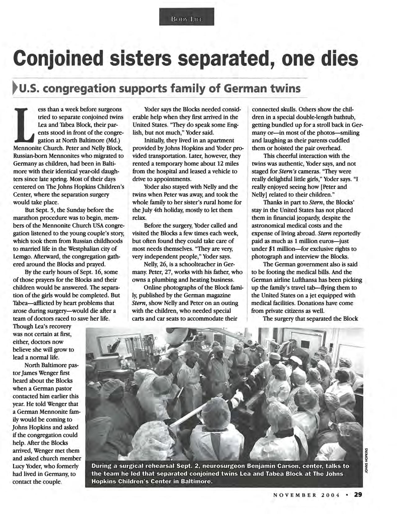 The theme of God at work in our world is also reflected in the news section. Zoar MB Church of Inman , Kan ., one of the oldest Krimmer MB Churches, celebrated its 125th anniversary this fall and we review their ministry. From Kansas we go to Sao Paulo, Brazil, where a recent fire near the MB church has brought ministry opportunities along with threats of violence This summer we introduced readers to a German Mennonite couple who refused to abort their conjoined twins. While their story doesn't have a fairytale ending, we none the less see God's hand at work in their experience . Readers interested in assisting victims of this fall 's remarkable hurricane season will find an update from Mennonite agencies on relief efforts May these stories inspire you to give witness to God's work in the world -CF