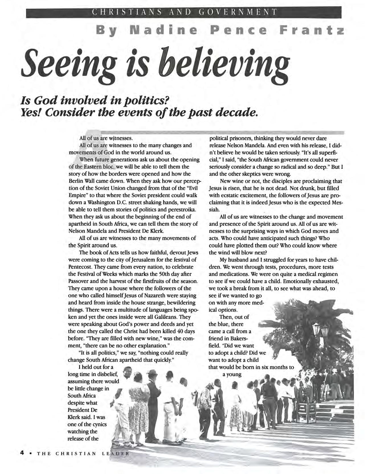 These and other international events prompted us to focus this issue of the Leader on national politics. We begin with a sermon preached 10 years ago during a time of great change in the international political climate. Author Nadine Pence Frantz reminds us that God is involved in politics and that we are witnesses to his work. Her message is paired with reflections from a Mennonite Central Committee worker living in South Africa at the time of that coyntry's first free election, an event that Frantz anticipates in her sermon