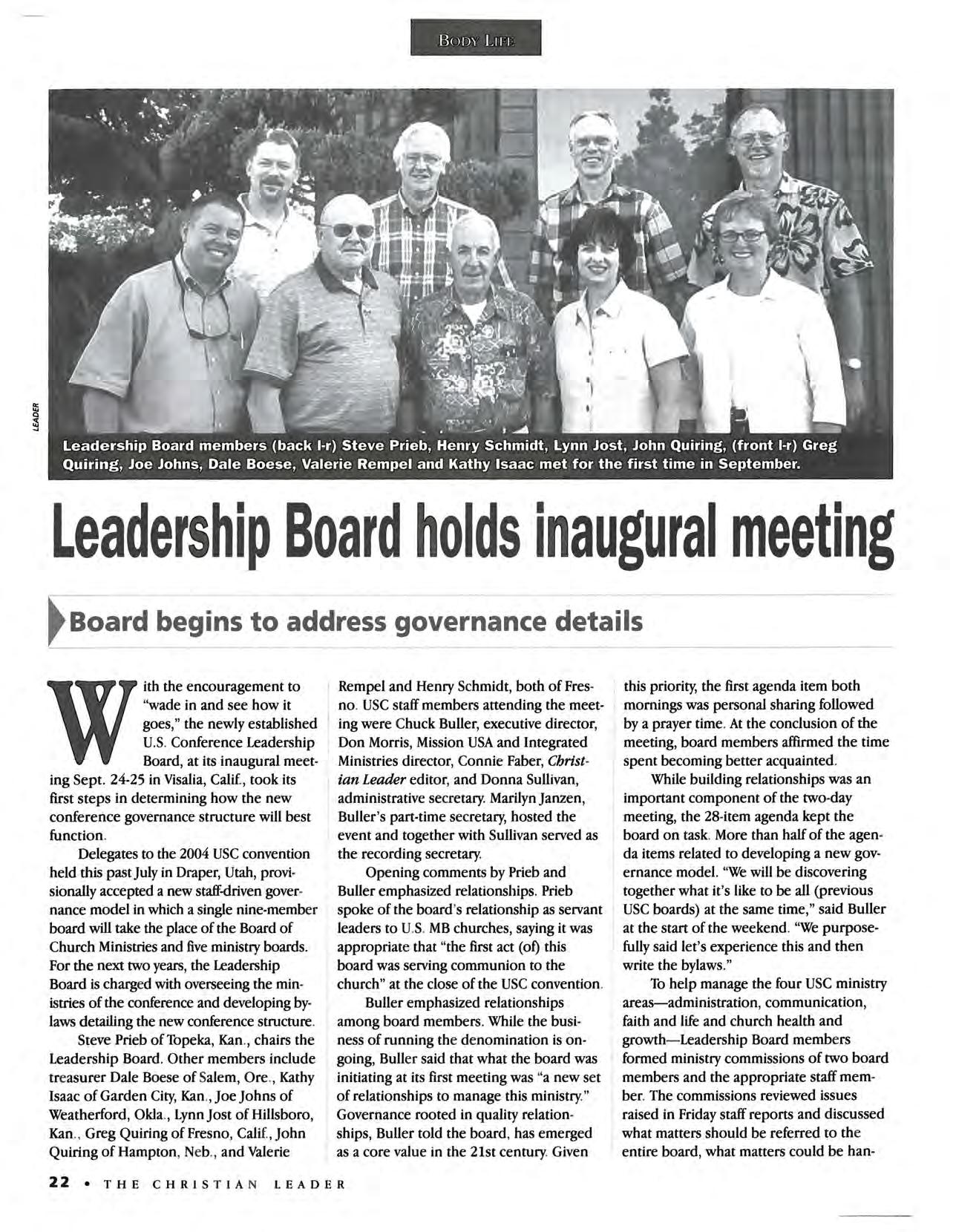 Governance has also been a recent priority among u.S. Conference leaders In late September the new USC Leadership Board met together for the first time. A report of that event is included in the news section along with an interview with Randy Friesen, newly appointed MBMS International general director