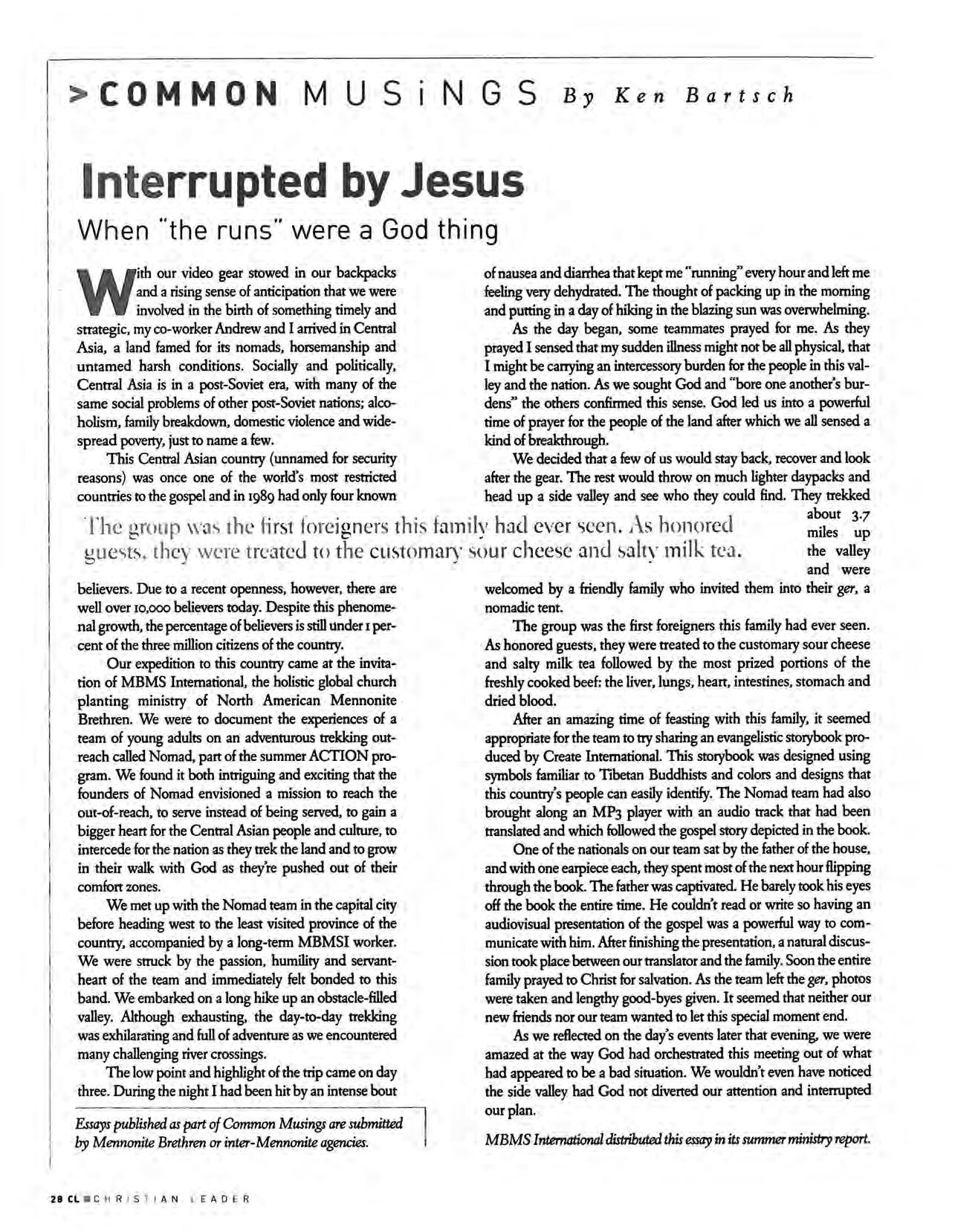 I have the privilege of serving with an amazing global mission team with many examples of "risk-taking obedience" to Jesus, our leader. One of our summer ACTION teams recently spent six weeks serving among the nomads of Central Asia (see Common Musings essay, page 28). These young people consider following Jesus, regardless of the conditions, a supreme privilege.