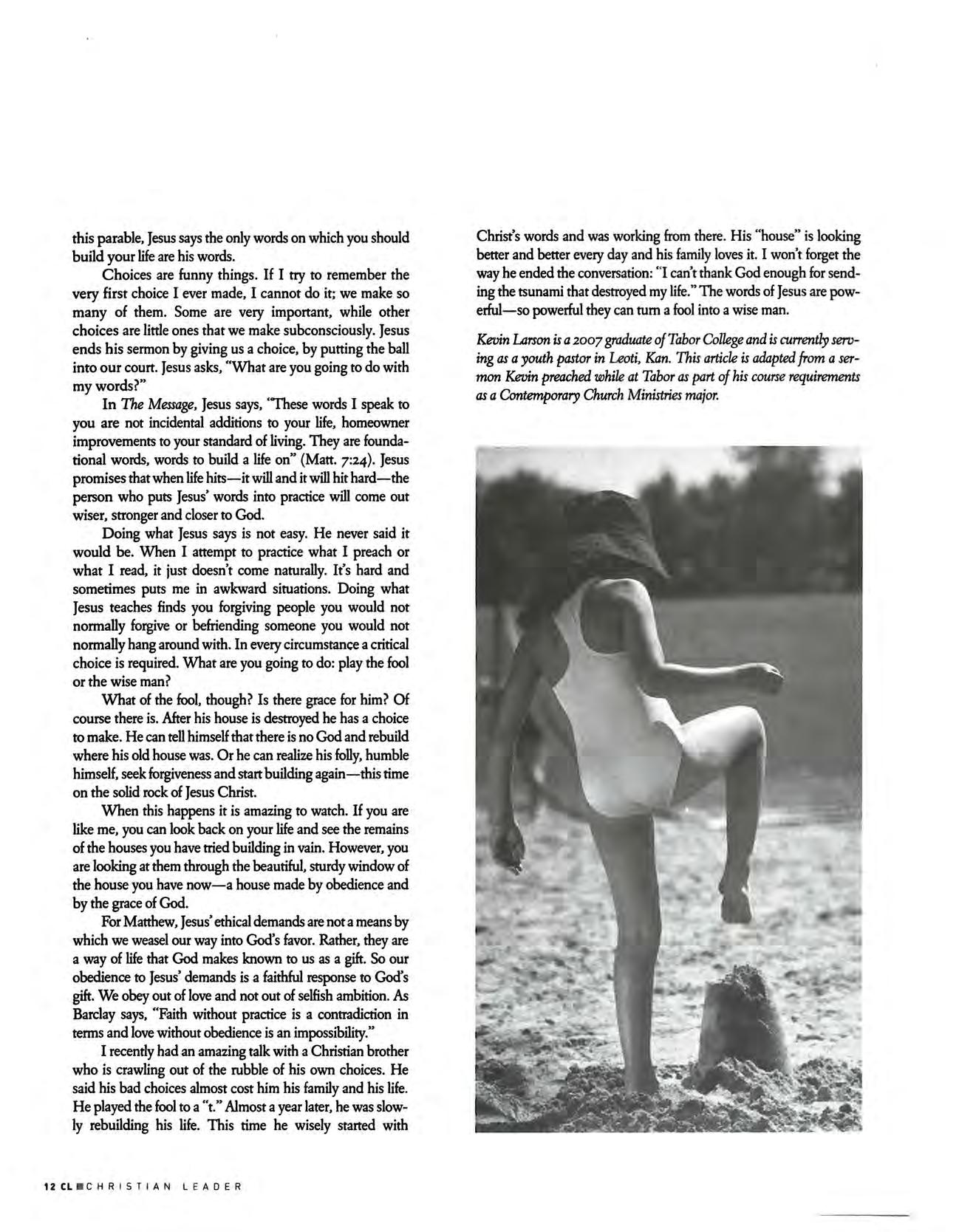 foolish man chose an easy building site without considering the consequences of his choice. Meanwhile, the man who chose his foundation with care is not exempt from the storm, but his building stands firm because of its foundation.