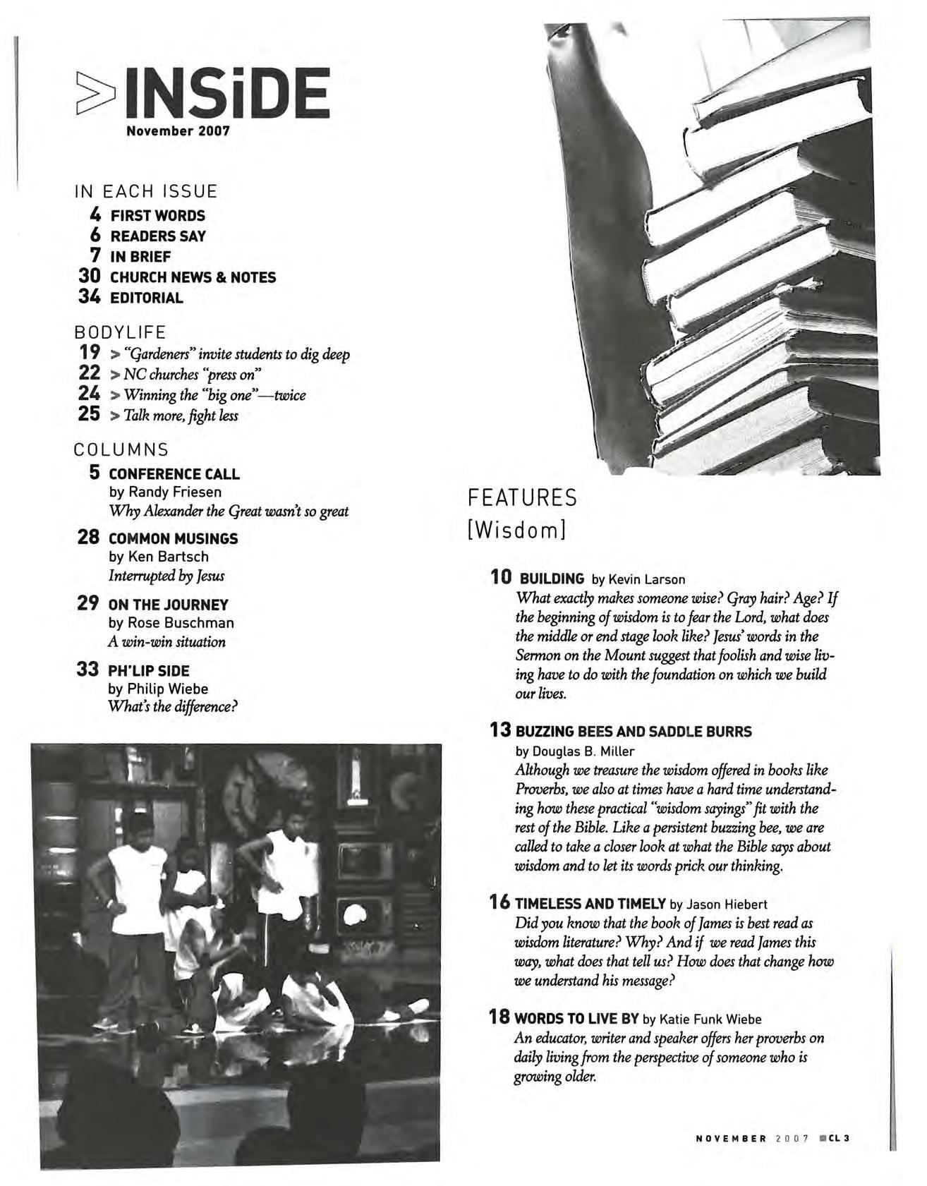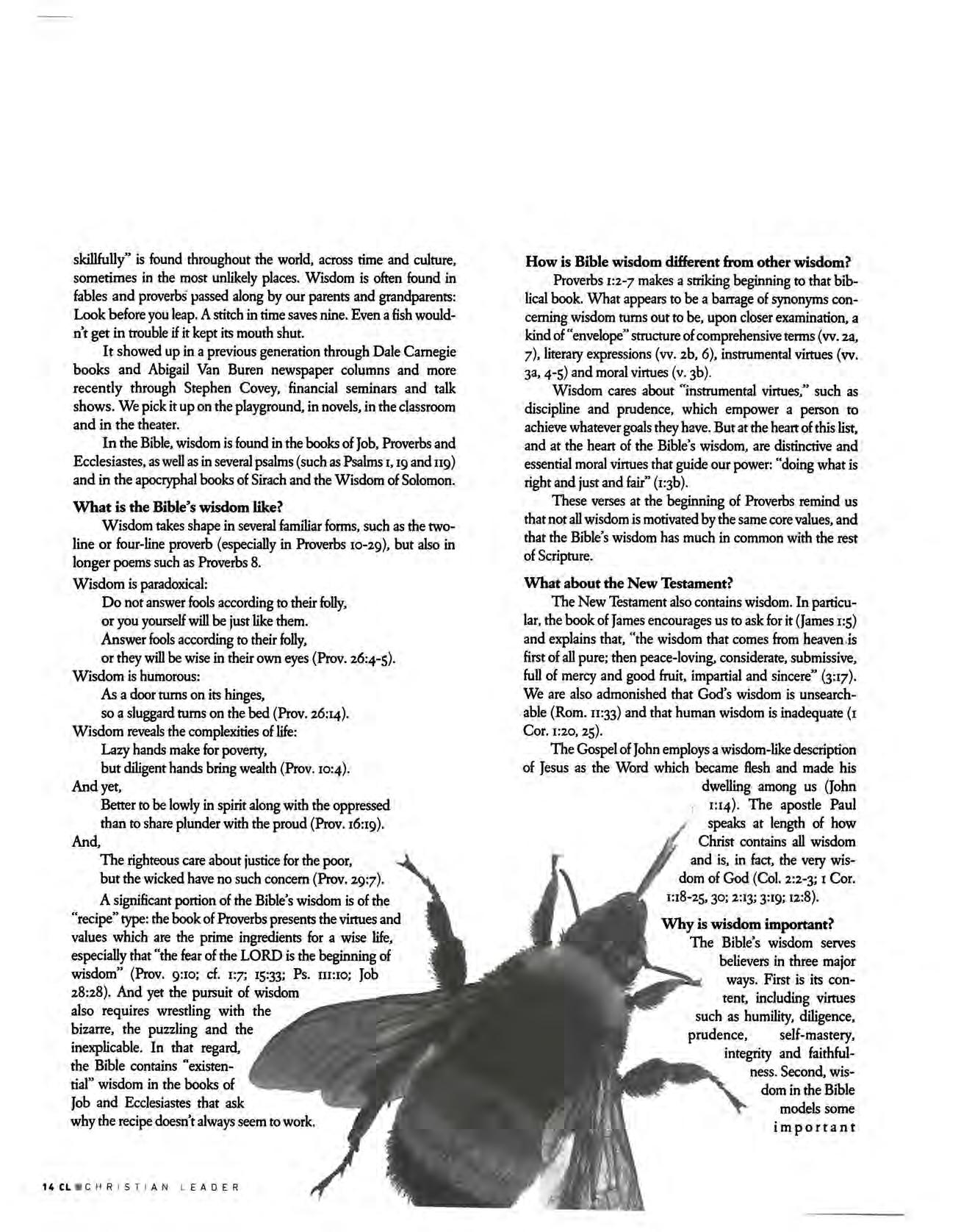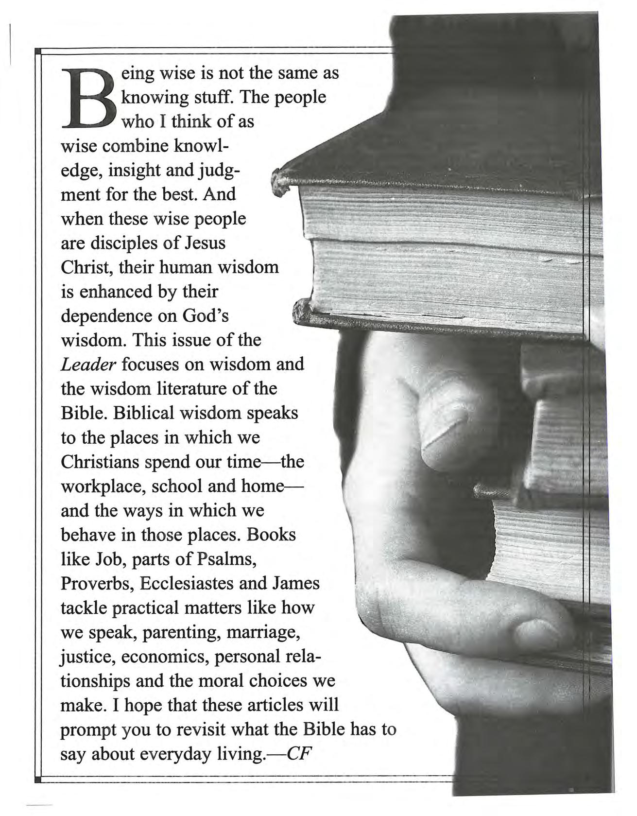 Being wise is not the same as knowing stuff. The people who I think of as wise combine knowledge, insight and judgment for the best. And when these wise people are disciples of Jesus Christ, their human wisdom is enhanced by their dependence on God's wisdom. This issue of the Leader focuses on wisdom and the wisdom literature of the Bible. Biblical wisdom speaks to the places in which we Christians spend our time-the workplace, school and homeand the ways in which we behave in those places. Books like Job, parts of Psalms, Proverbs, Ecclesiastes and James tackle practical matters like how we speak, parenting, marriage, justice, economics, personal relationships and the moral choices we make. I hope that these articles will prompt you to revisit what the Bible has t o say about everyday living.-CF